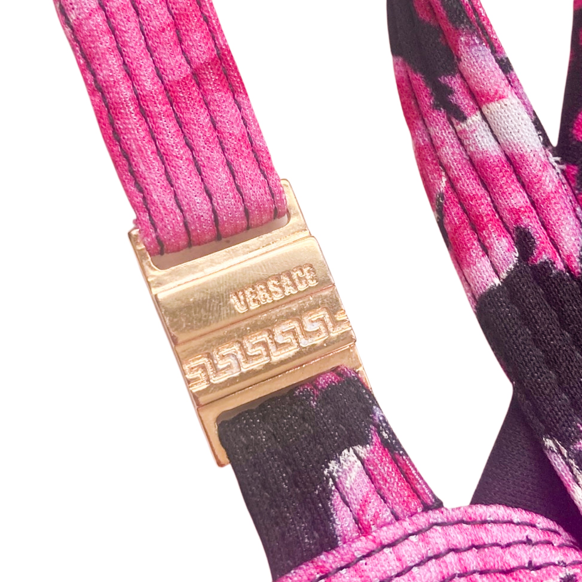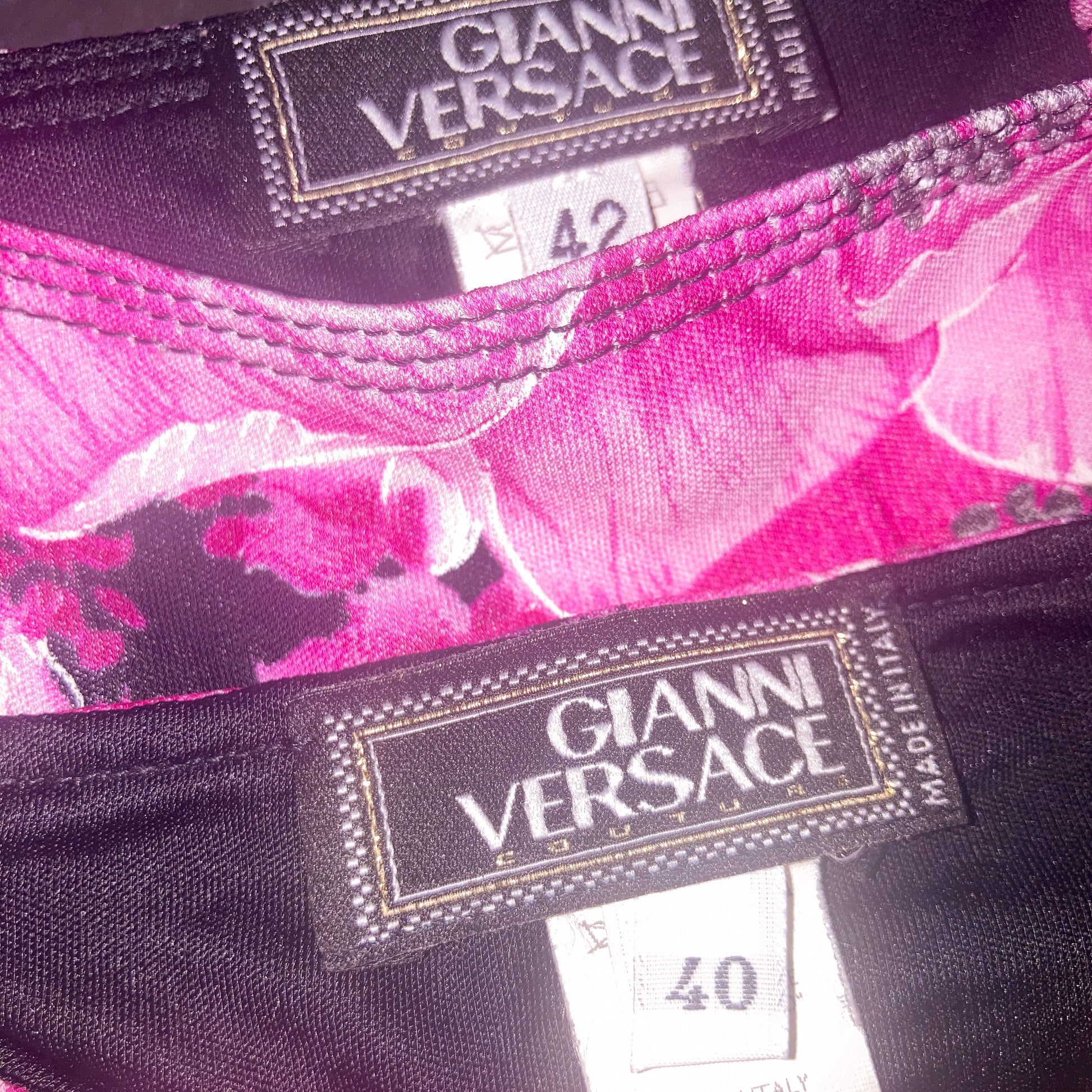 From the couture line of Gianni Versace (by Donatella) of Fall Winter 2001, this stretchy set is composed of a midi skirt & a cami top. Pink floral print all over & signed hardware on the back of the top. Very Flattering cut. The skirt can be worn as a bustier dress for S sizing (C cups Max). This print was seen in green on the runway & in purple on Serena Williams at The 10th Annual ESPY Awards.