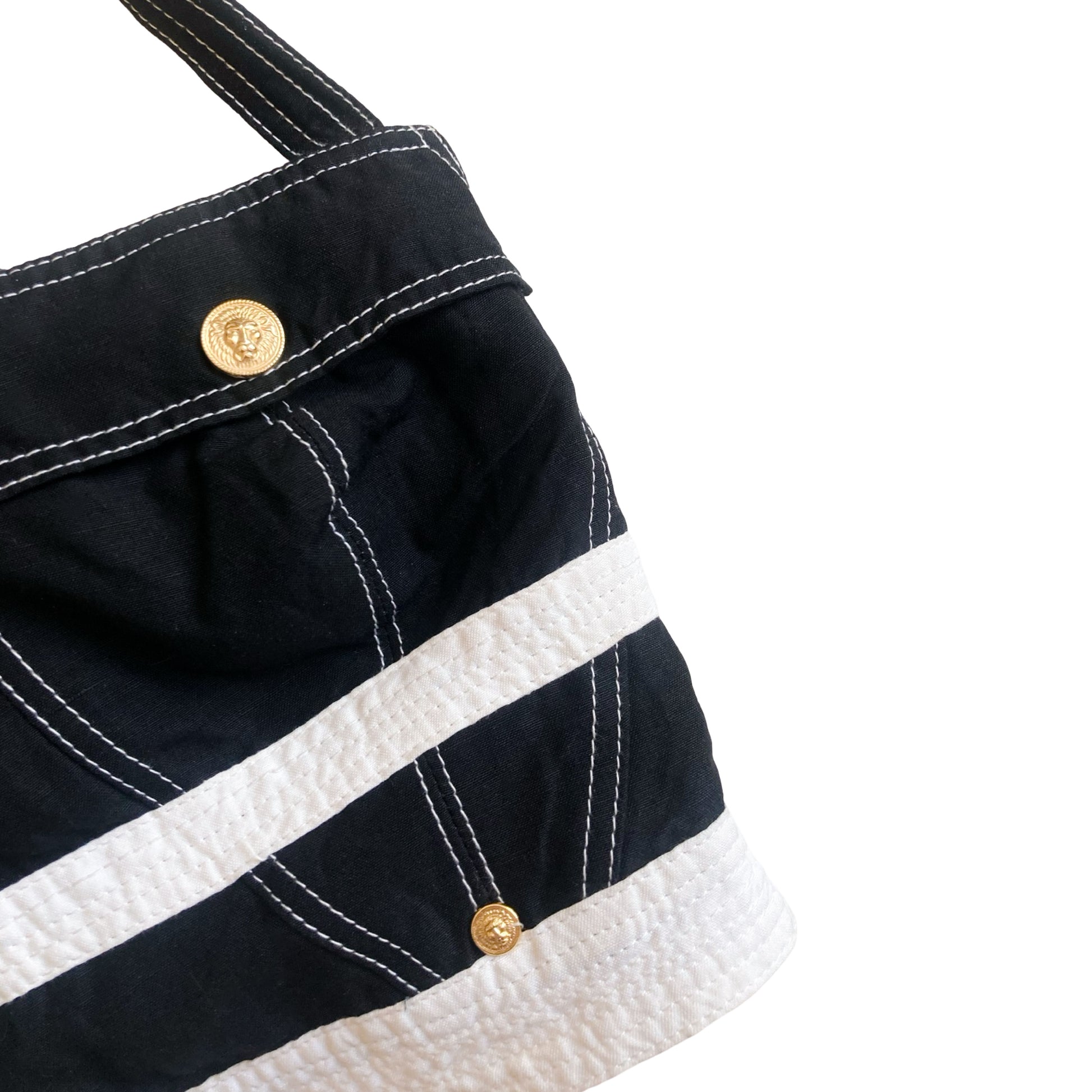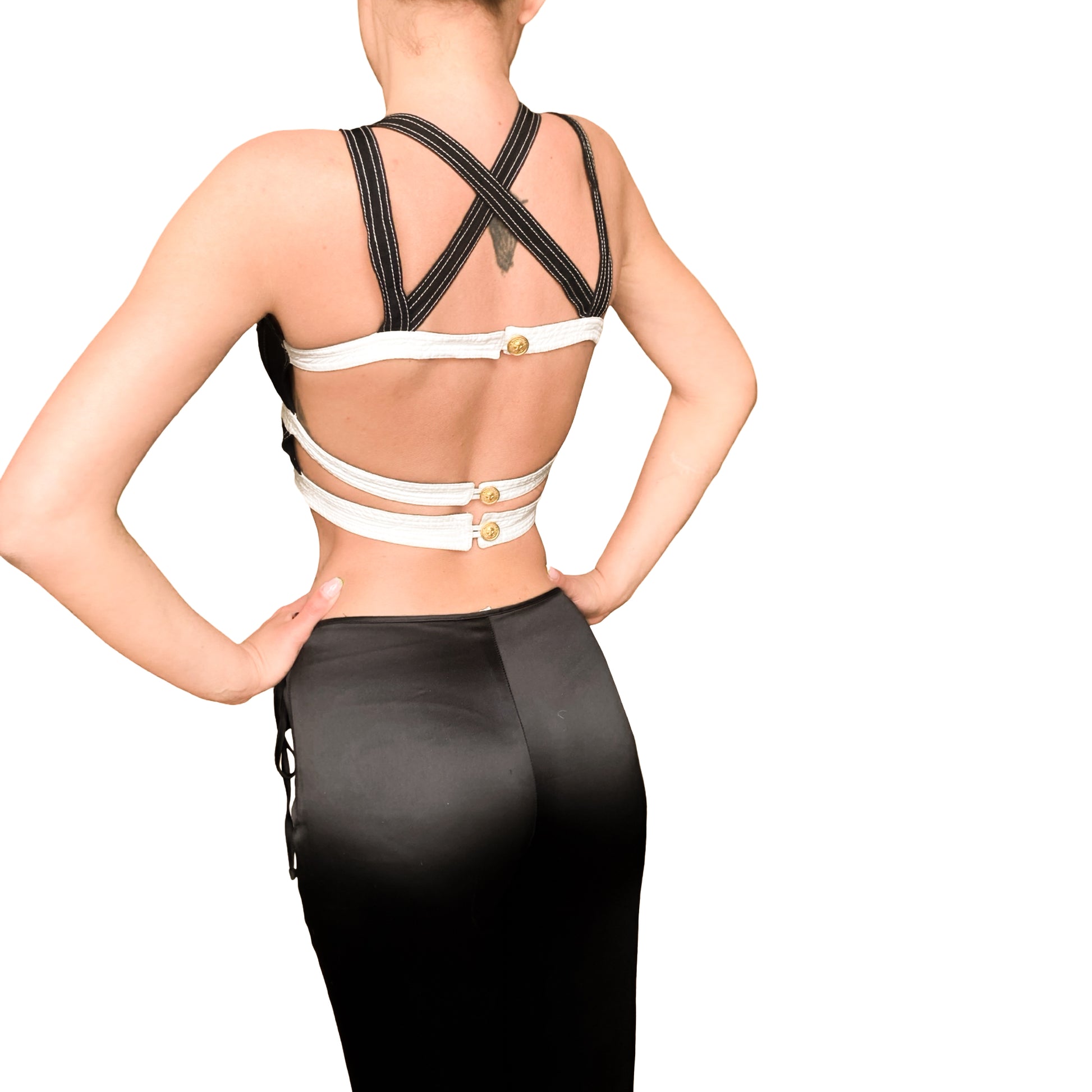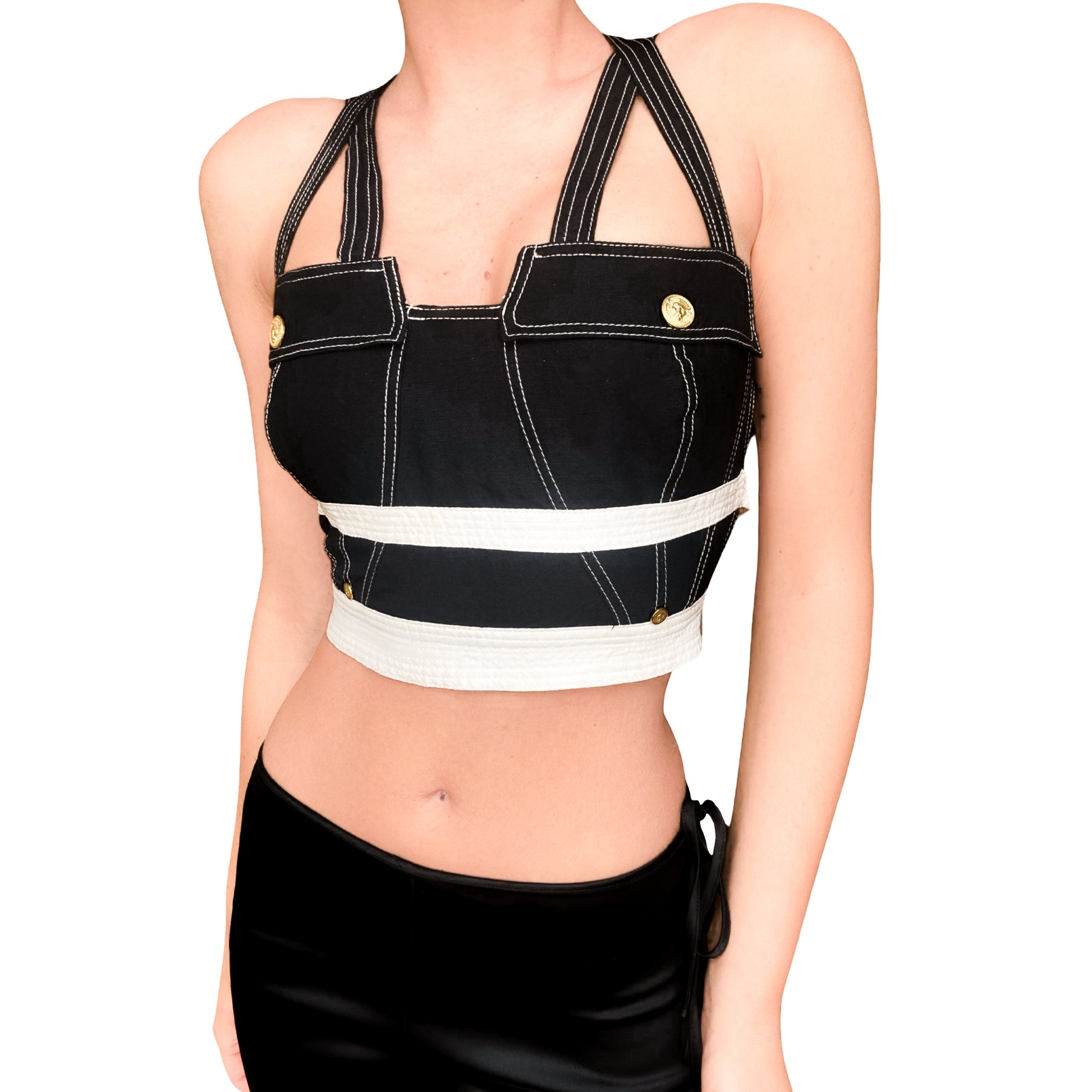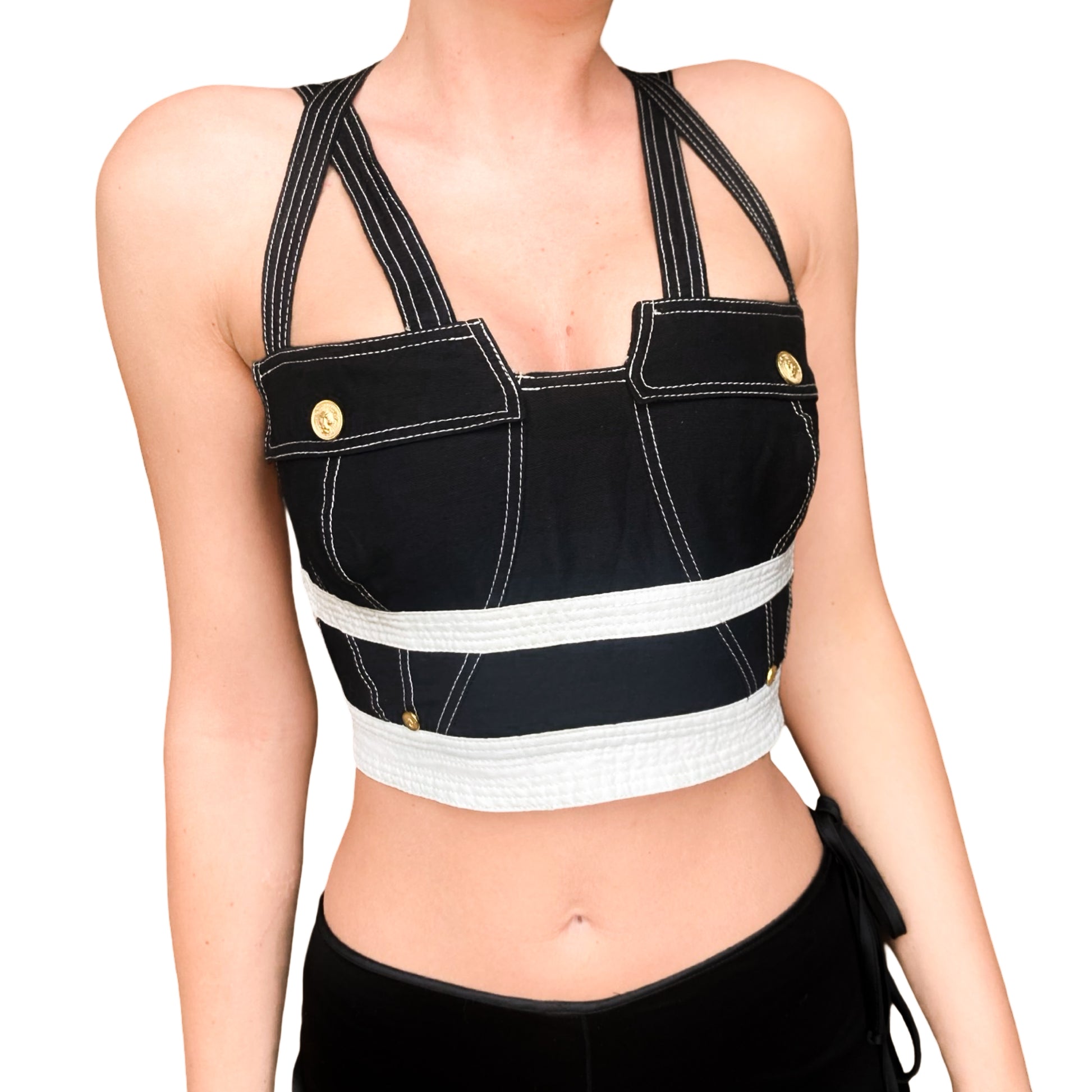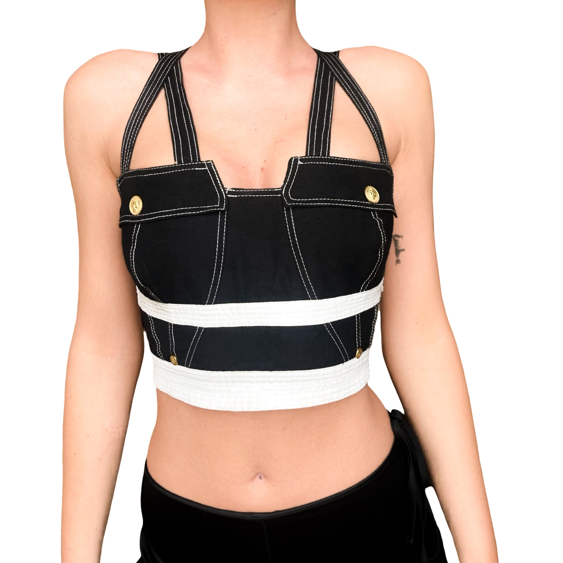 This bustier from Gianni Versace's most rare and iconic Fall/Winter 1992 S&M collection under the Versus line is a vintage masterpiece. Featuring a striking black and white color with contrasting stitches, it showcases a bondage-inspired design with faux buttoned pockets on the front panel and a criss-crossed straps bare-back . Adorned with gold hardware , including the signature Medusa emblem, this piece is one of the rarest on the vintage market.