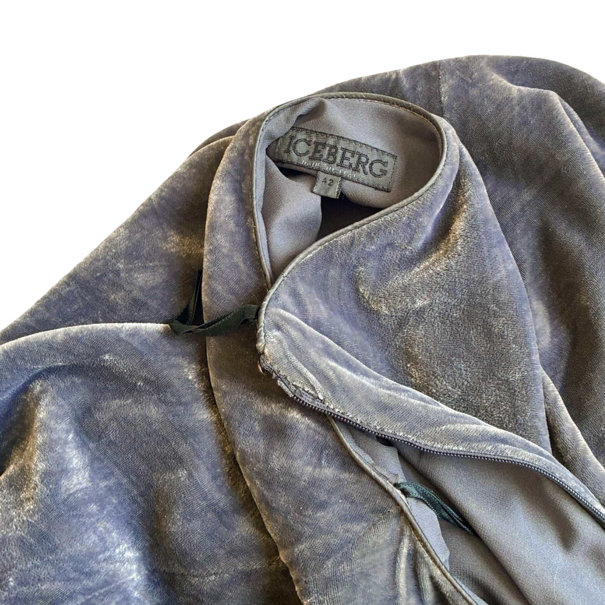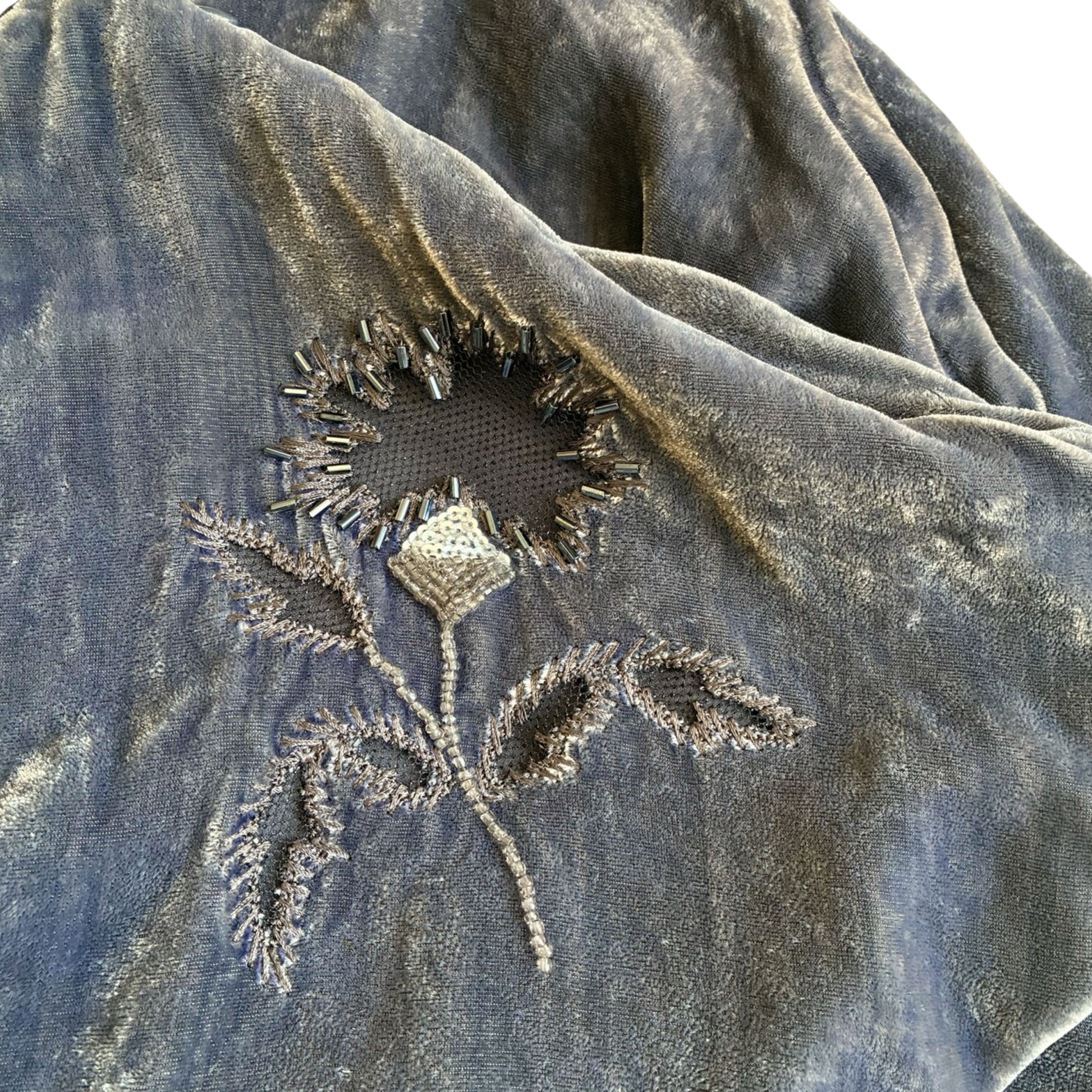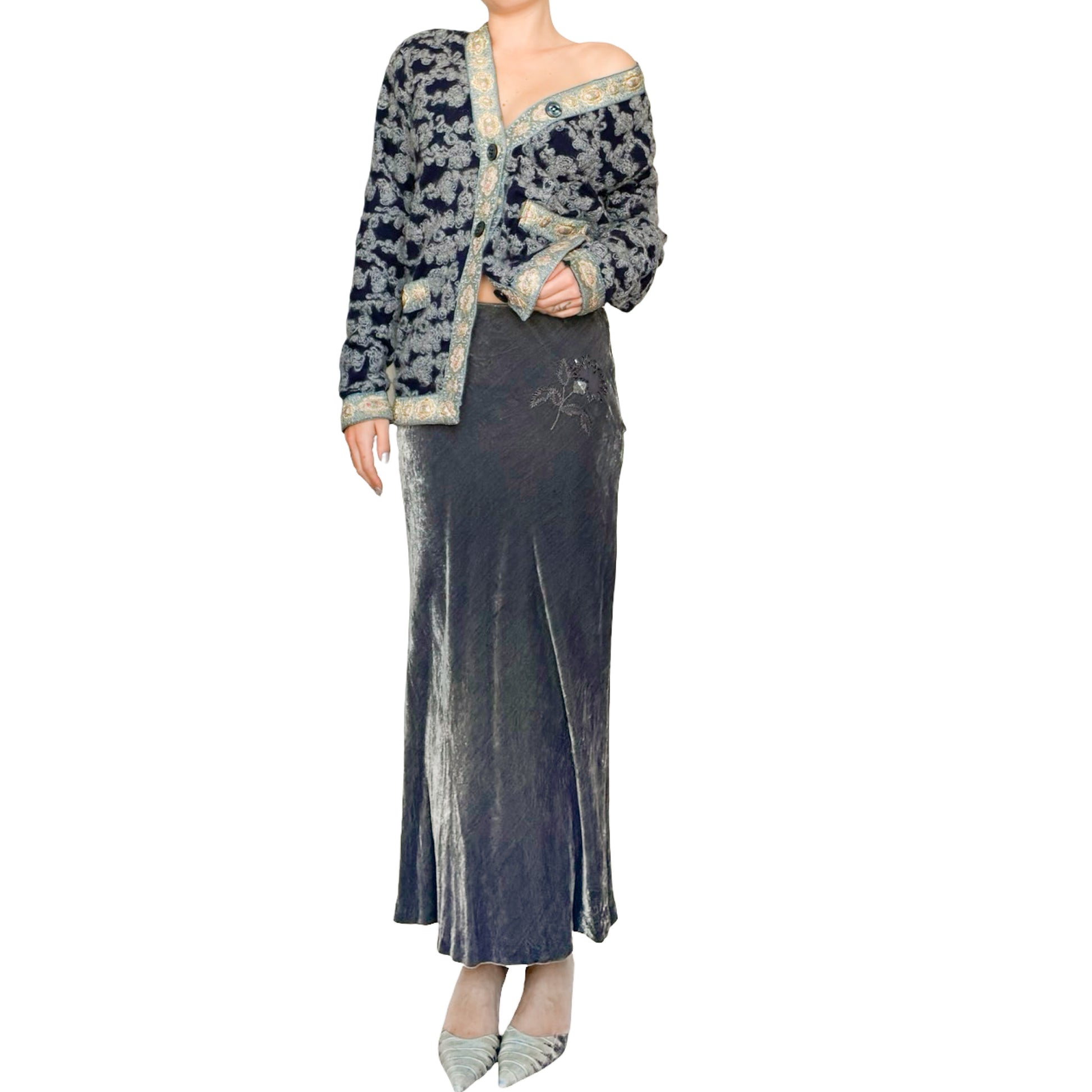 Crushed velvet with a shifting tone that moves from blue to green with bronze highlights depending on the light. The hip is finished with the same floral beading and metallic fringed embroidery seen in the Fall 1998 campaign and runway looks. Long straight cut, fully lined, with an invisible side zip.