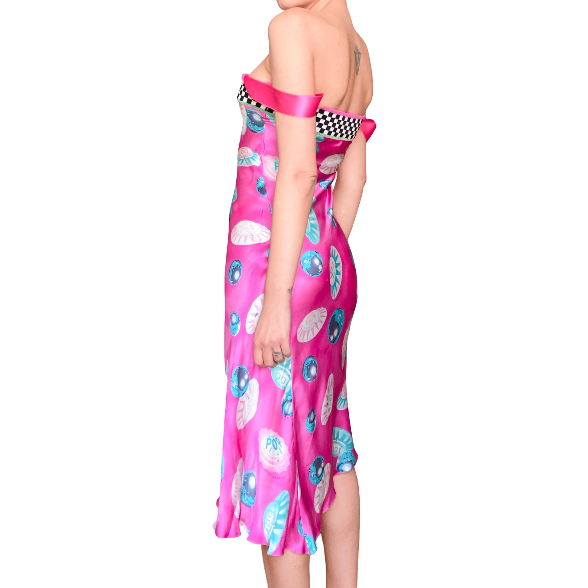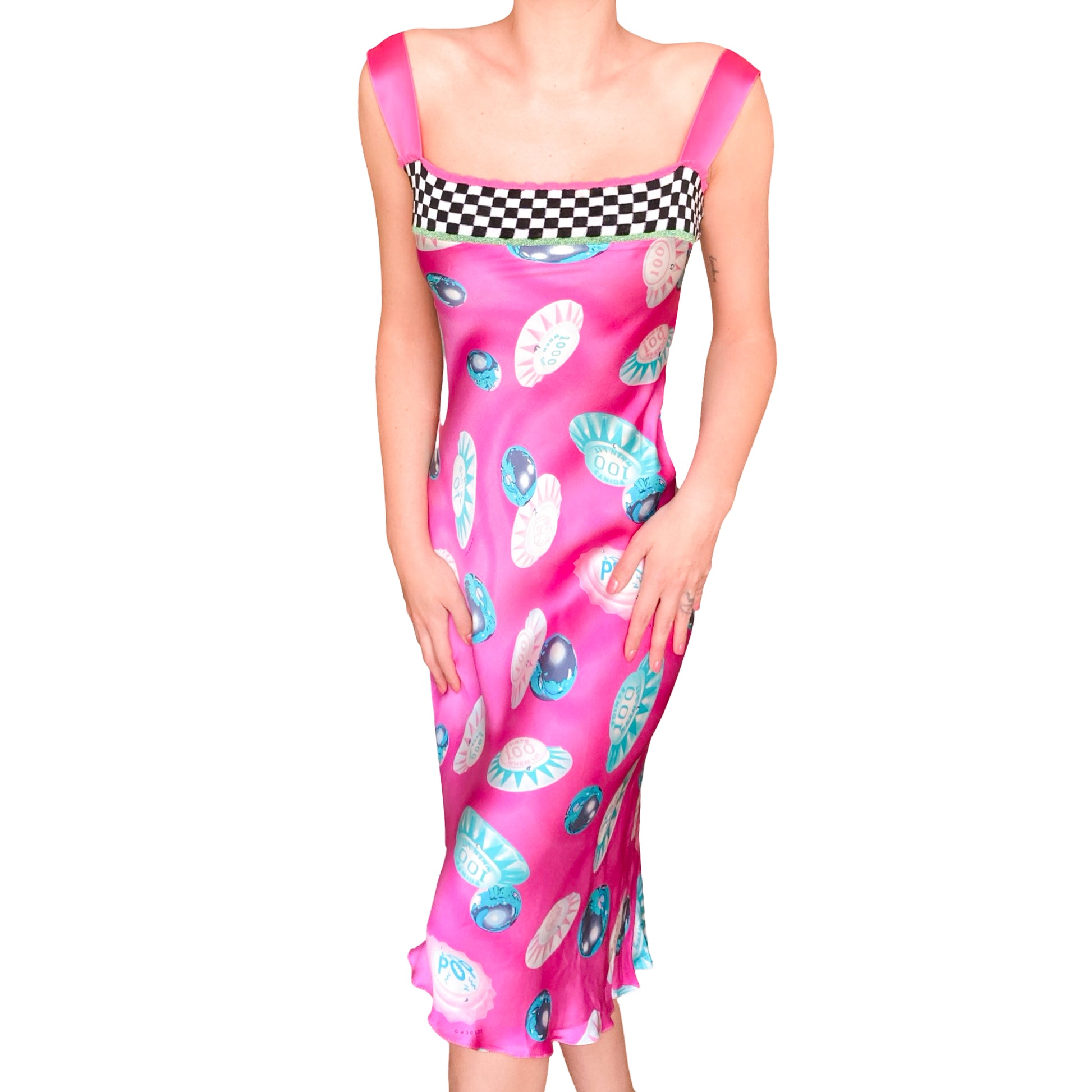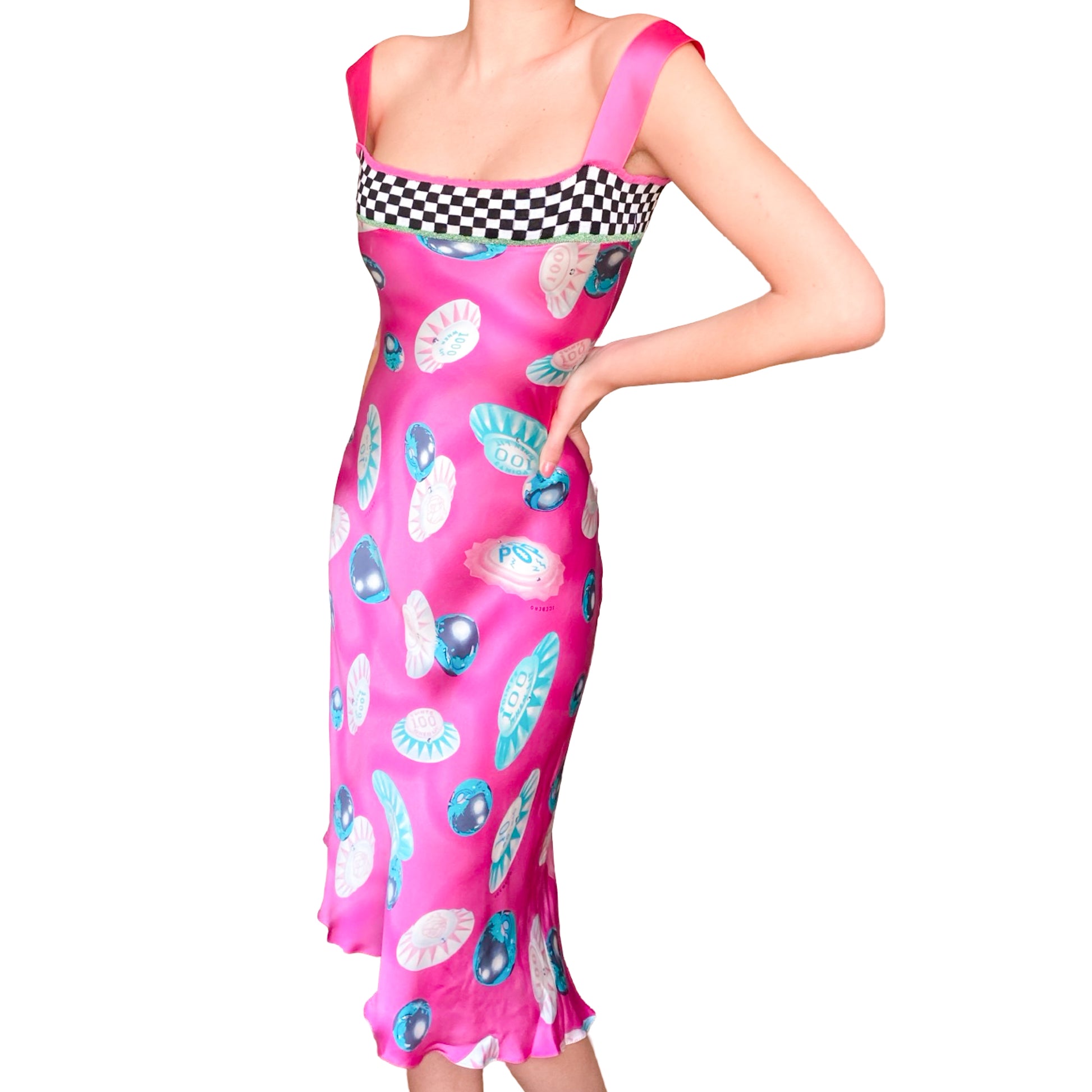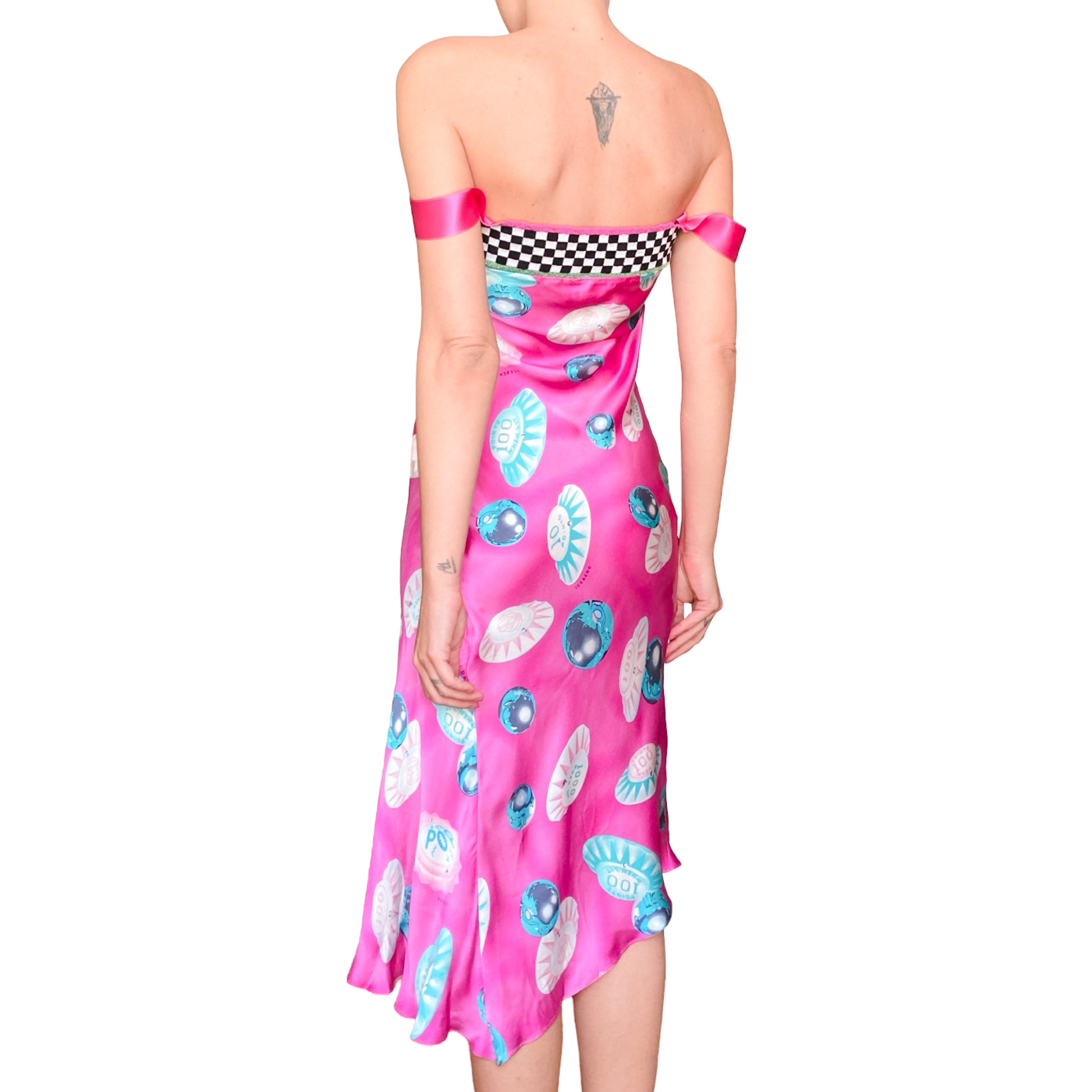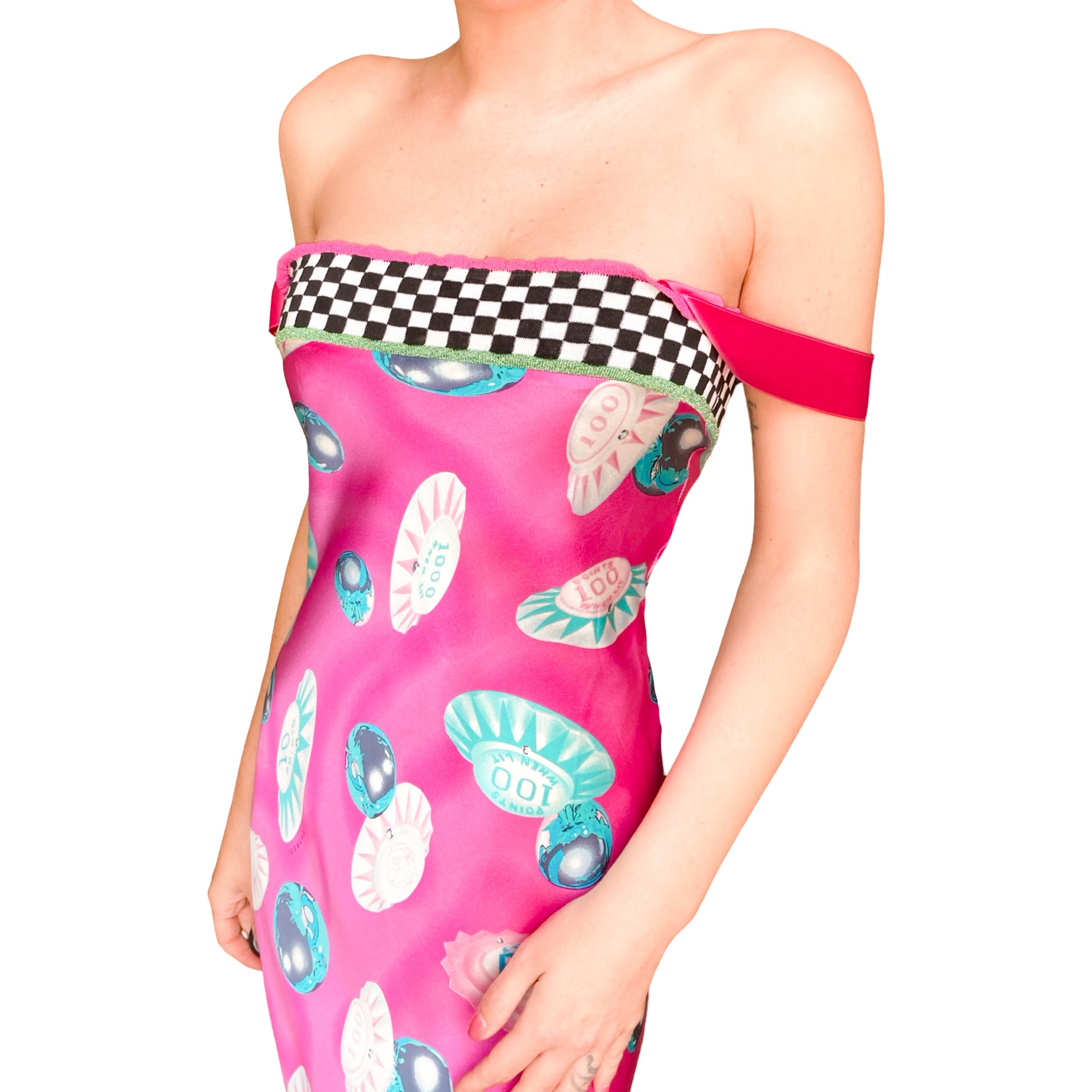 Iconic bustier dress with fun UVO / pinball machine print on a pink background all made in silk embellished with knit checkerboard racing pattern detail. Similar version worn by Pamela Anderson & Paris Hilton on the official ad campaign of the Spring Summer 2001 collection.