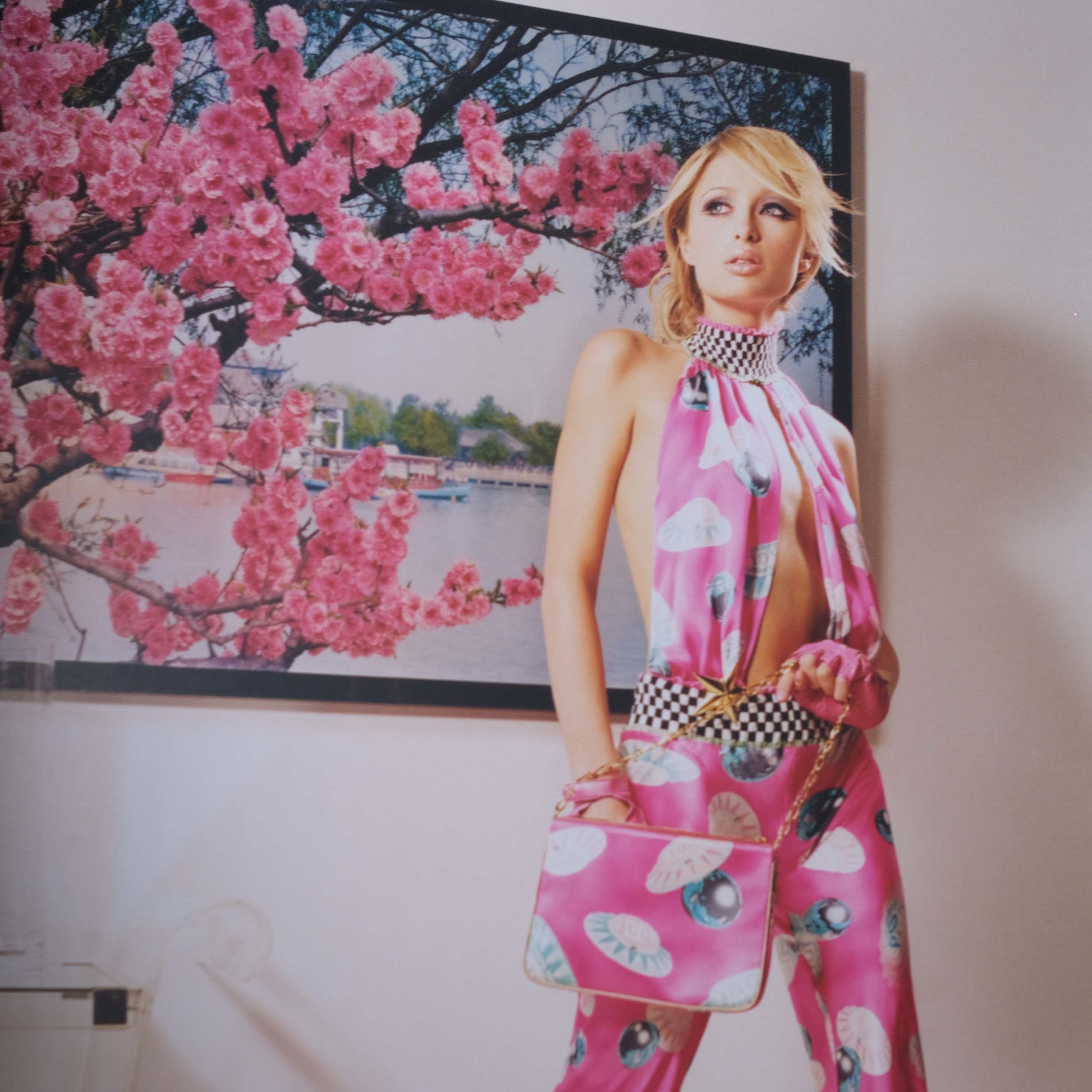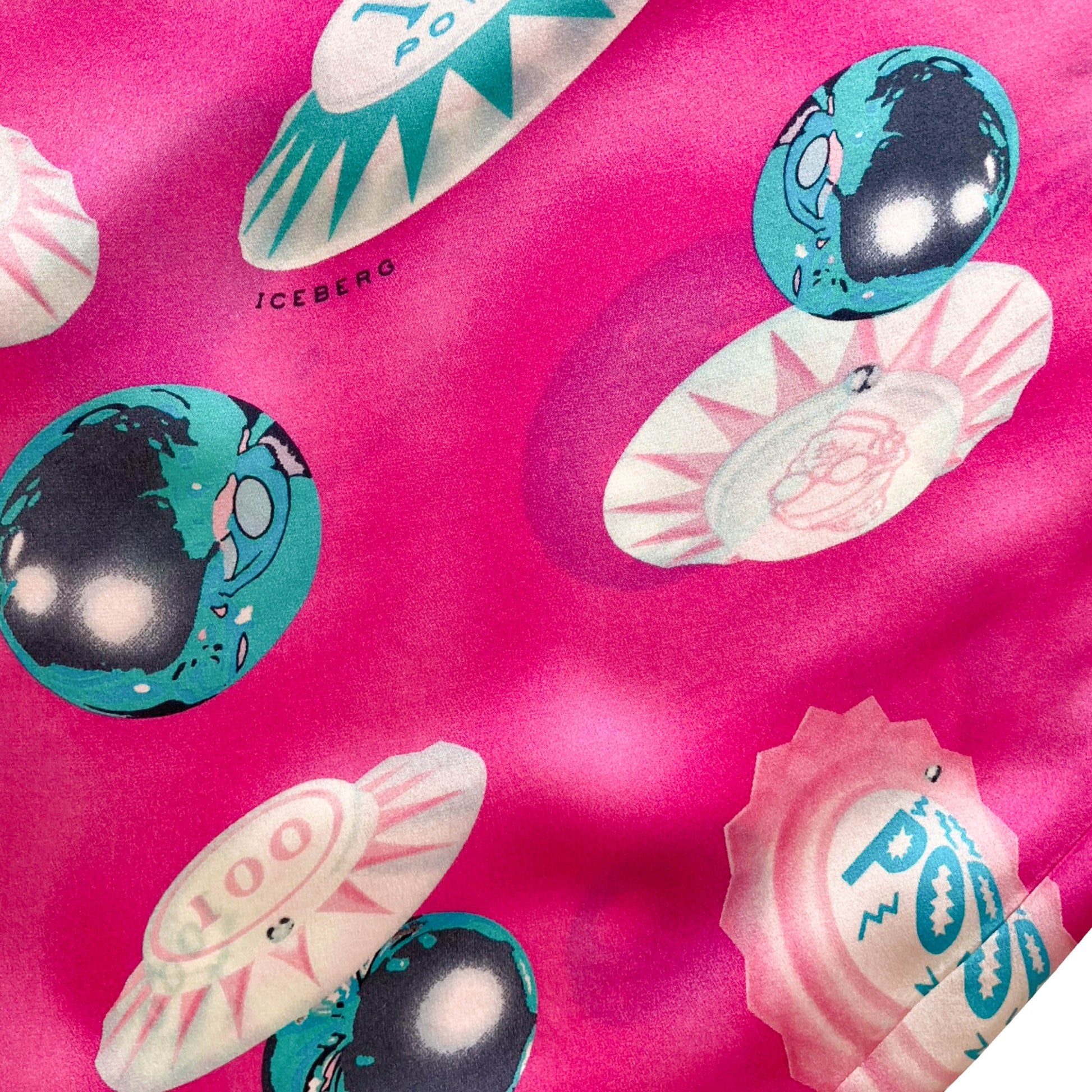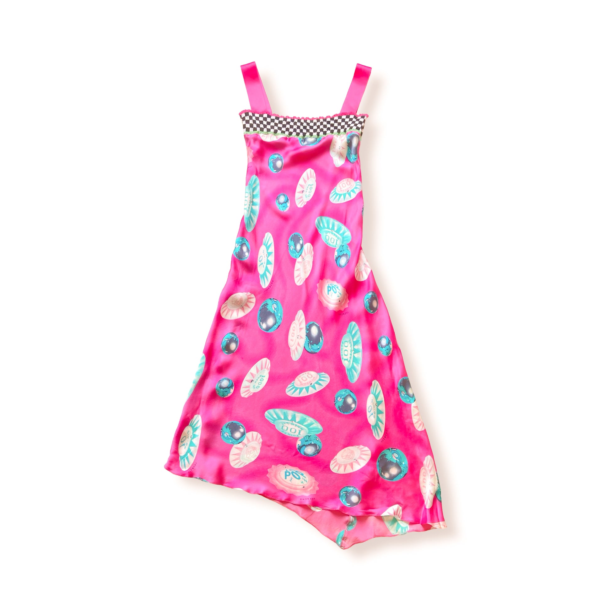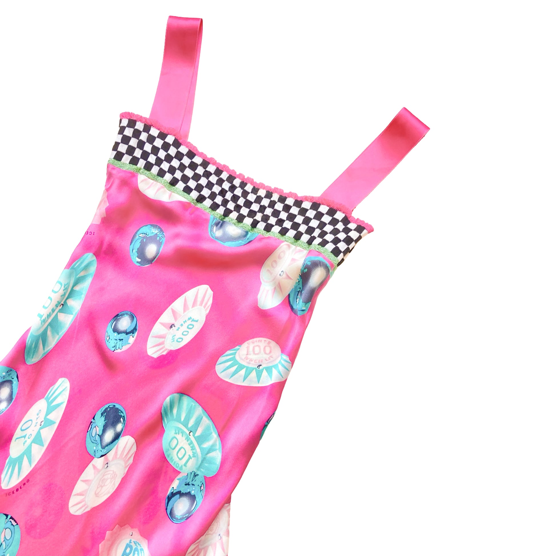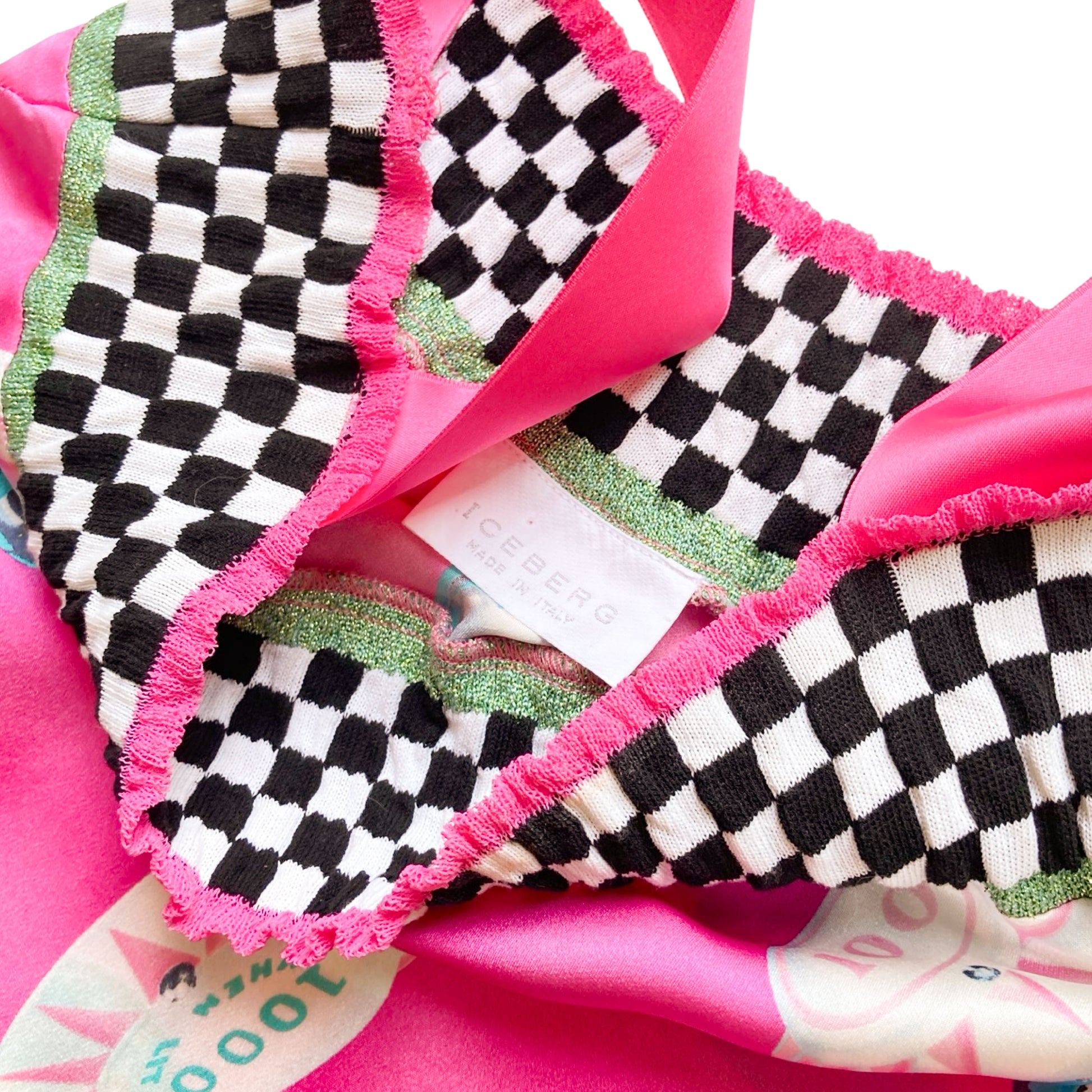 Iconic bustier dress with fun UVO / pinball machine print on a pink background all made in silk embellished with knit checkerboard racing pattern detail. Similar version worn by Pamela Anderson & Paris Hilton on the official ad campaign of the Spring Summer 2001 collection.