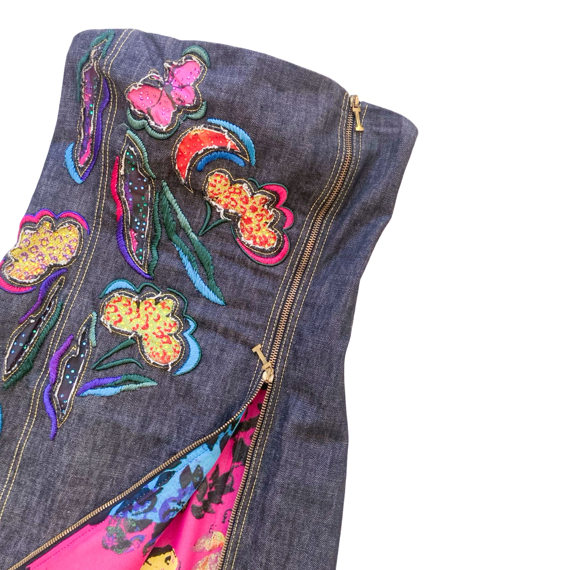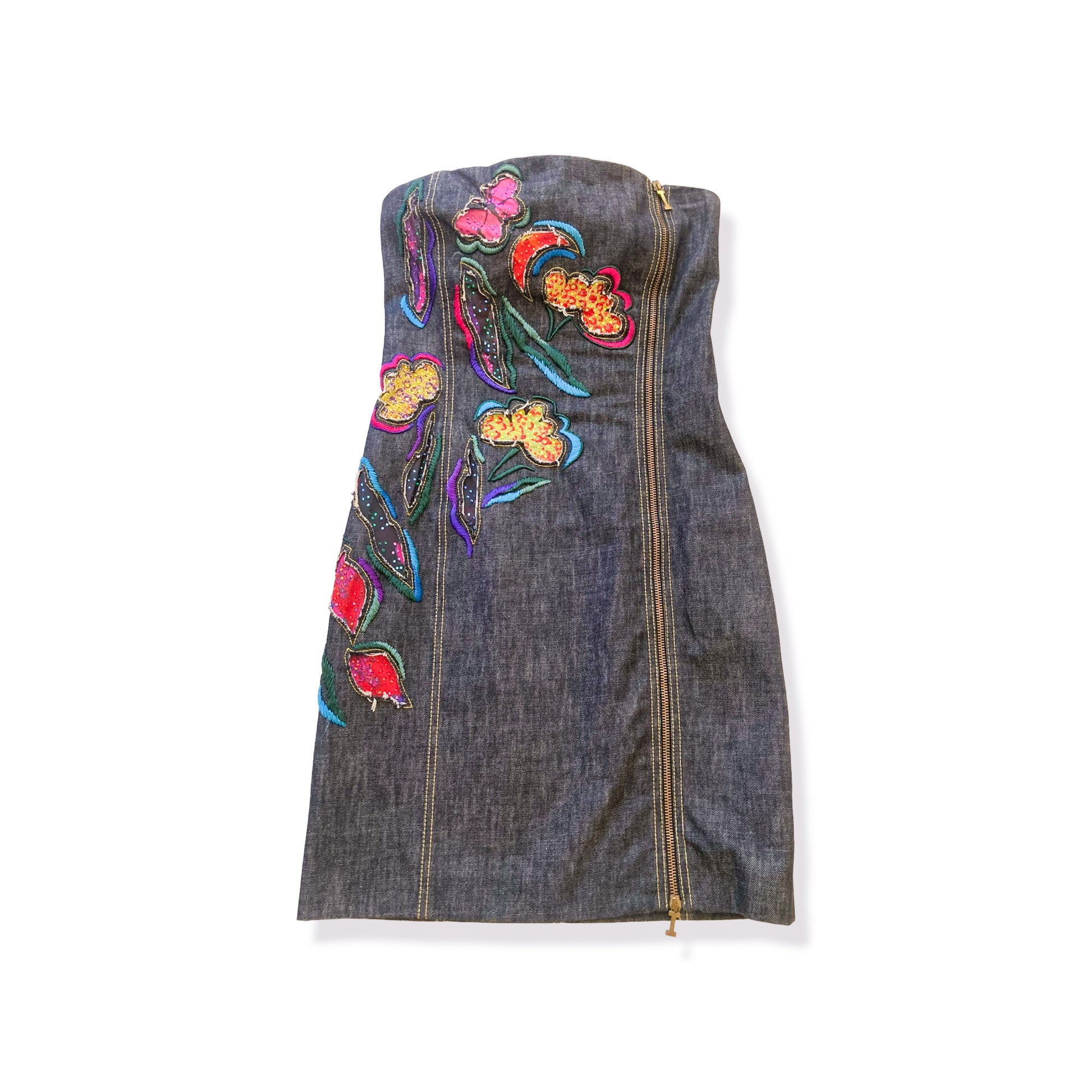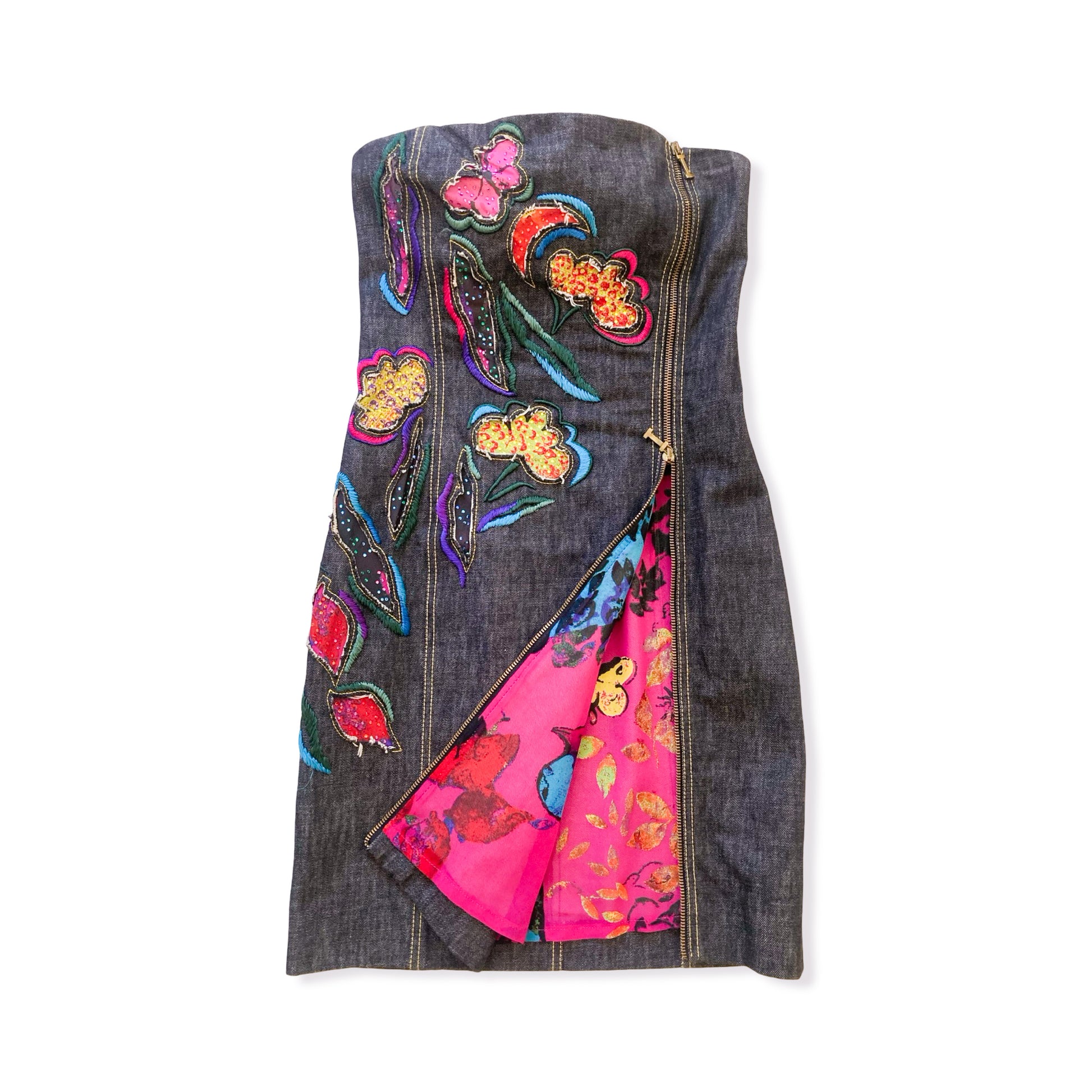 She is a runway denim dress, also seen in the brand's campaign. This bustier piece features a super unique design where the dark denim outer layer is artfully cut away to reveal the vibrant, embroidered lining beneath. The exposed lining, adorned with colorful floral & butterfly motifs, adds a dynamic contrast and an unexpected twist to the structured denim. A bold zipper runs along the front, enhancing the sleek silhouette while adding an edge to the design. Very hard to come by.