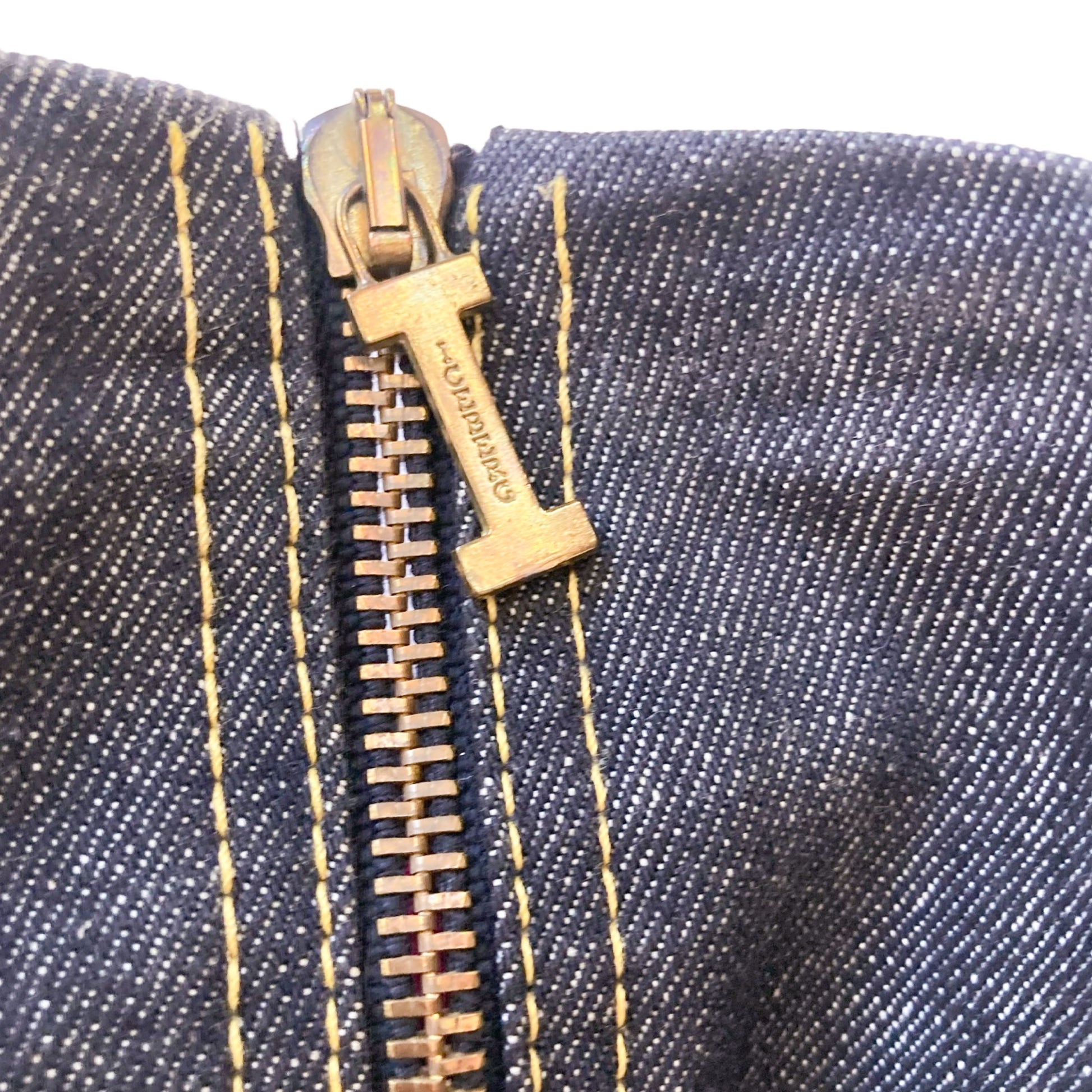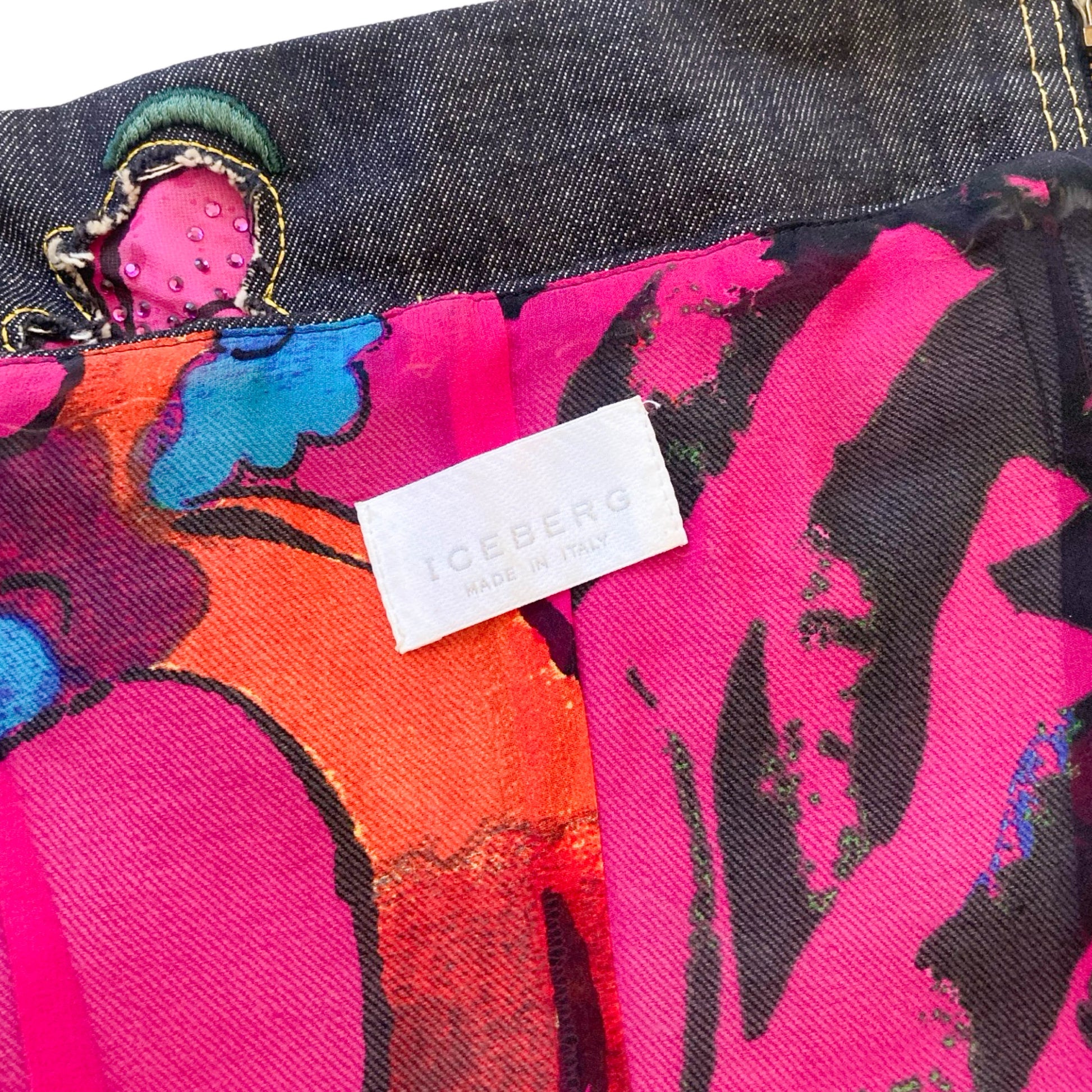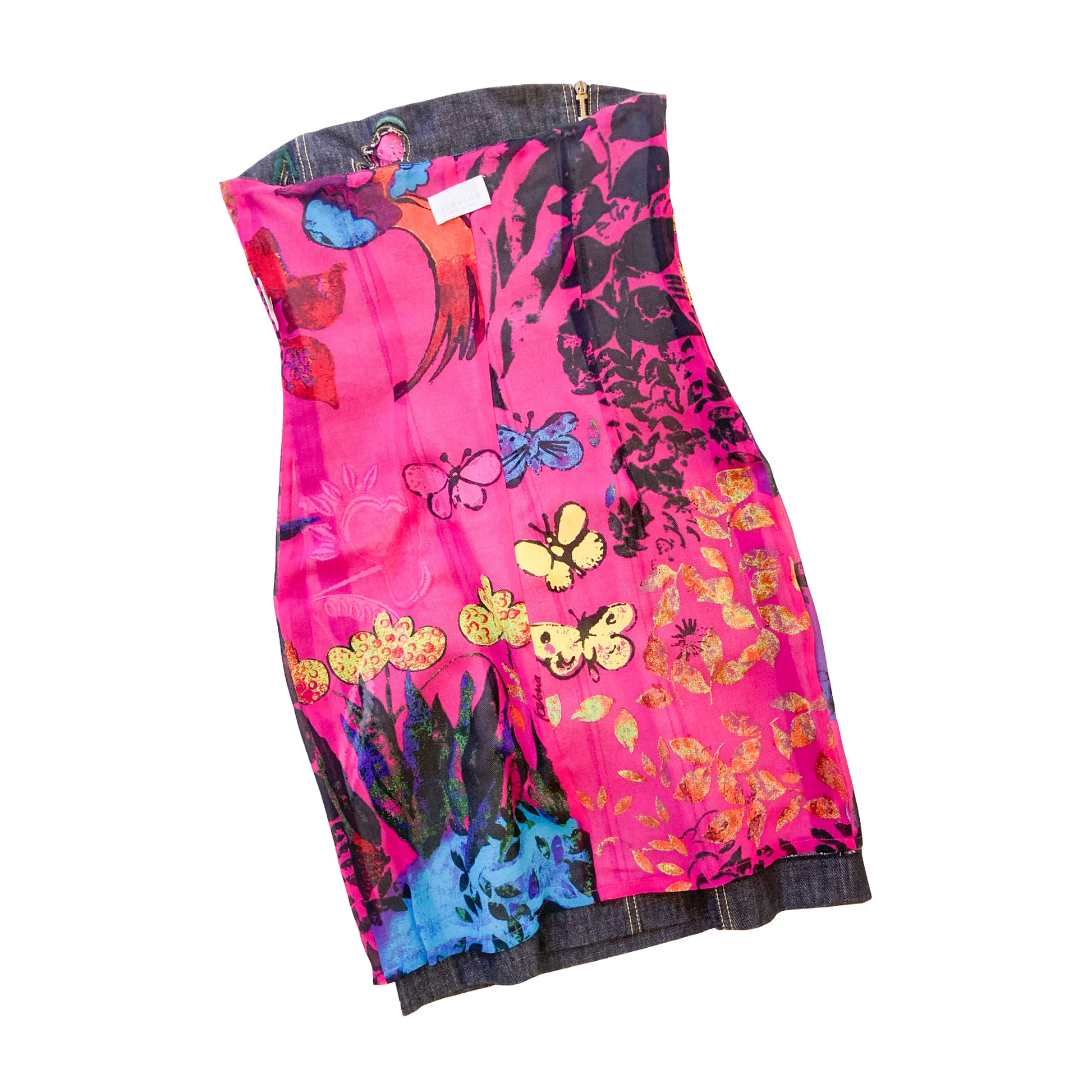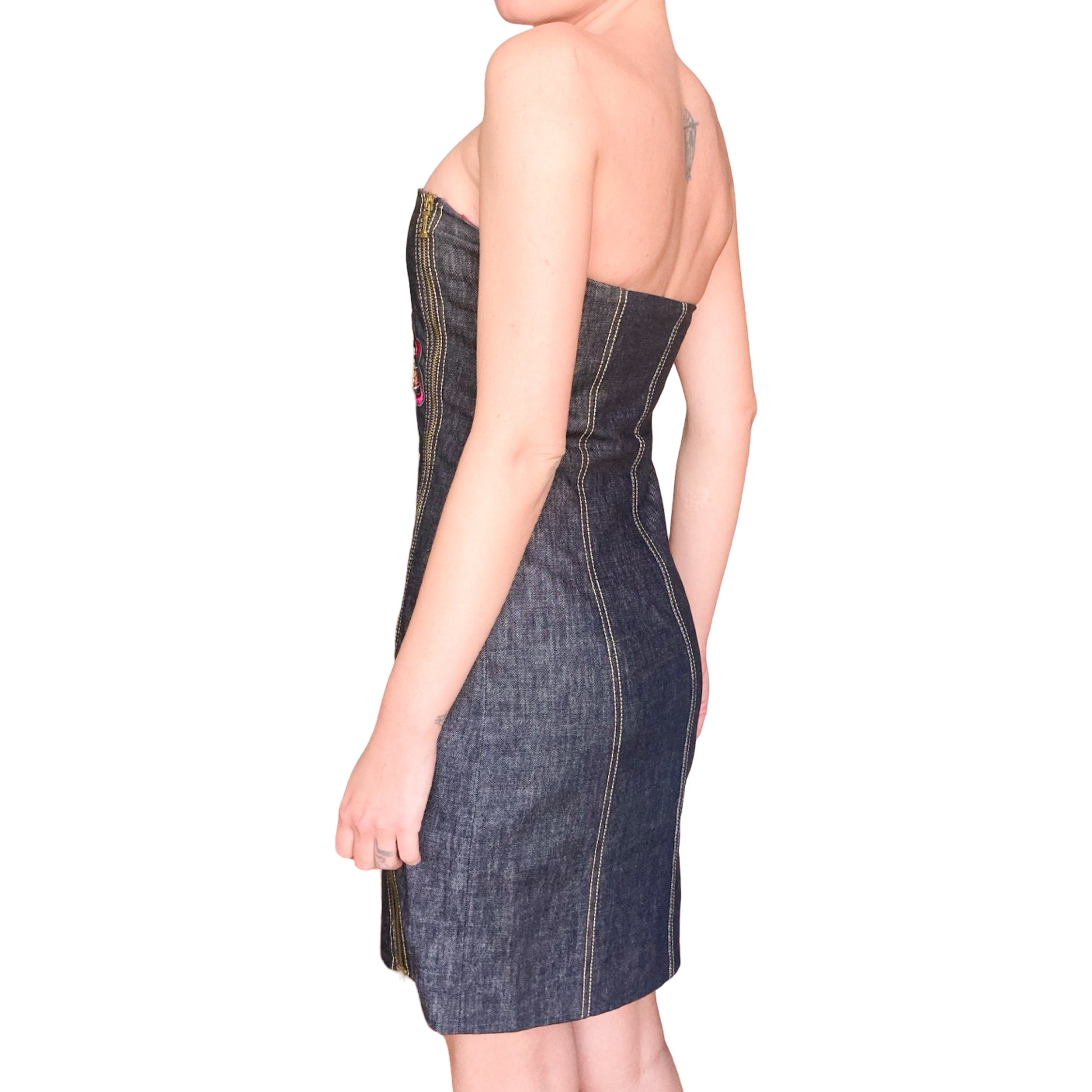 She is a runway denim dress, also seen in the brand's campaign. This bustier piece features a super unique design where the dark denim outer layer is artfully cut away to reveal the vibrant, embroidered lining beneath. The exposed lining, adorned with colorful floral & butterfly motifs, adds a dynamic contrast and an unexpected twist to the structured denim. A bold zipper runs along the front, enhancing the sleek silhouette while adding an edge to the design. Very hard to come by.