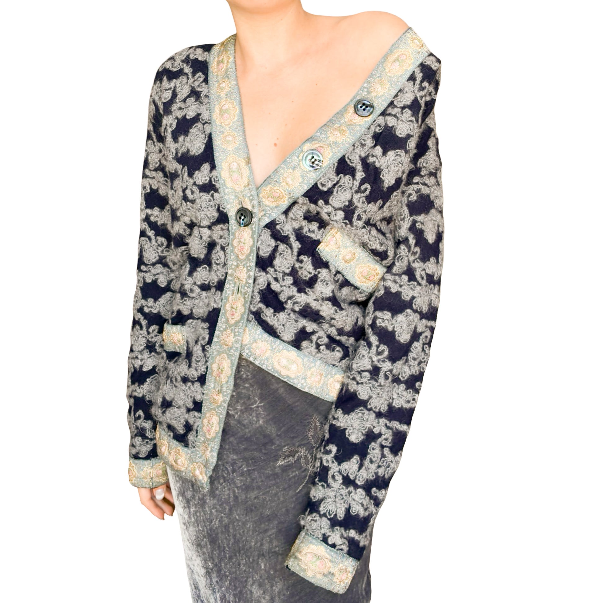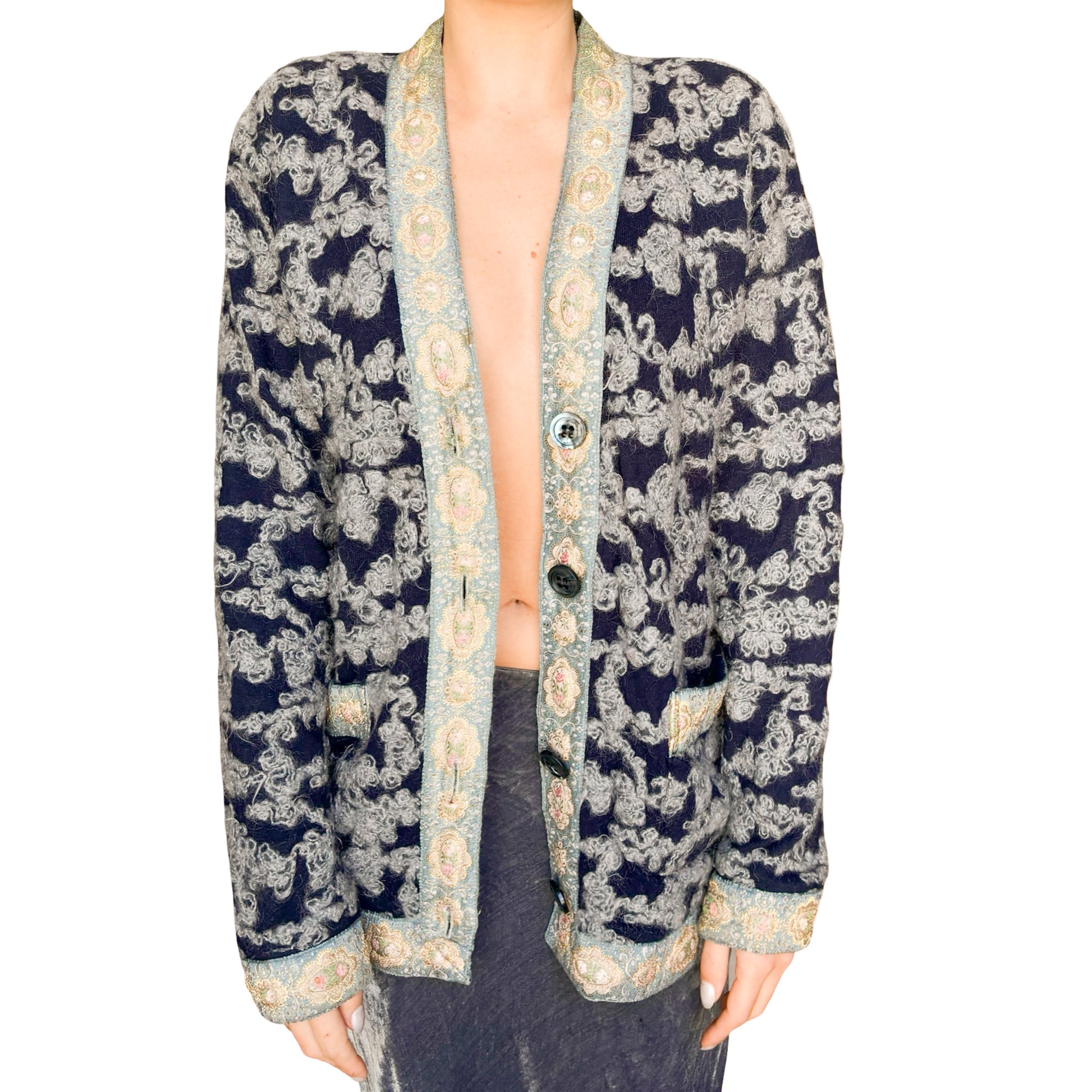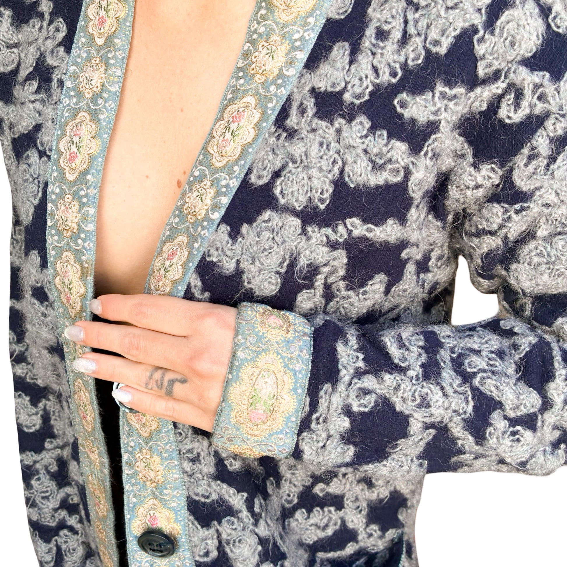 One of the rarest cardigan by Tiziano Mazzilli & Louise Michielsens for their brand Invest in the Original Voyage. Oversized & long navy button-up knit cardi with grey mohair loop embroidery across the surface, finished with wide brocade trims (aquamarine base, oval floral motifs) along the neckline, placket, cuffs, hem and pocket welts. Two front pockets, mixed tonal buttons, dropped shoulders, bronze jacquard lining. The brocade pattern and floral tapestry embroidery match the decorative style worn by Vanessa Paradis on a 2004 red carpet appearance.
