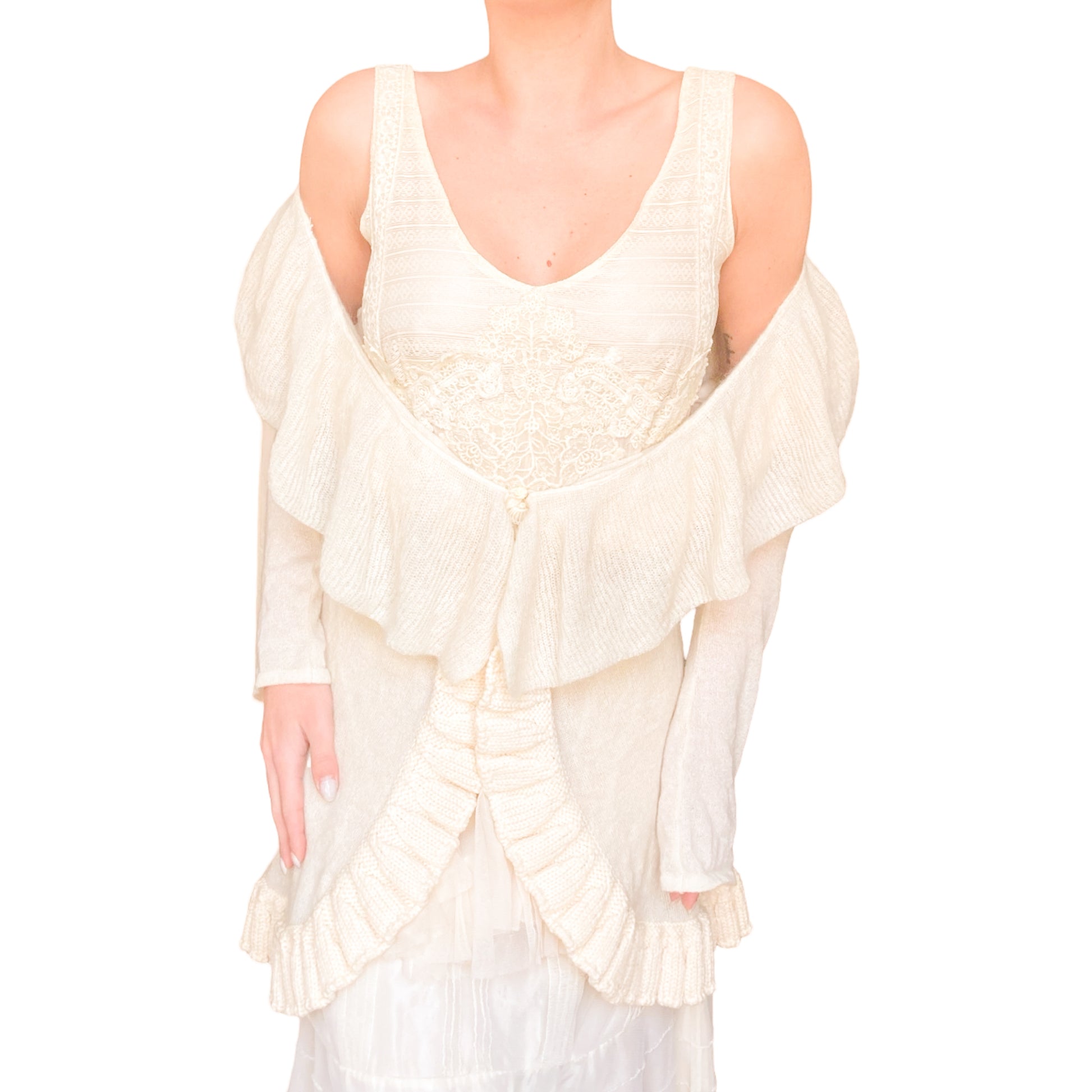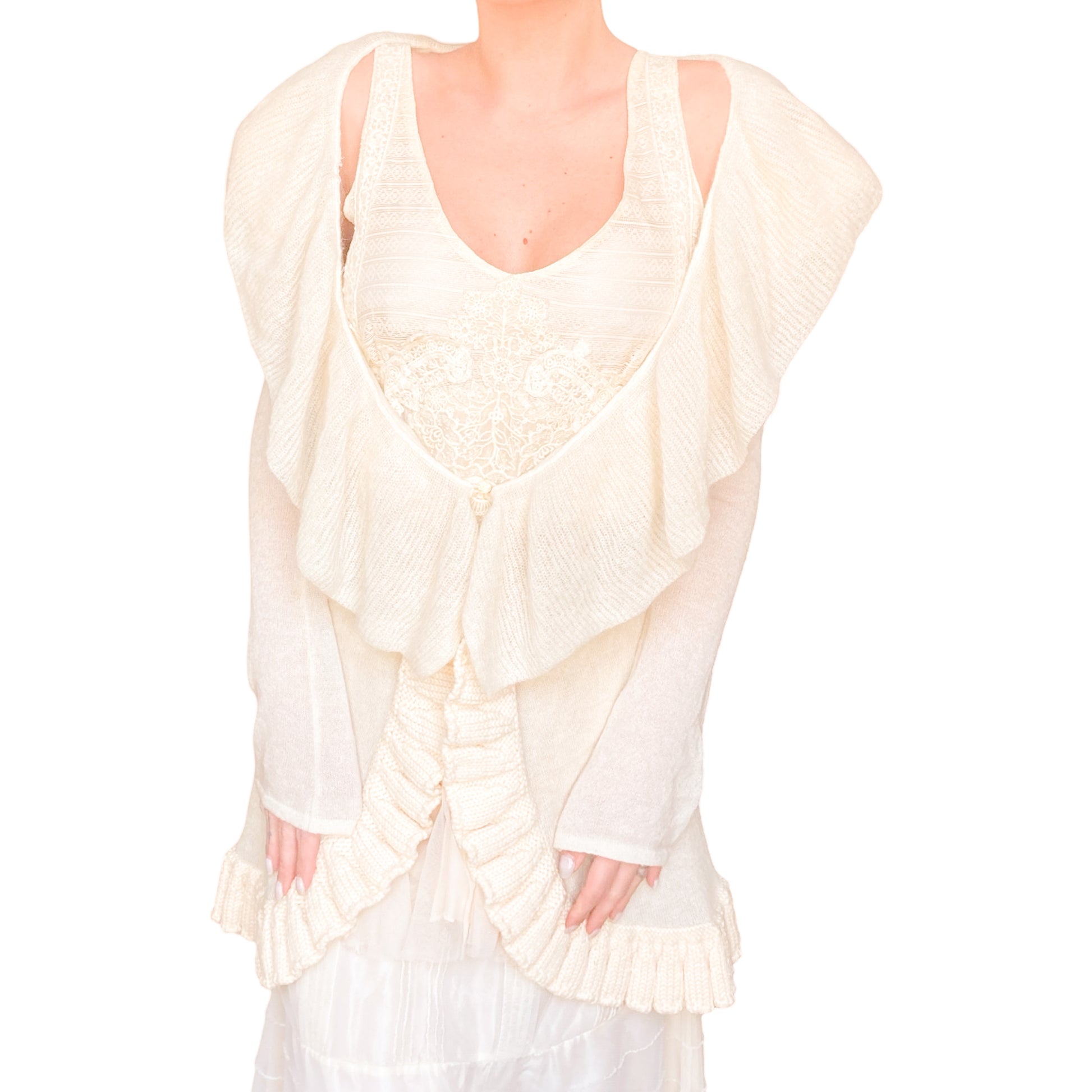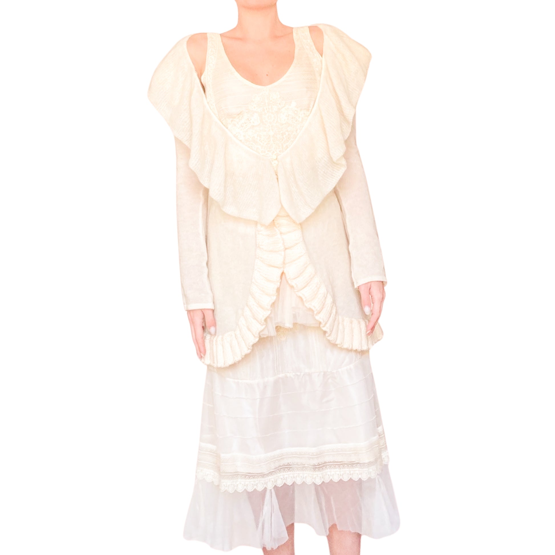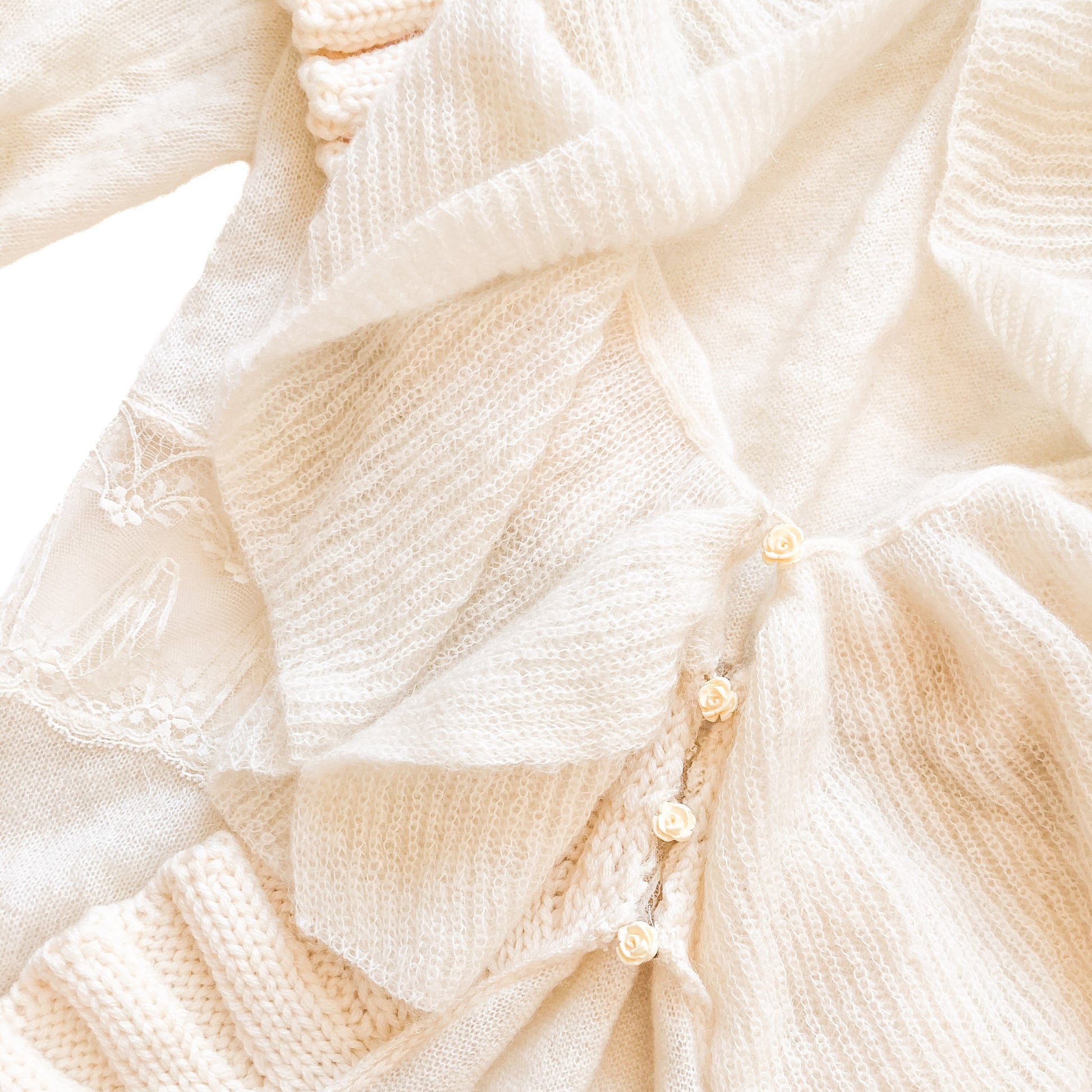 This cream ensemble includes three versatile pieces: a soft wool cardigan with openwork lace details and rose-shaped buttons, a lace and mesh top that can double as a mini dress for those under 170 cm, and a layered skirt. Both the top and skirt are fully lined in silk. Romantic and timeless, these pieces are full of super cute details. rare ! I love that this set can be worn during every season, ideal for a soft summer evening under a warm breeze or during a mild winter that doesn’t bite.