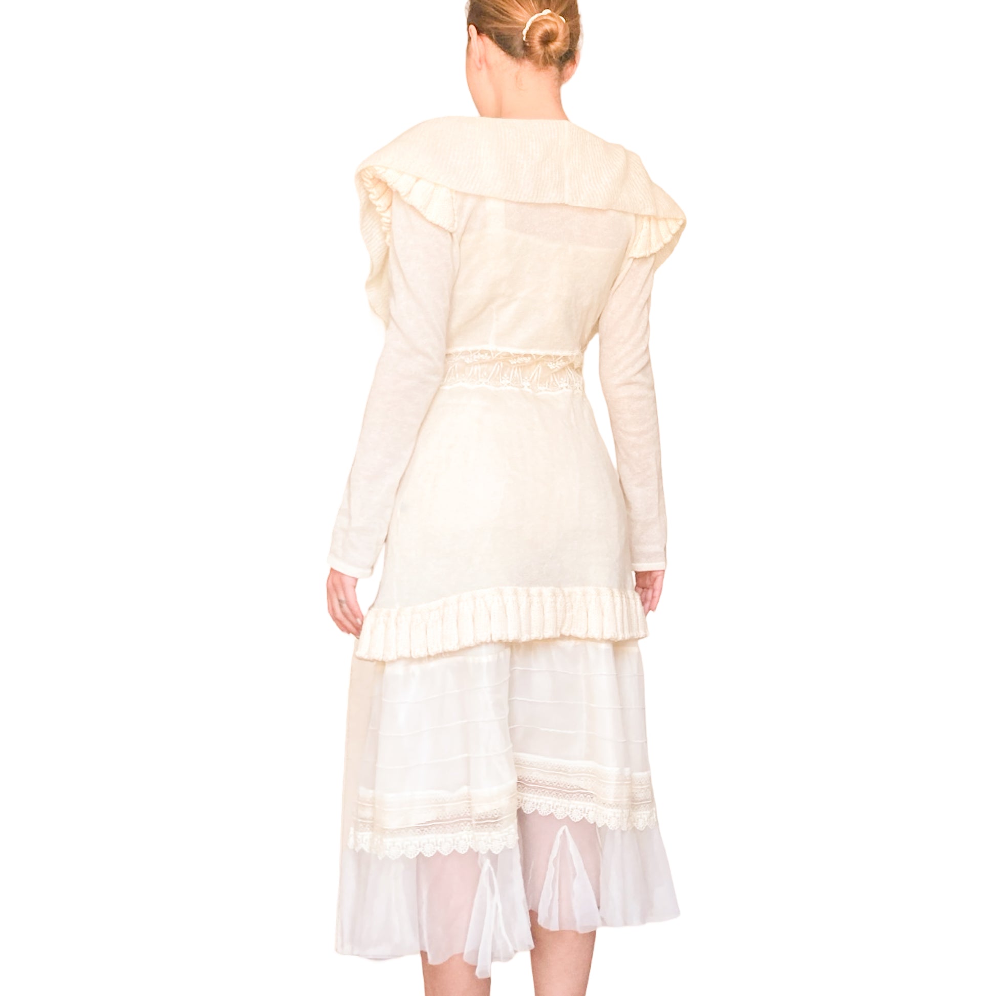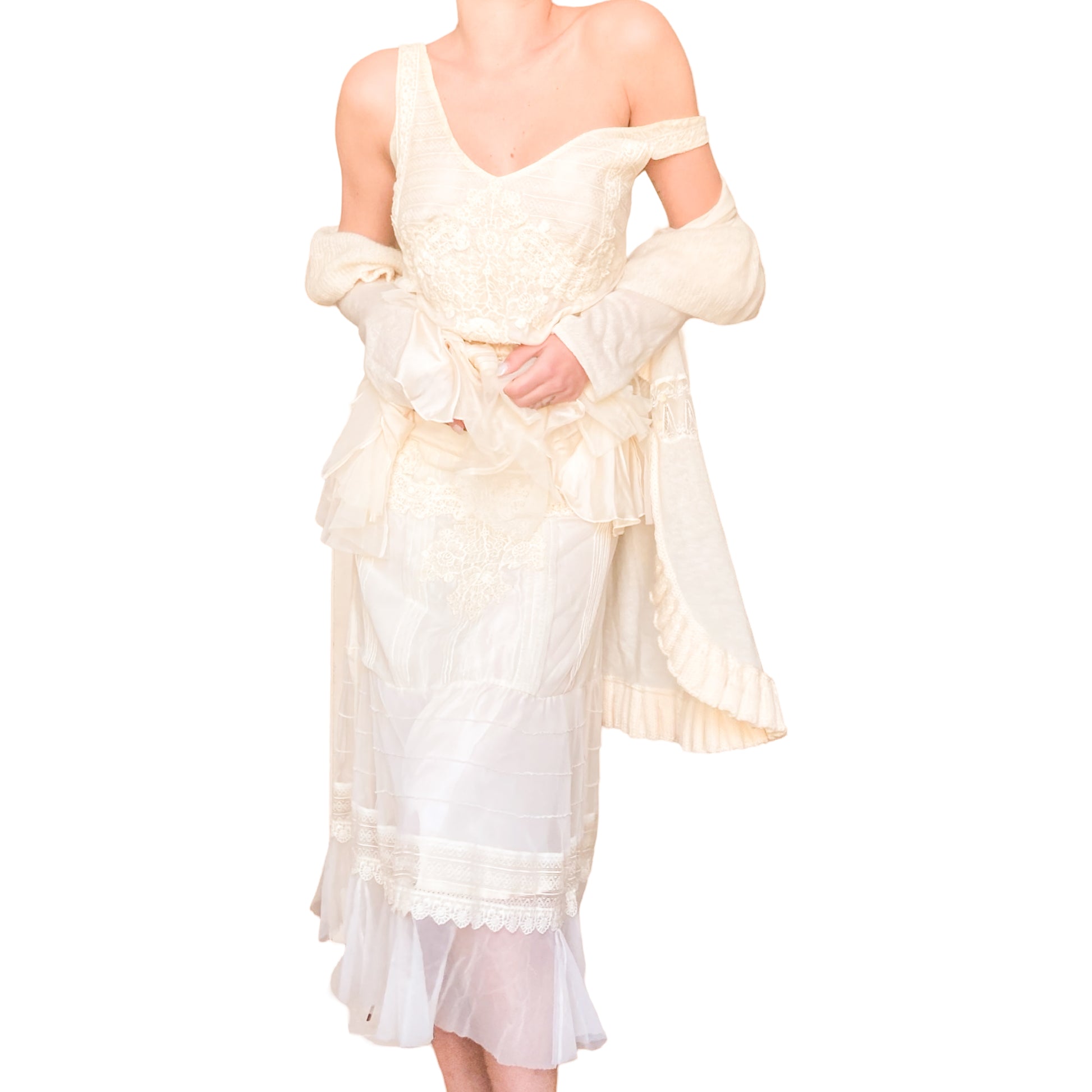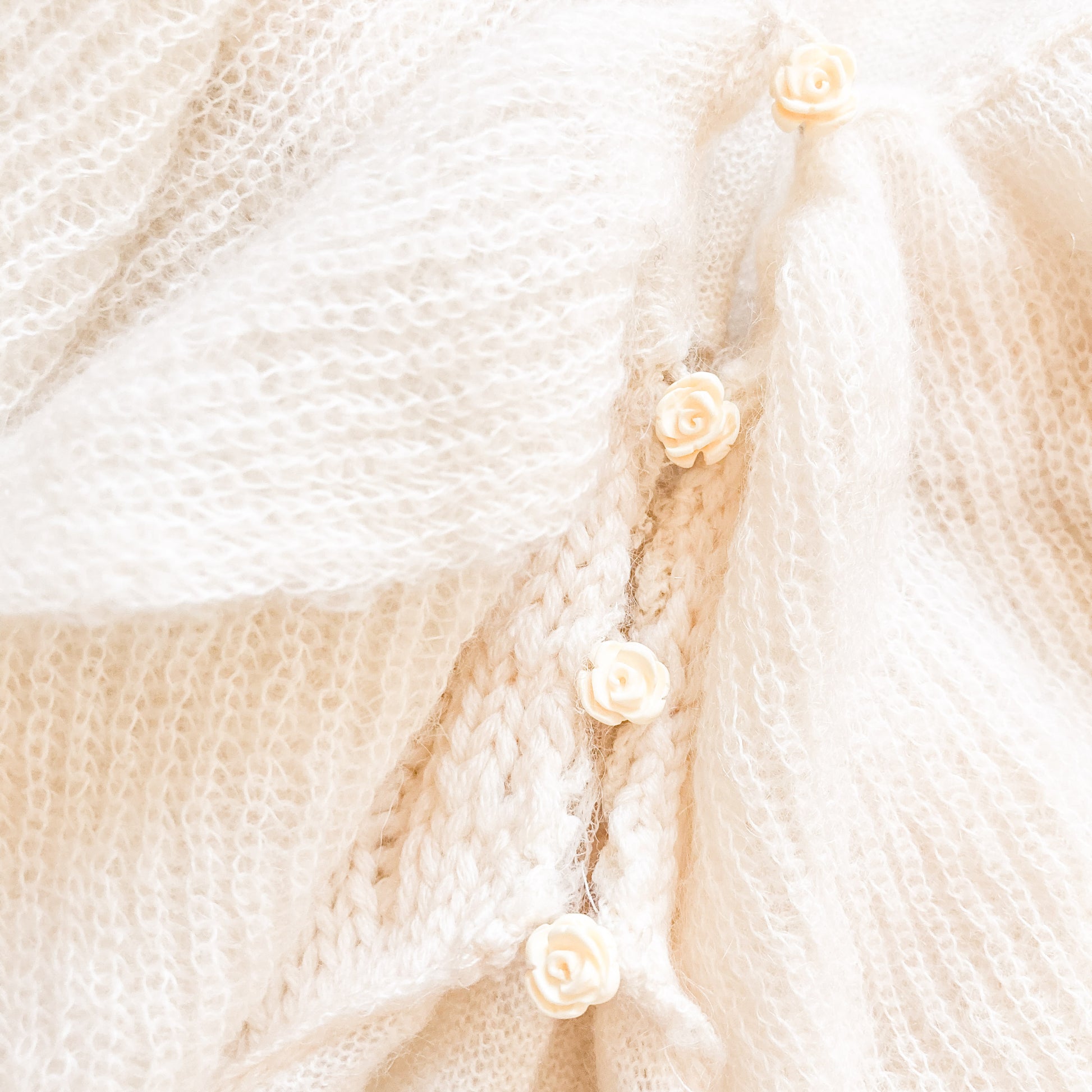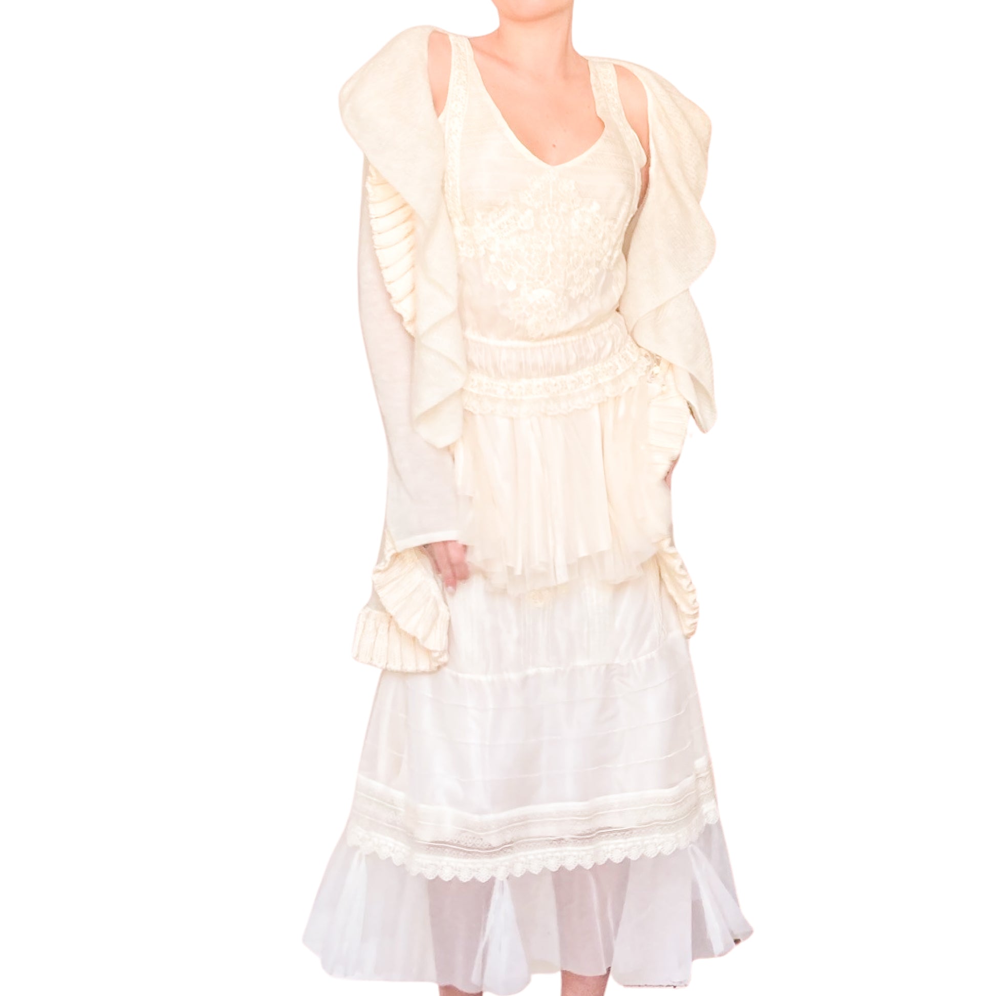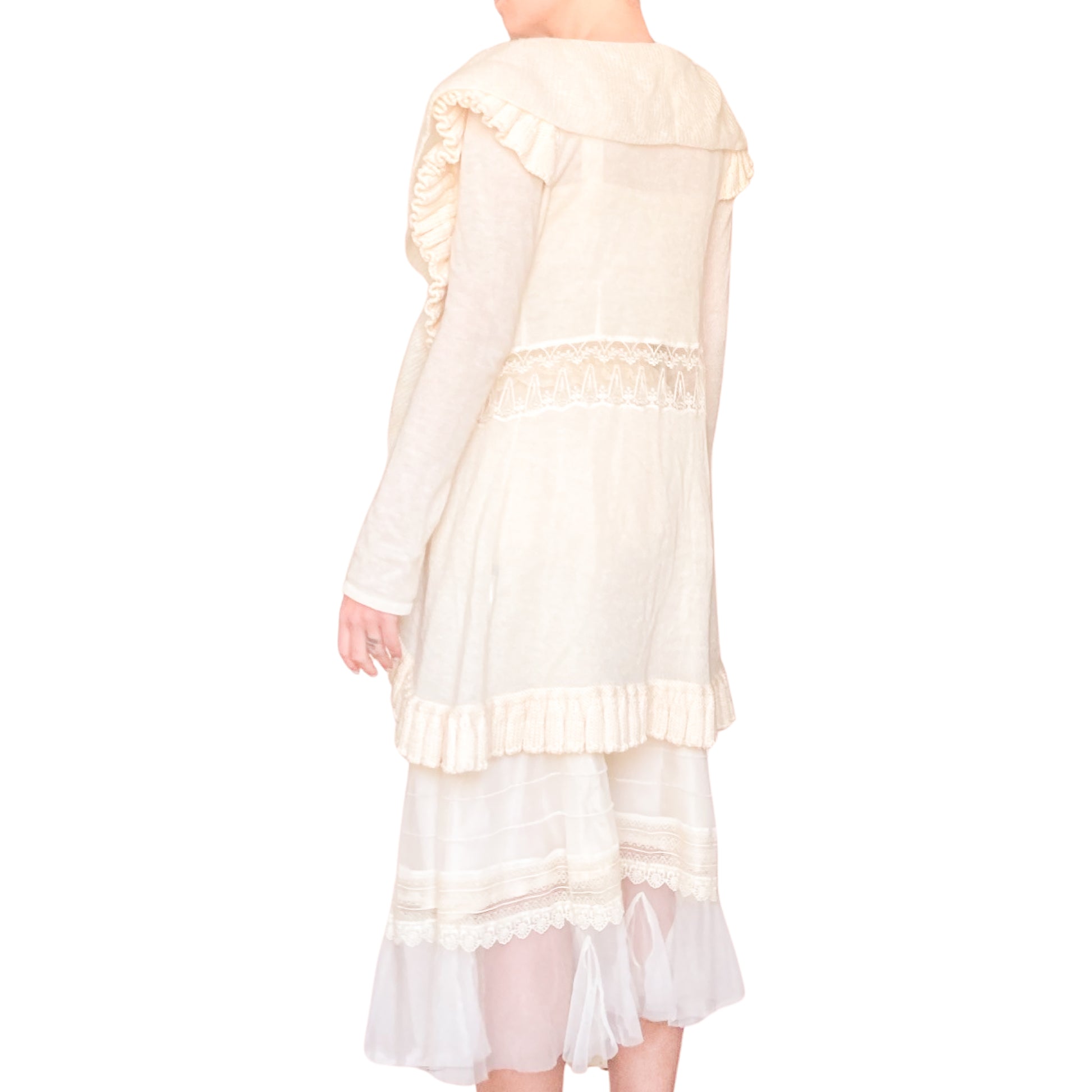 This cream ensemble includes three versatile pieces: a soft wool cardigan with openwork lace details and rose-shaped buttons, a lace and mesh top that can double as a mini dress for those under 170 cm, and a layered skirt. Both the top and skirt are fully lined in silk. Romantic and timeless, these pieces are full of super cute details. rare ! I love that this set can be worn during every season, ideal for a soft summer evening under a warm breeze or during a mild winter that doesn’t bite.