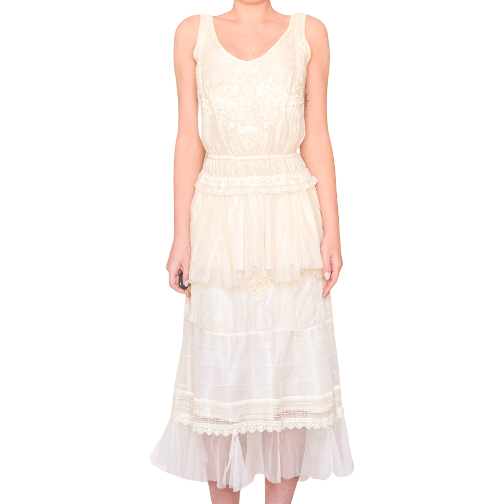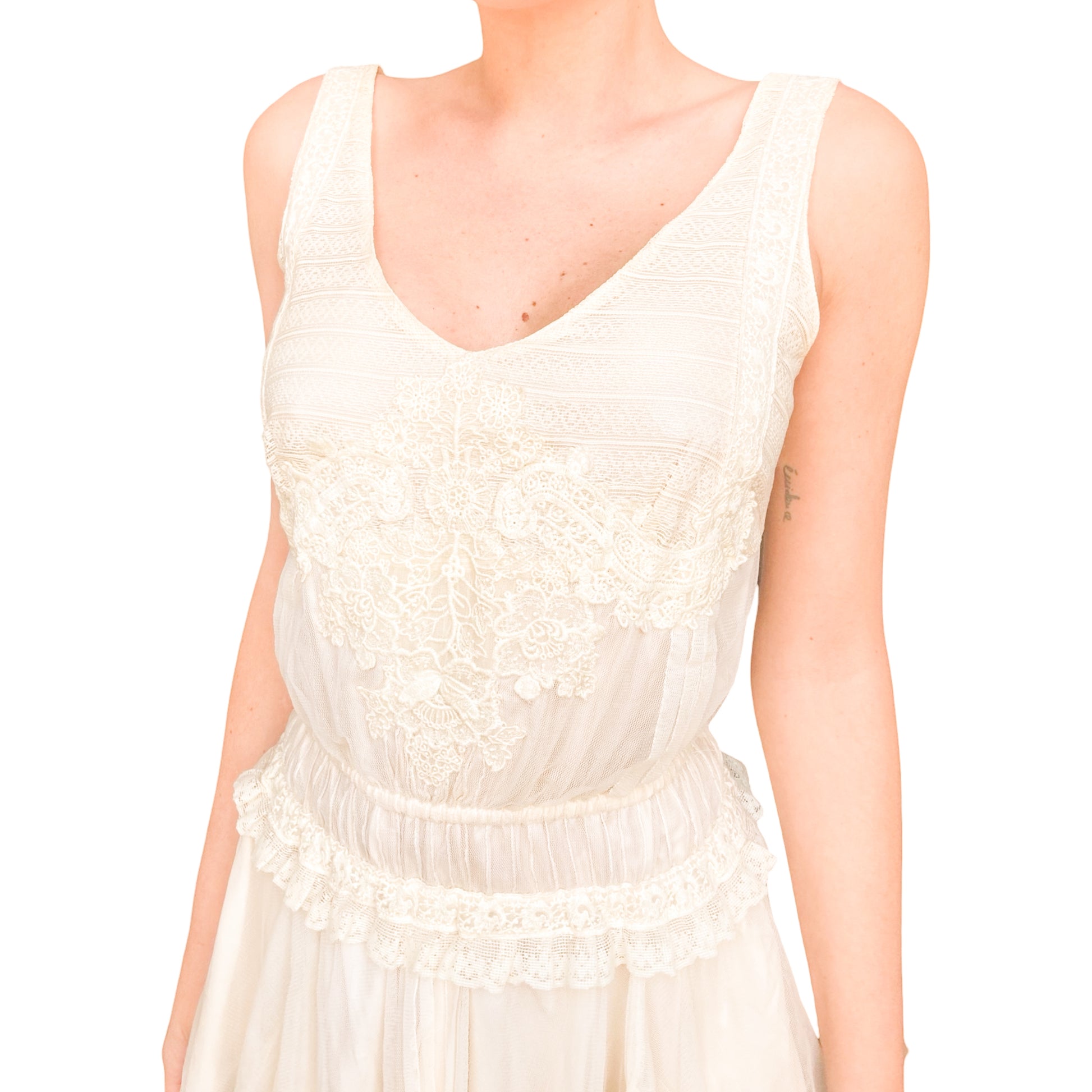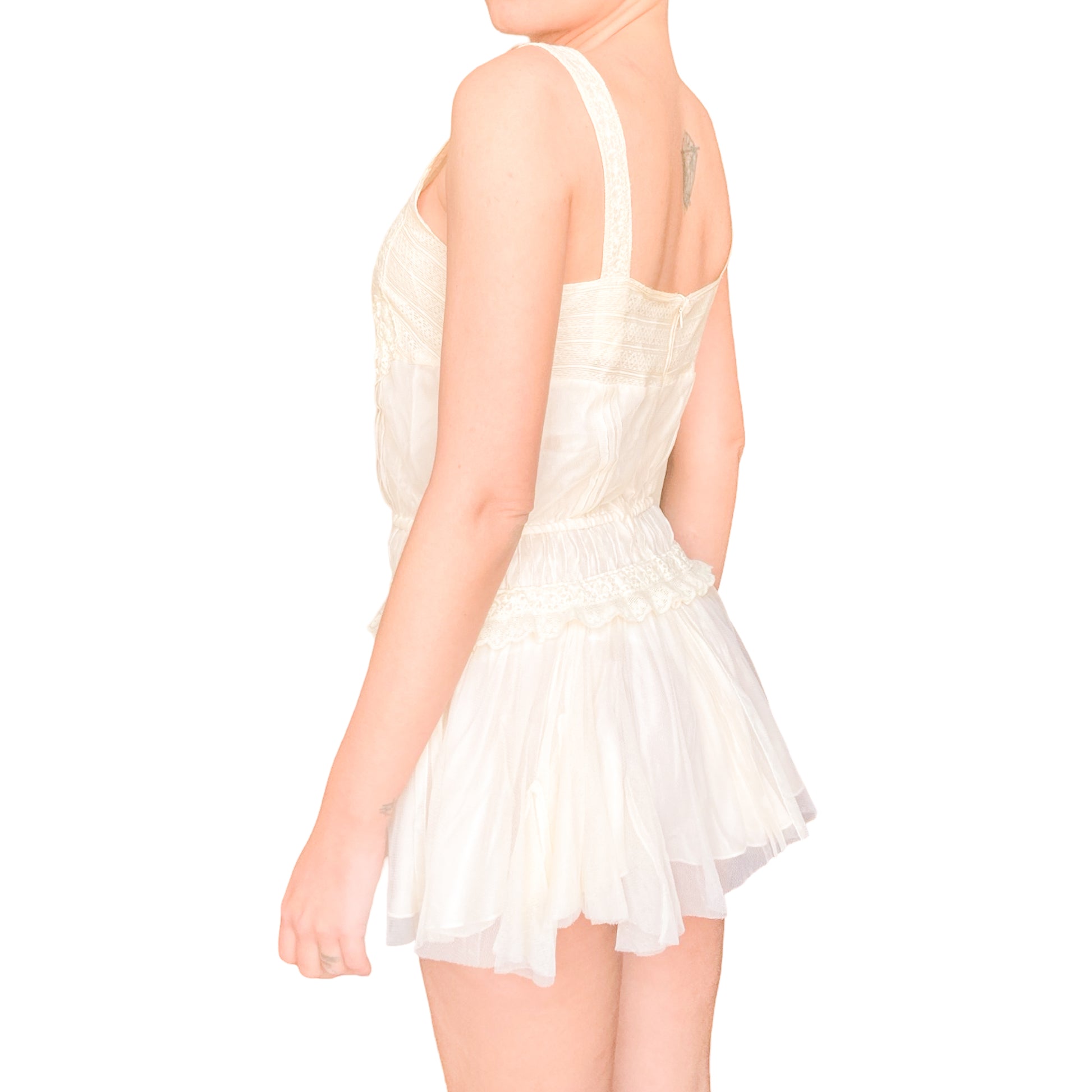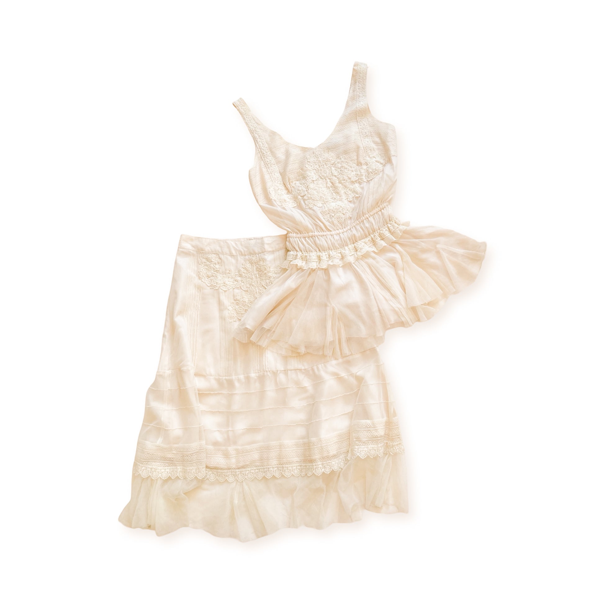 This cream ensemble includes three versatile pieces: a soft wool cardigan with openwork lace details and rose-shaped buttons, a lace and mesh top that can double as a mini dress for those under 170 cm, and a layered skirt. Both the top and skirt are fully lined in silk. Romantic and timeless, these pieces are full of super cute details. rare ! I love that this set can be worn during every season, ideal for a soft summer evening under a warm breeze or during a mild winter that doesn’t bite.