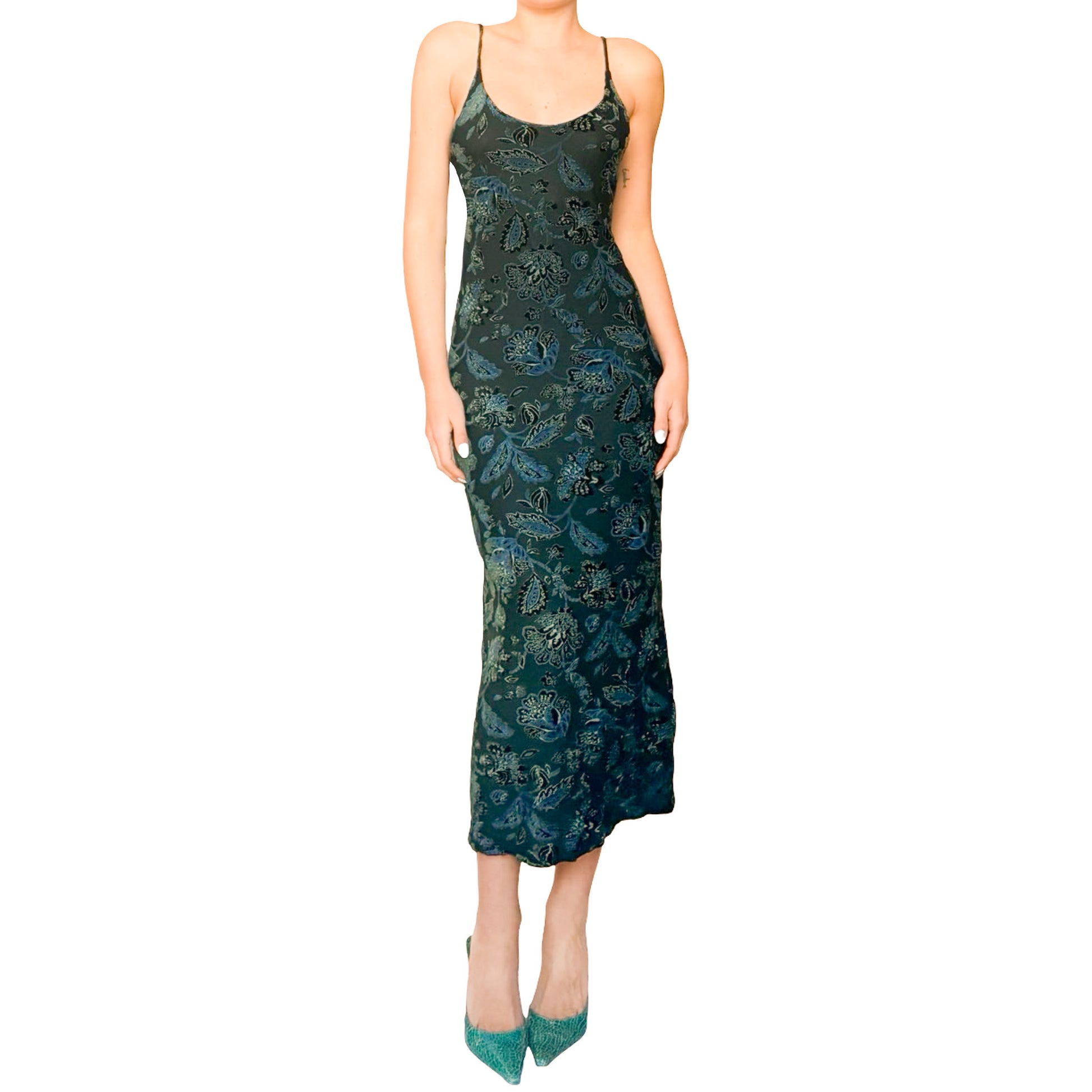 Emerald stretch-velvet maxi with light-catching appliqué and subtle iridescent reflections, adjustable straps allowing a higher or lower neckline, high-quality velvet finish, body-skimming cut, and open back with a thin tie. Fully lined. A true 90's beauty !