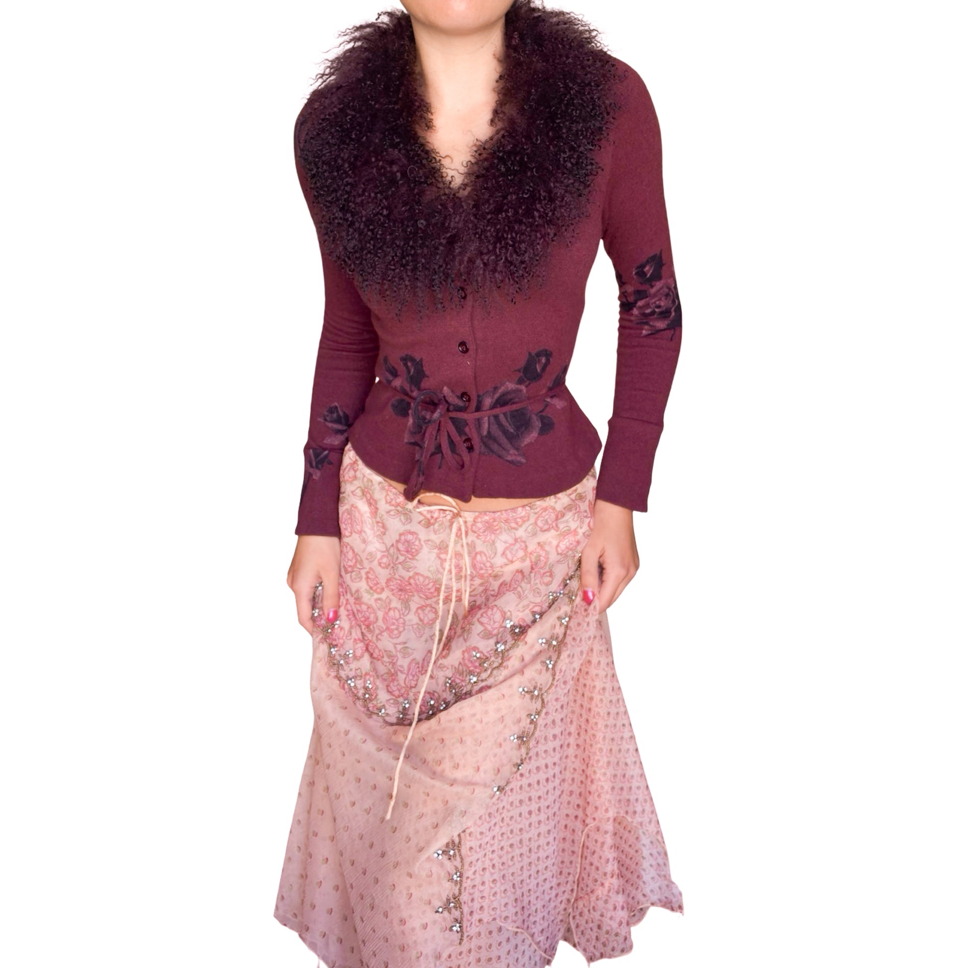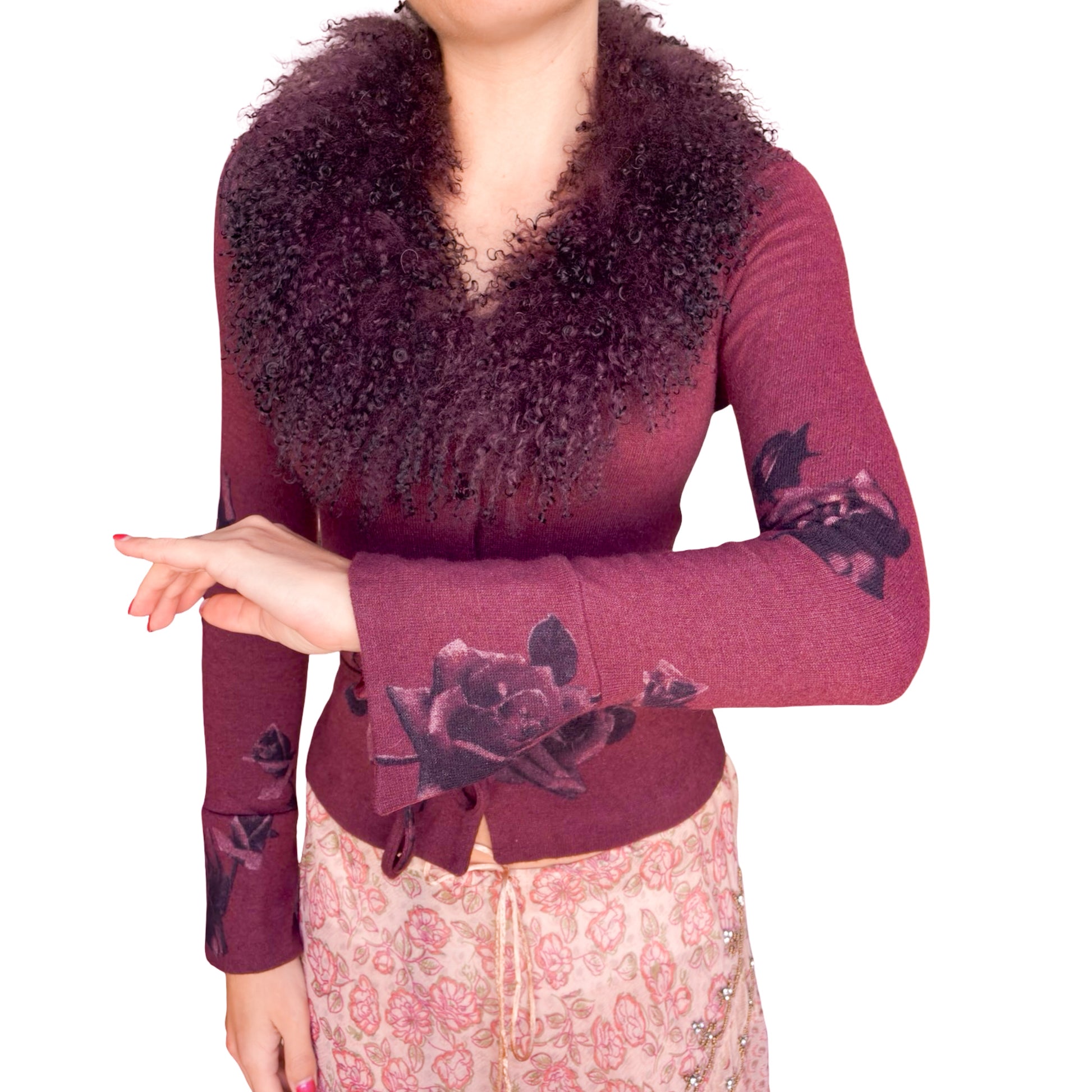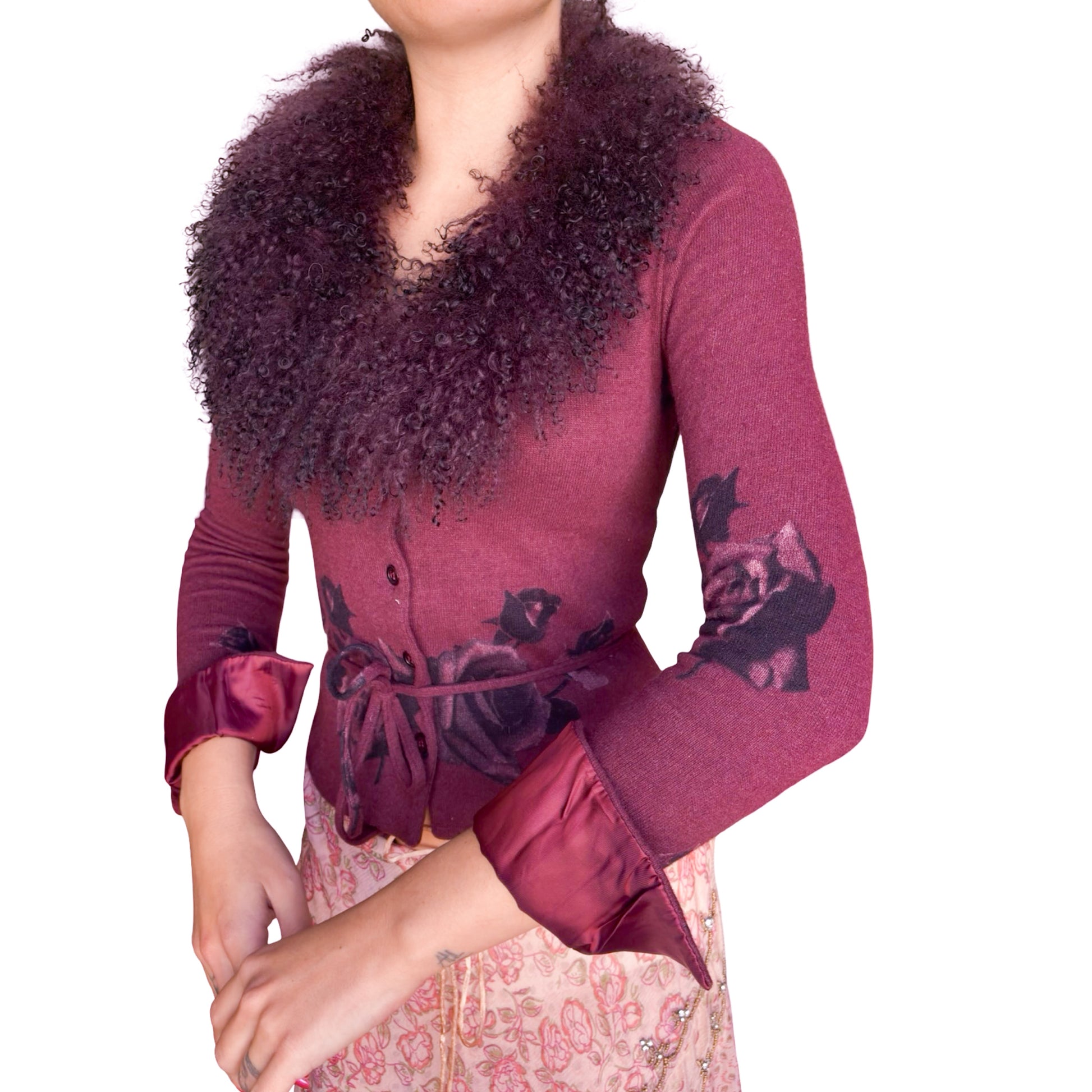 Fitted cardigan in deep burgundy wool-angora blend, adorned with black rose motifs throughout. Features a detachable Mongolian curly fur collar secured by small buttons, allowing versatile styling. The waist can be cinched with matching ties, and the wide cuffs can be worn down or rolled to reveal a luxurious satin lining. Button-front closure with tonal buttons.