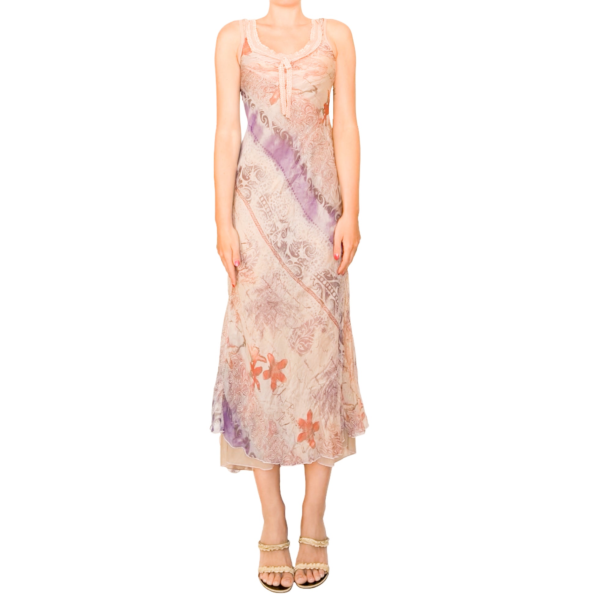 Double-layer dress composed of two separate dresses worn together. Inner slip in polyamide with silk ruffles cascading down the back, creating volume and a crinoline-like effect. Outer layer in printed silk chiffon with matching pattern to the ruffles, slightly transparent, openwork at the back revealing the ruffled construction beneath. Scoop neckline with lace trim detail. The combination of both layers makes the dress non-transparent when worn. Feminine silhouette with historical references, evoking Madame de Pompadour.
