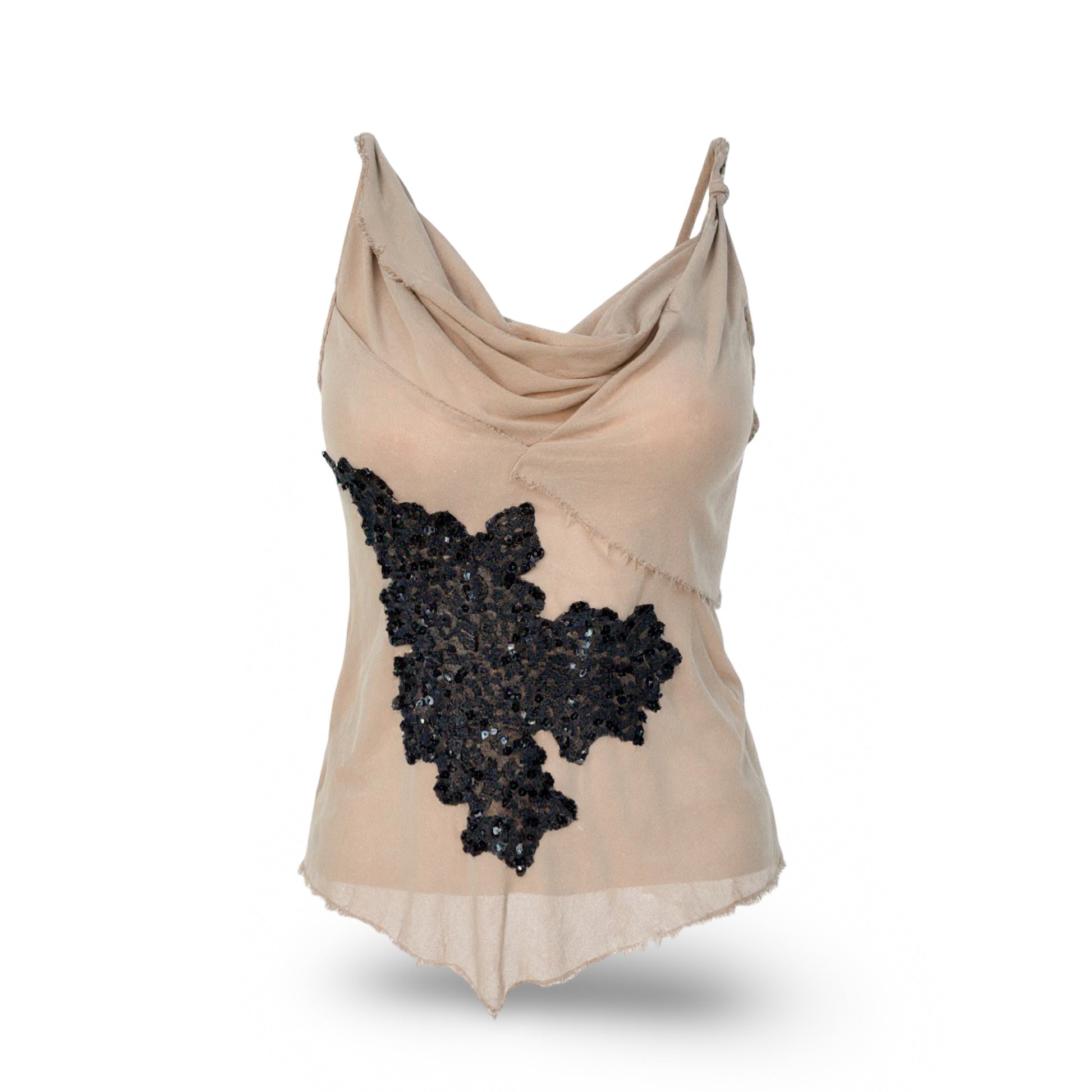 Vintage Italian silk chiffon top in soft taupe tones, designed with an asymmetric draped neckline and raw edges. The waist is adorned with black lace embroidery hand-sewn with sequins, creating a contrast of texture and light. Slightly irregular hemline and knotted shoulder straps enhance its effortless, sensual silhouette.