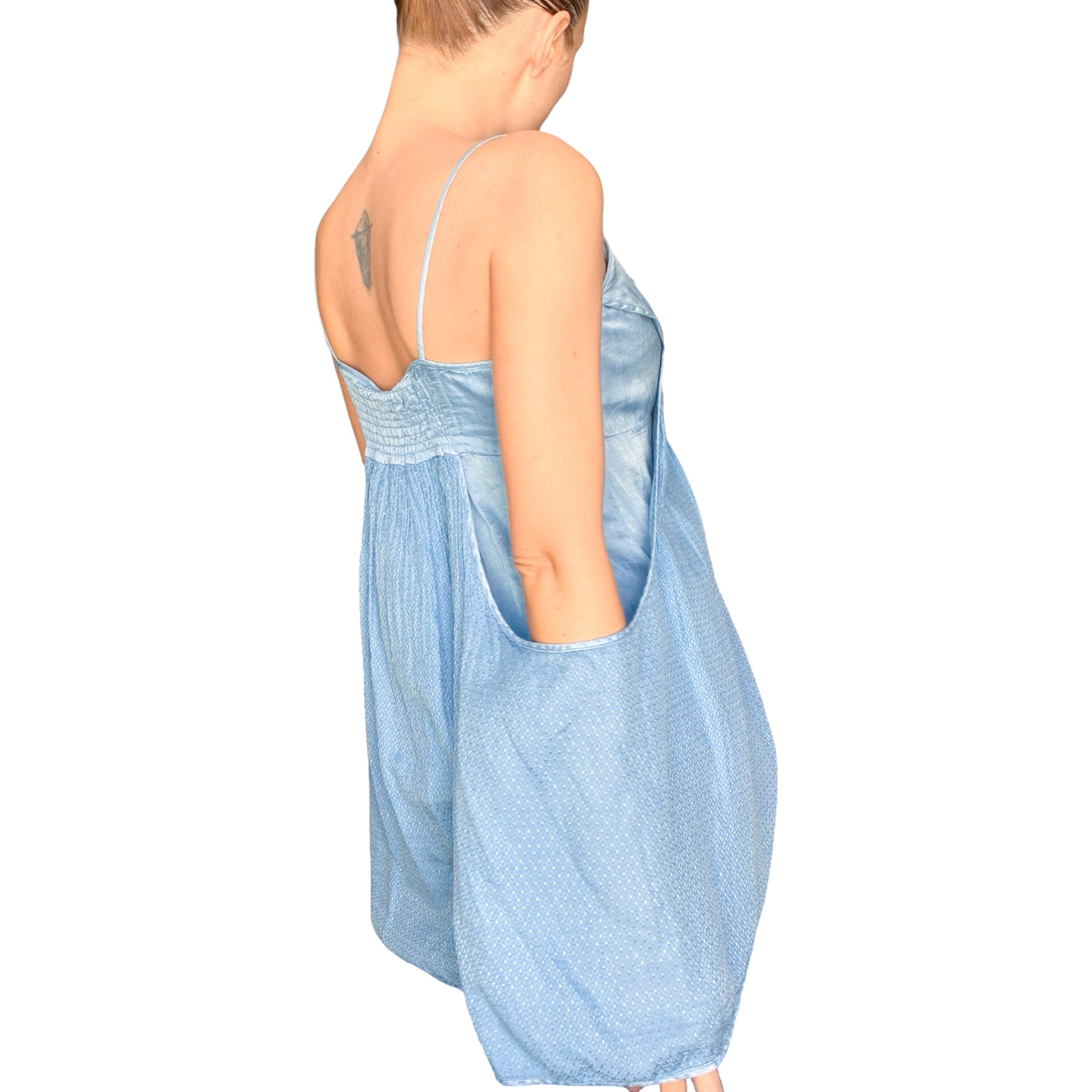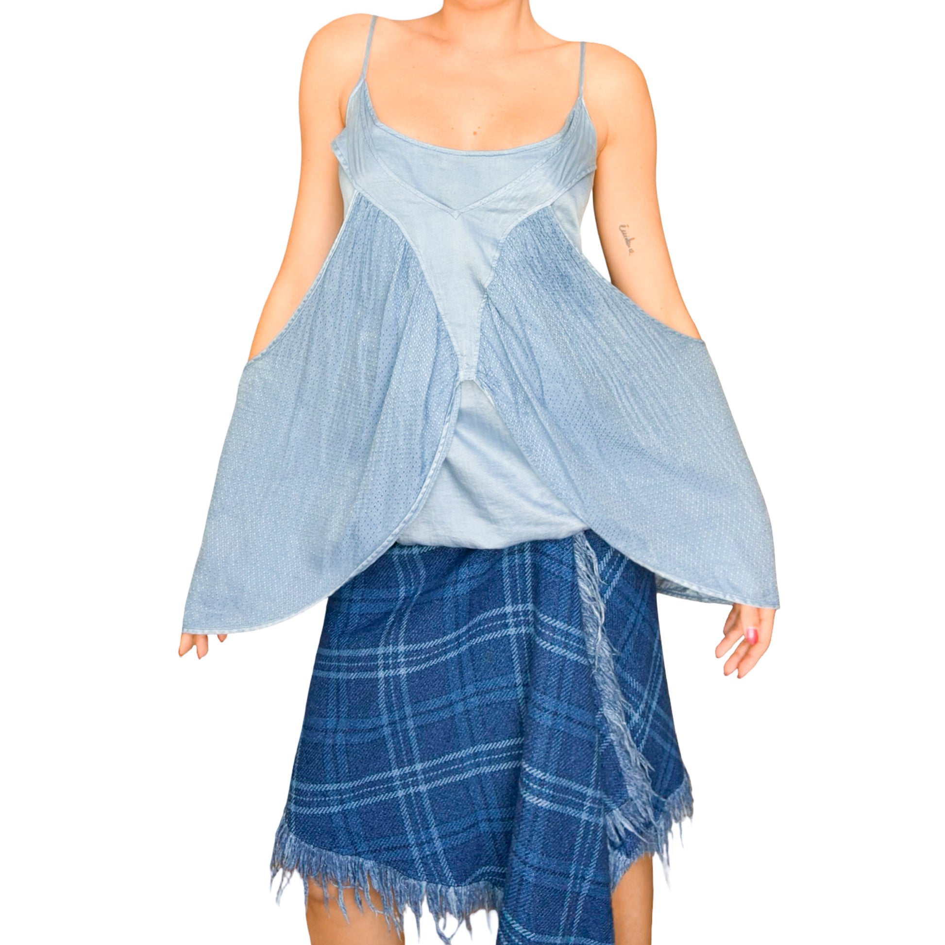 Washed blue-denim silk with ultra-thin straps, a smooth bodice, smocked back, and textured side panels creating an open asymmetric drape. Short cut, wearable as a micro dress or layered top.