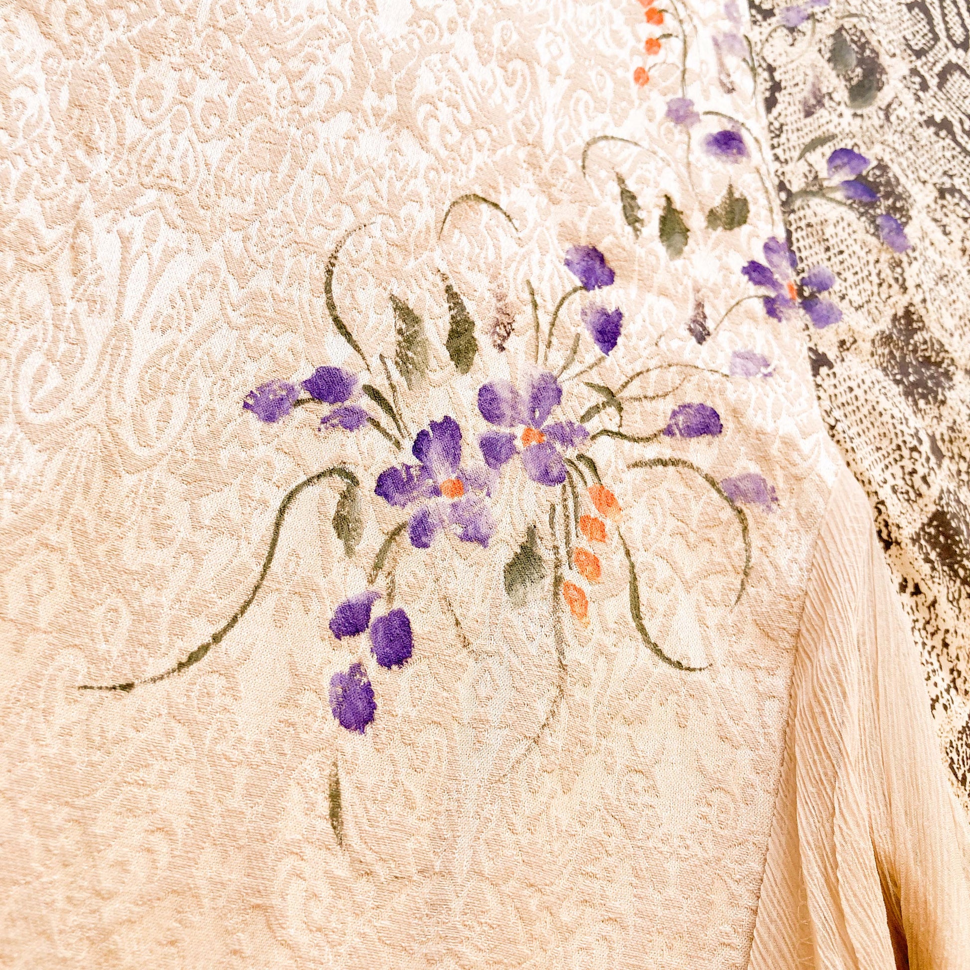 Rare Italian vintage skirt combining baroque jacquard, python-print panels, and romantic hand-painted florals in lilac and tangerine. Features sheer silk chiffon godets for subtle movement and an asymmetrical drape. A unique hybrid between craftsmanship and eccentric elegance, perfect paired with structured corsetry or a minimalist top.