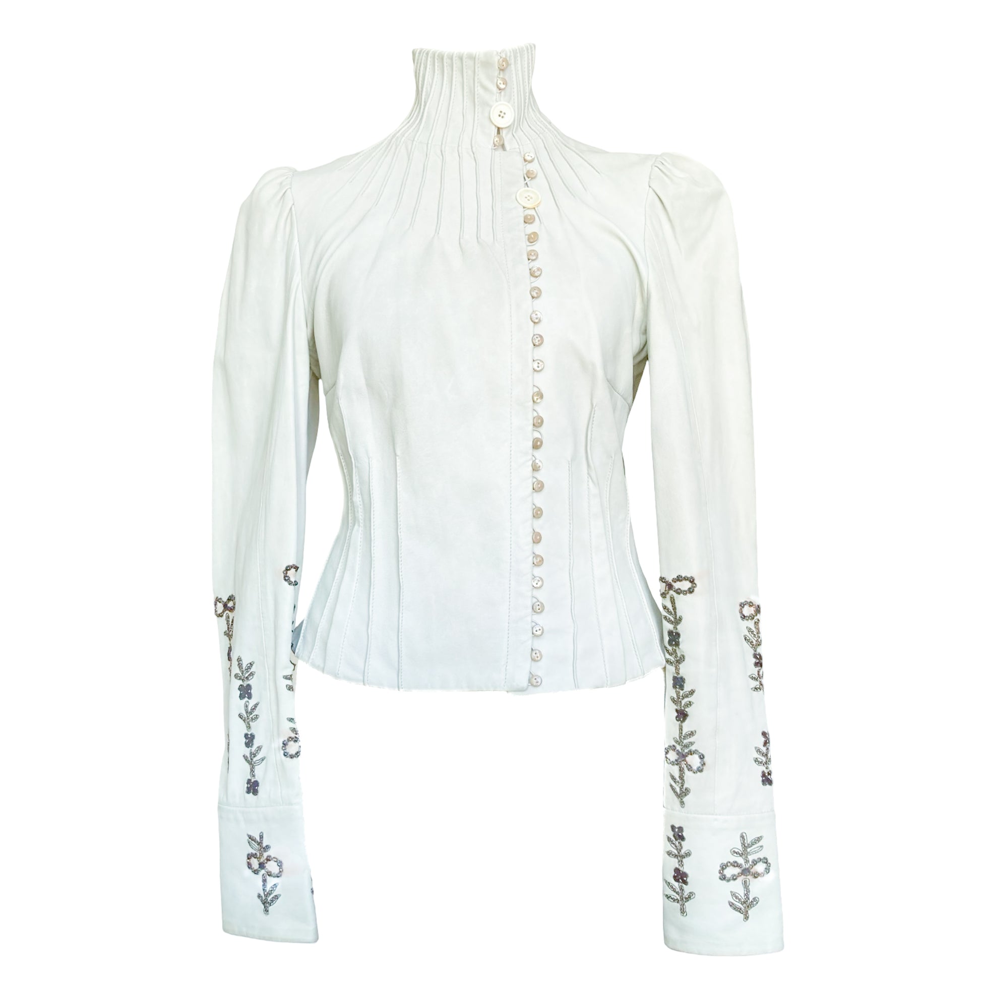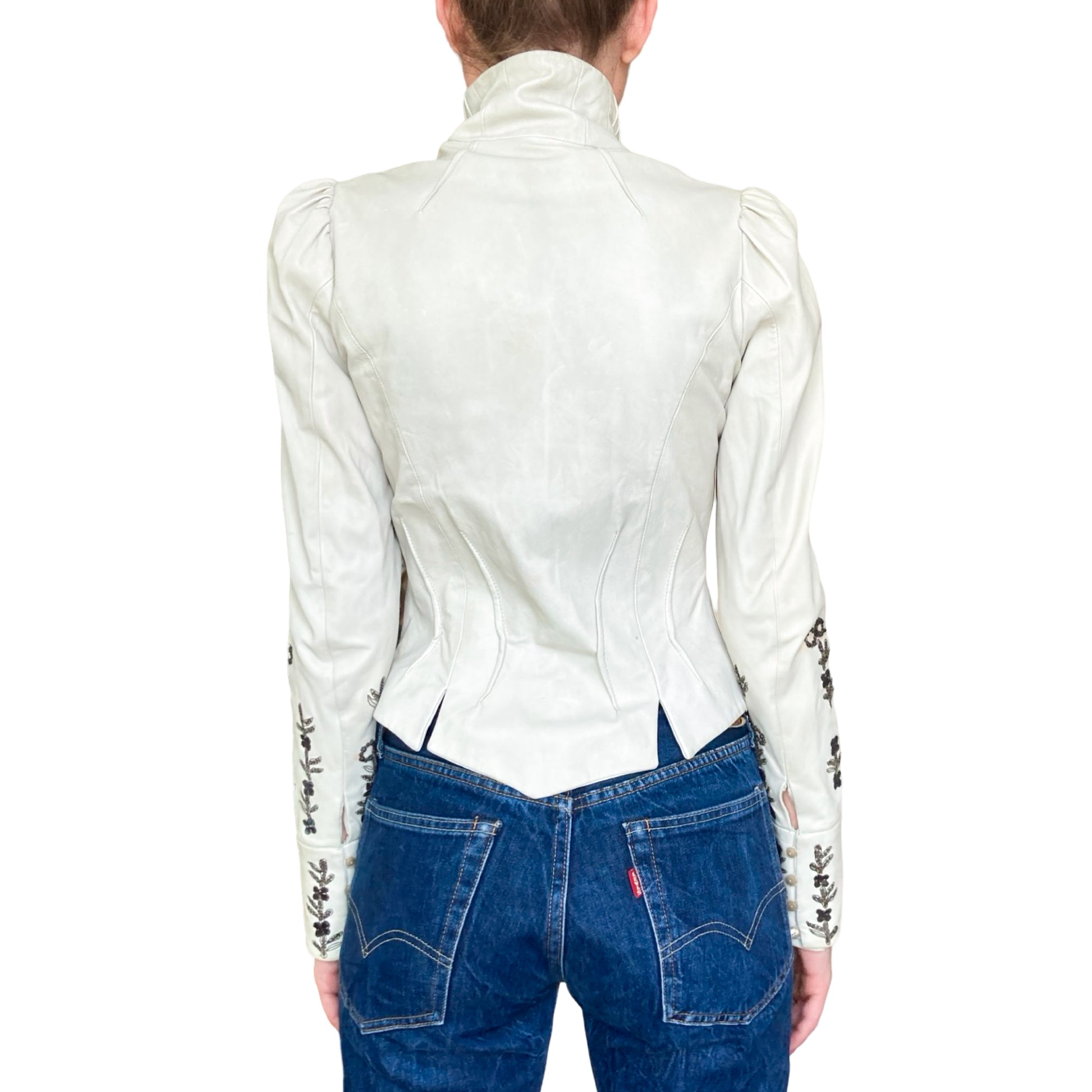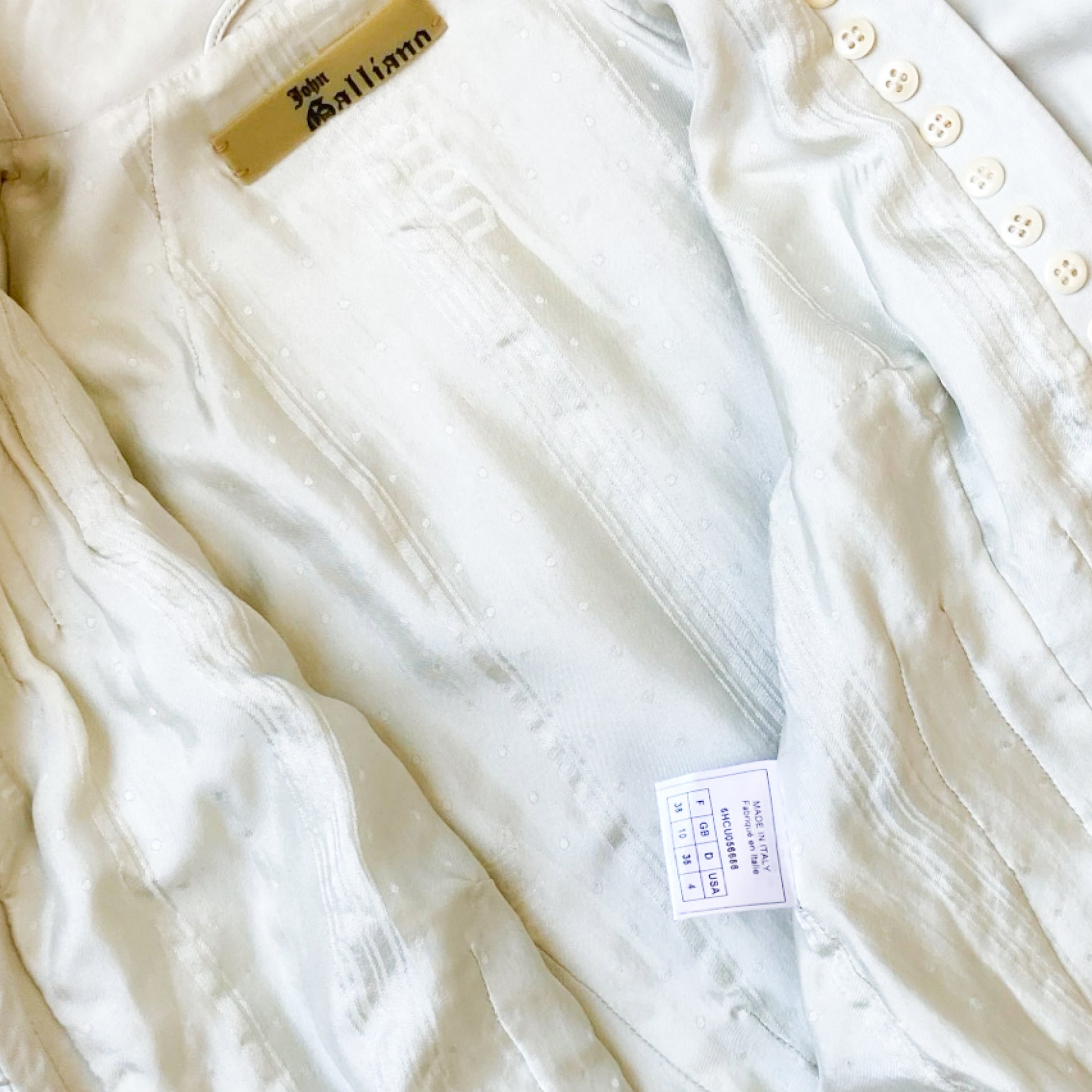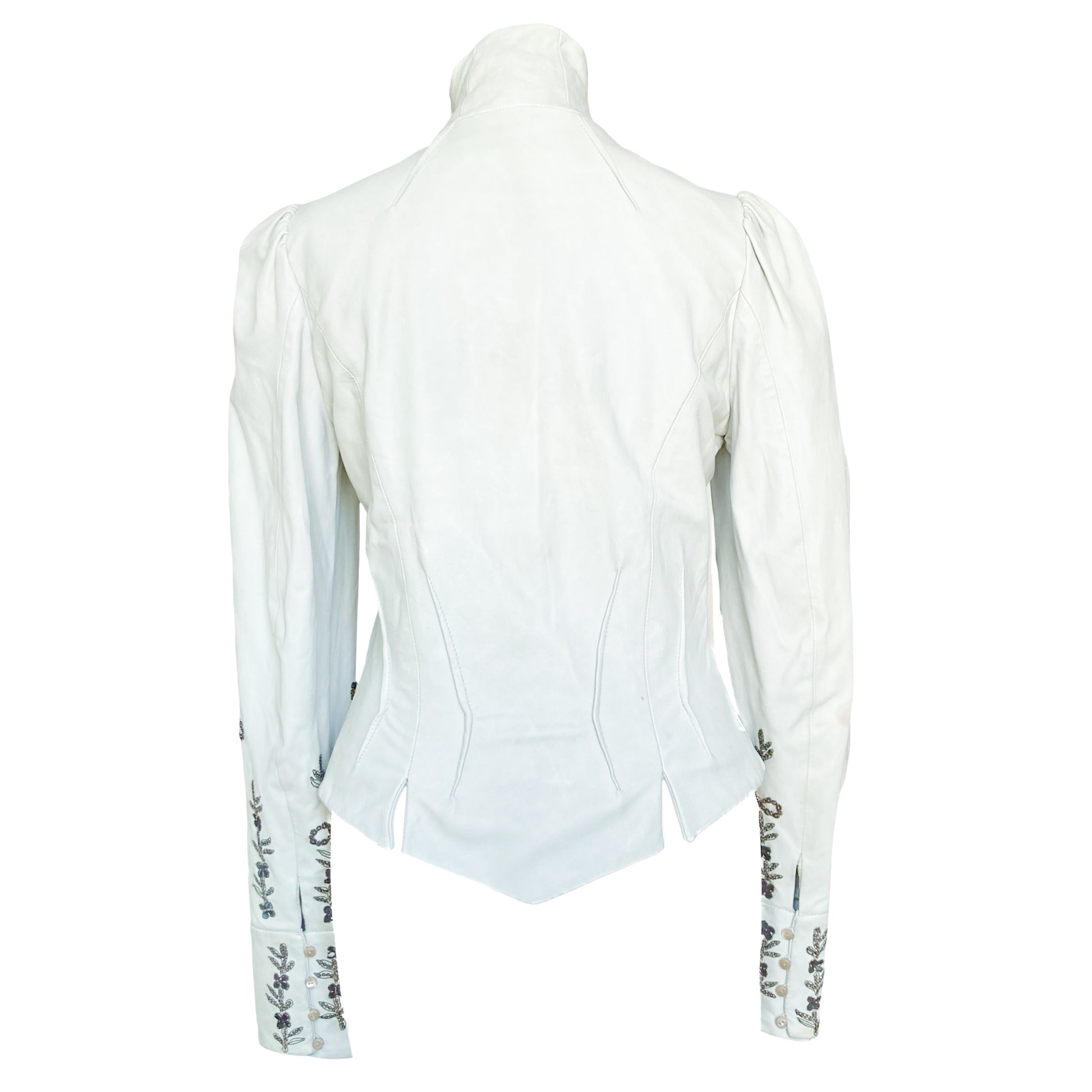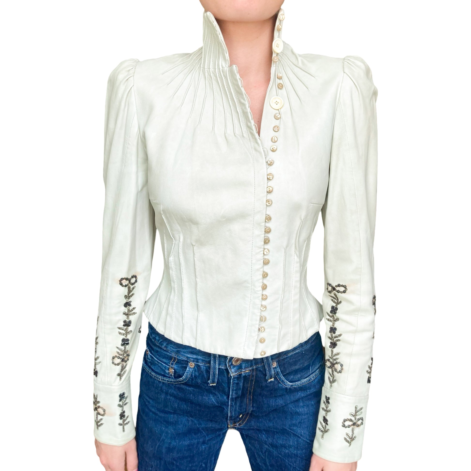 Unique lamb leather jacket from Galliano Fall/Winter 2006 collection as seen on the runway. This piece showcases a Off-white leather, tailored to perfection with a fitted silhouette that highlights the waist. Detailed metallic embroidery runs along the sleeves & the jacket is closing with signed buttons on the front ( different buttons is part of the design) , adding an artistic flair to the minimalist color. Just insanely rare, impossible to find. All lined with silk printed with a tone on tone gazette print.