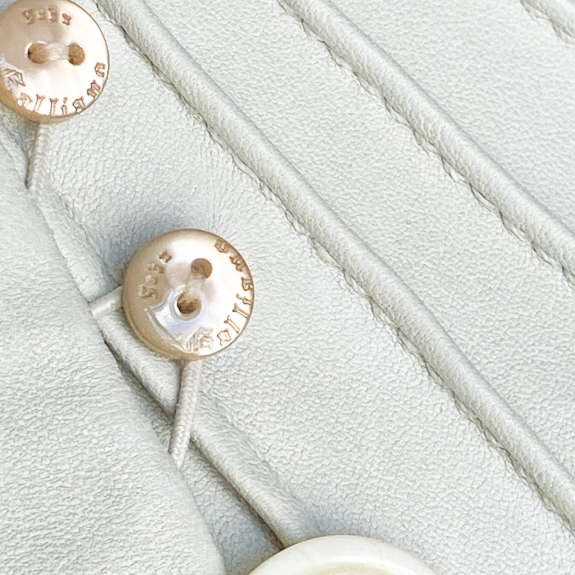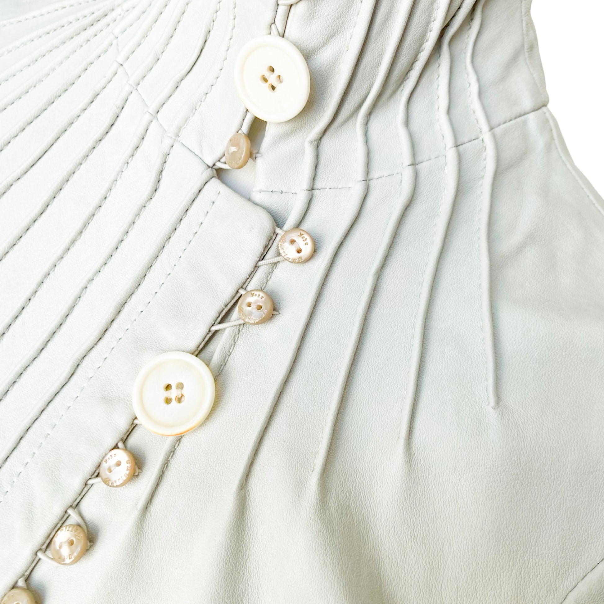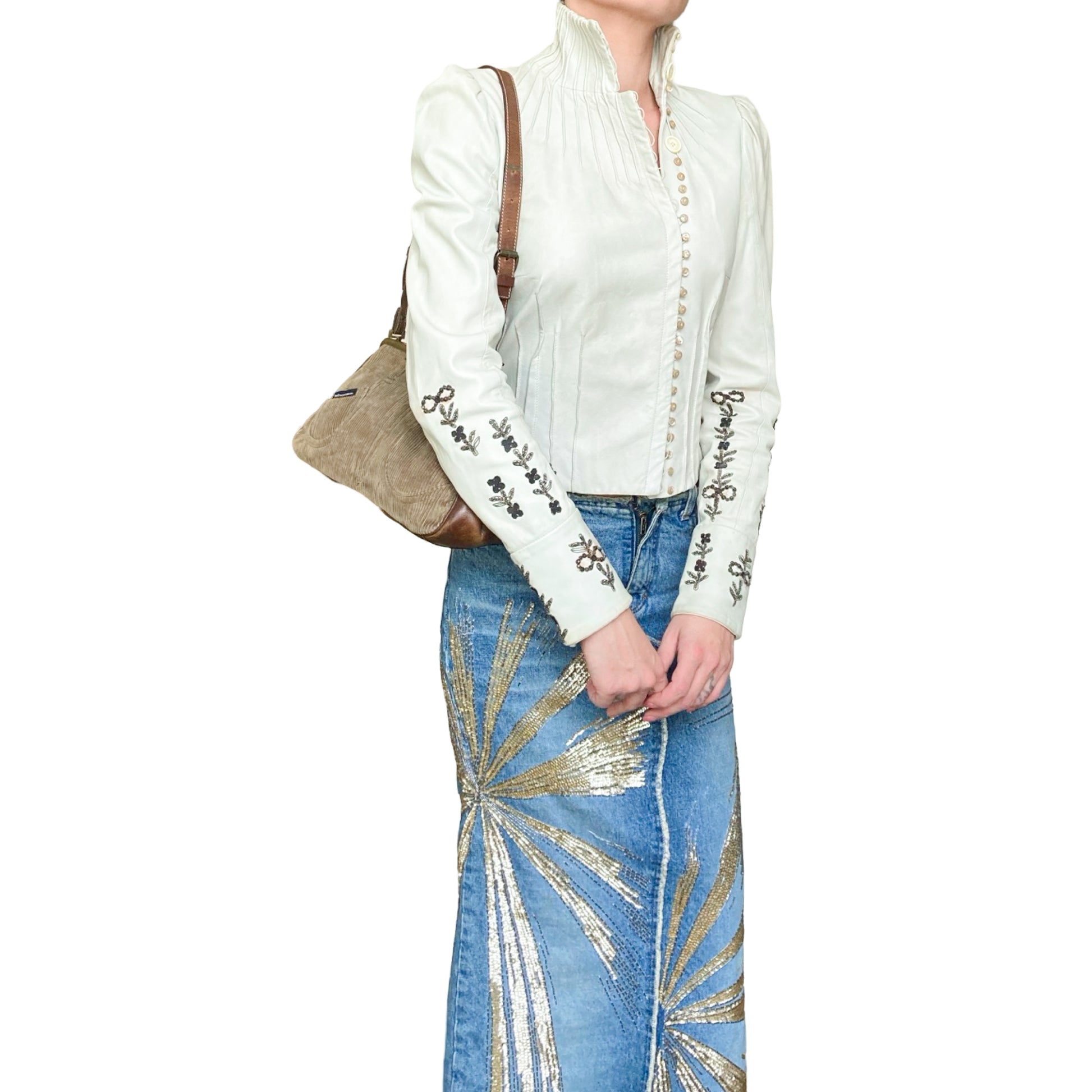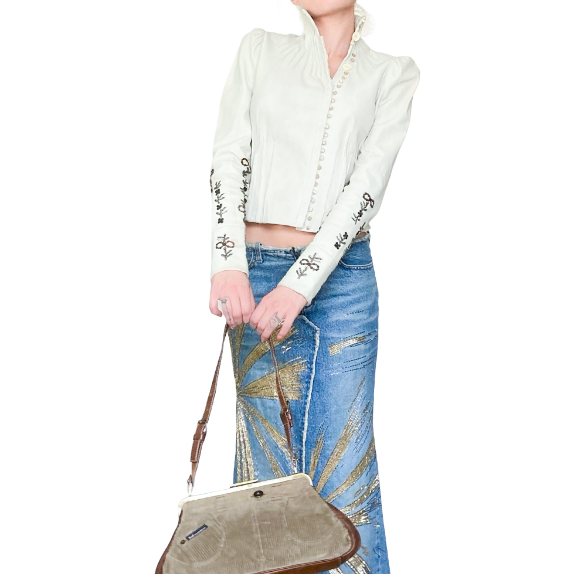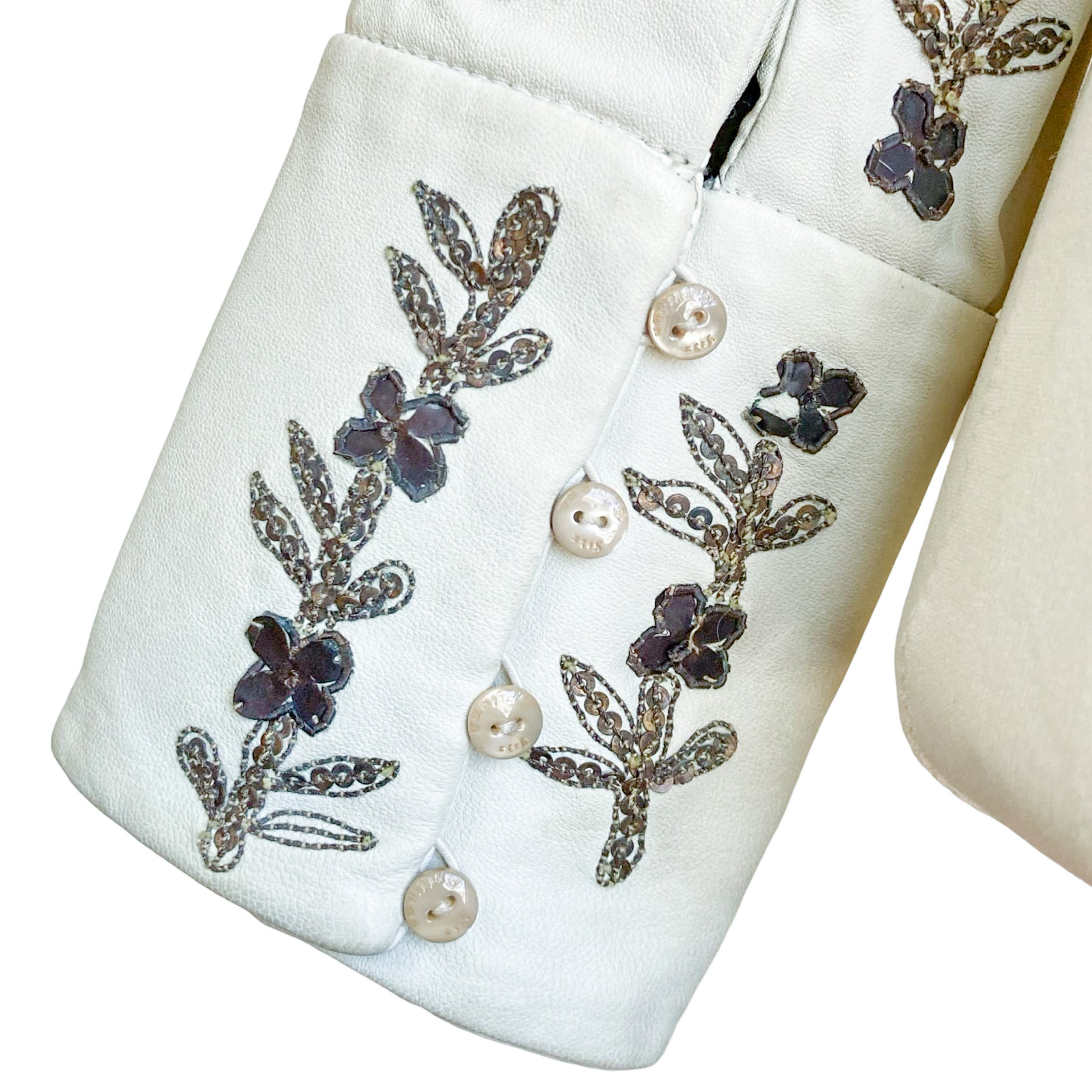 Unique lamb leather jacket from Galliano Fall/Winter 2006 collection as seen on the runway. This piece showcases a Off-white leather, tailored to perfection with a fitted silhouette that highlights the waist. Detailed metallic embroidery runs along the sleeves & the jacket is closing with signed buttons on the front ( different buttons is part of the design) , adding an artistic flair to the minimalist color. Just insanely rare, impossible to find. All lined with silk printed with a tone on tone gazette print.