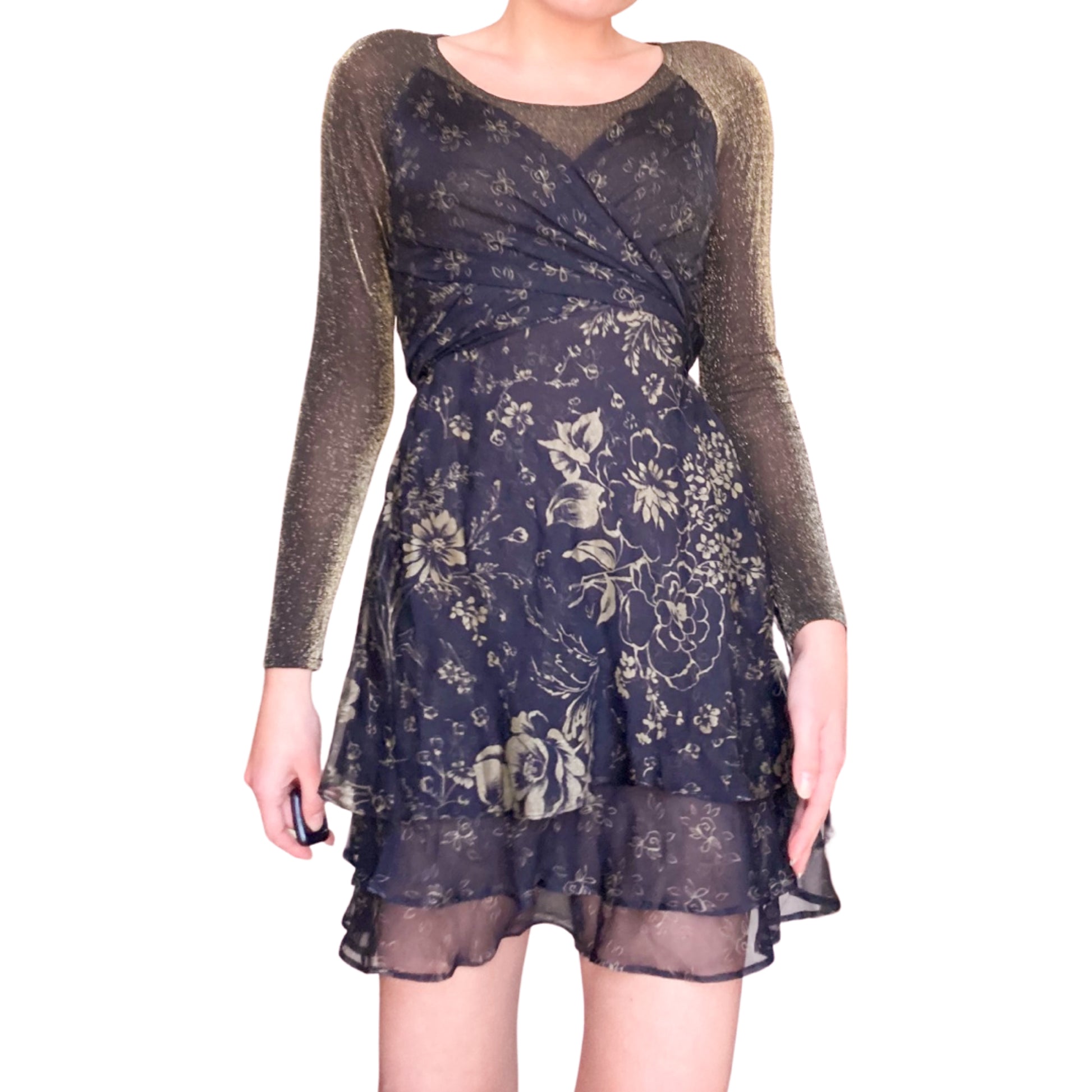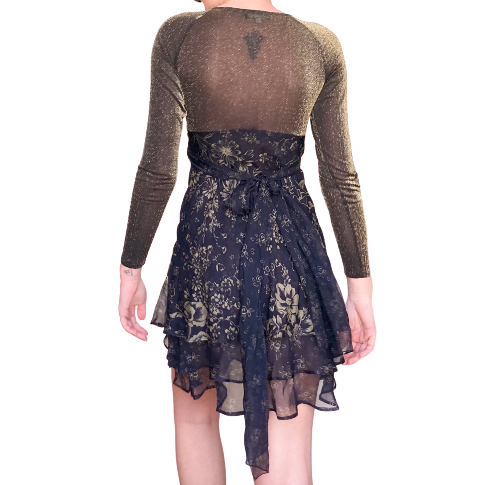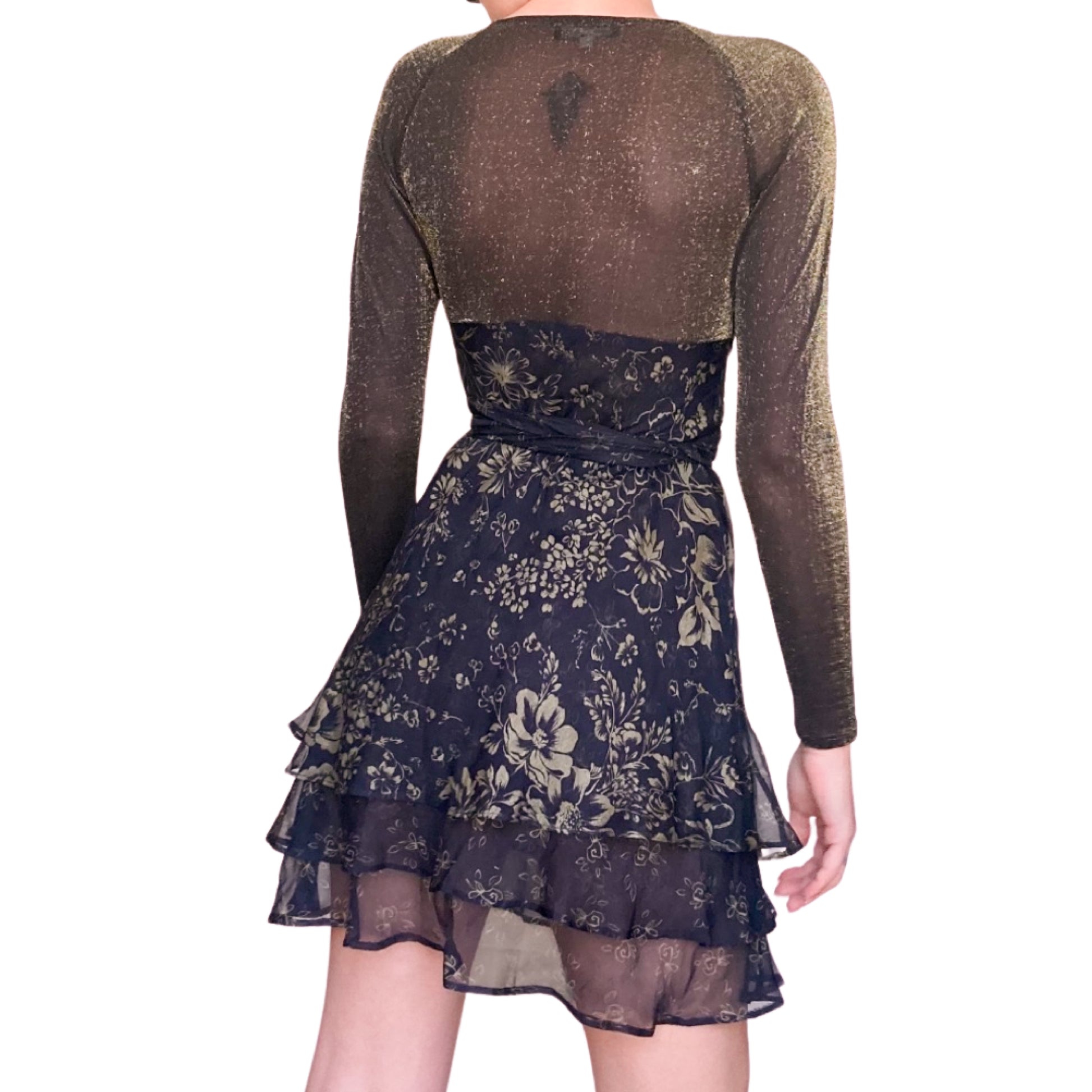 Mini dress with wrapping on front, long sleeves & lurex chest & sleeves. Incredible floral golden print on black silk. Multiple layers of silk sheer fabric et beautiful feminine cut. The dress was seen on the Fall Winter runway the 1994 collection.
