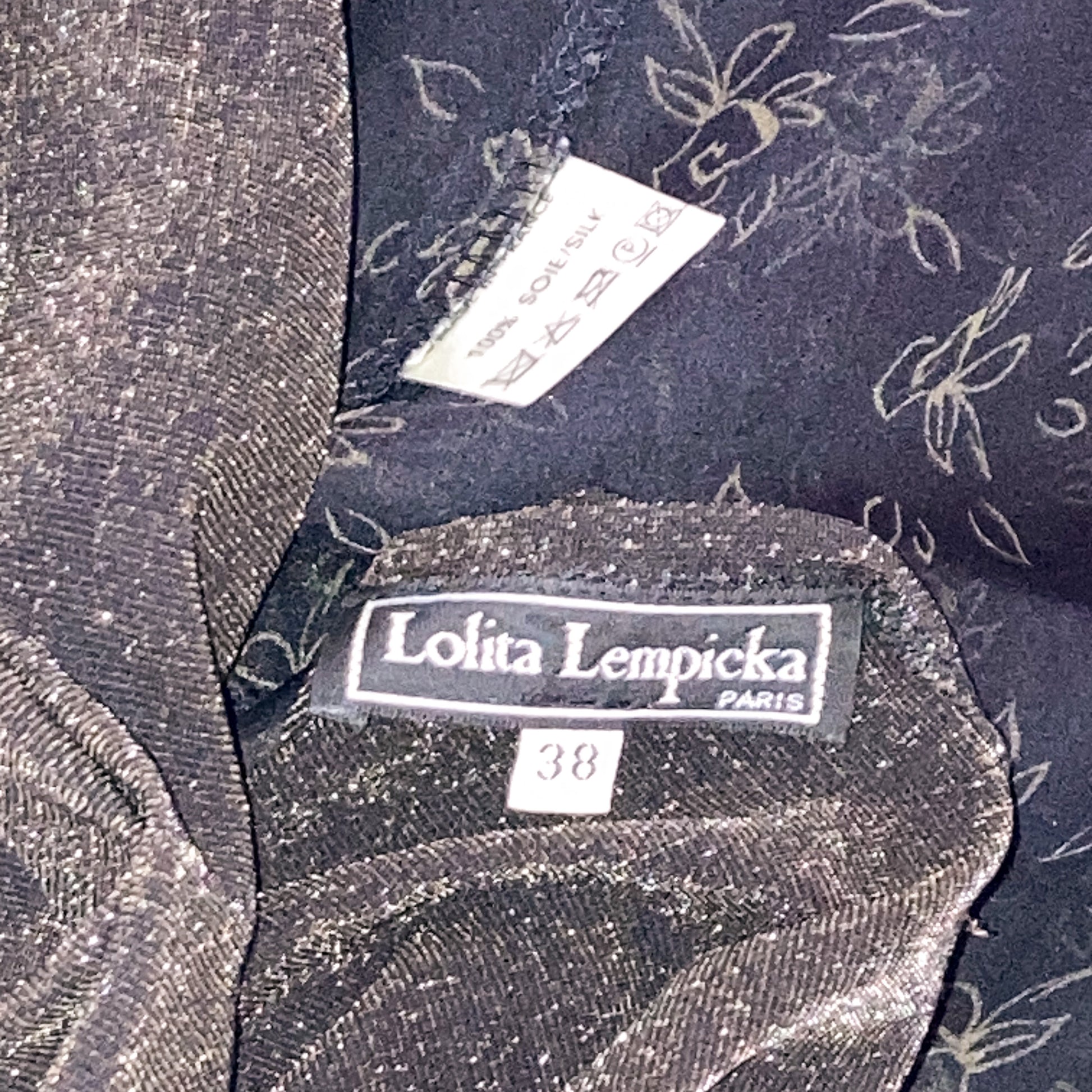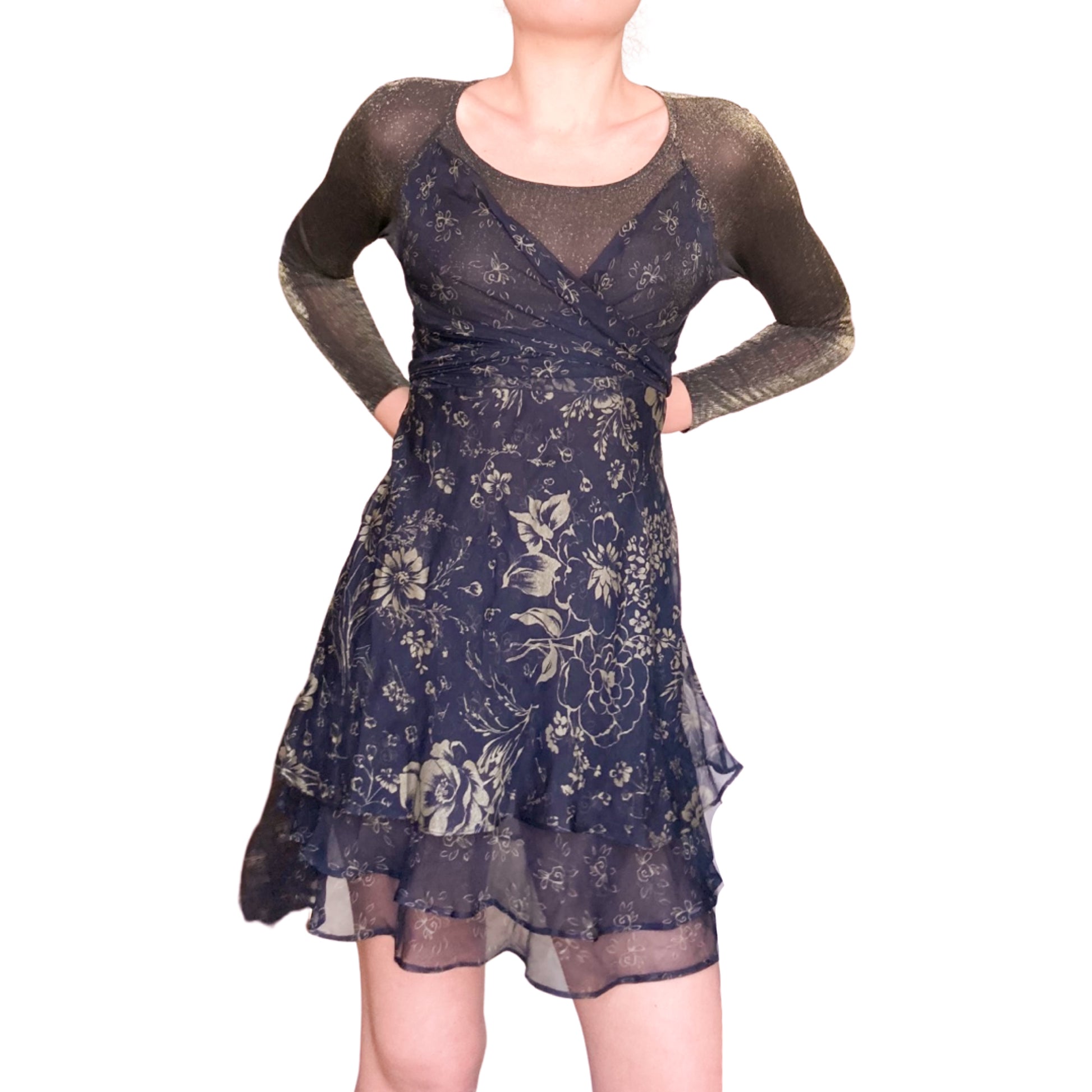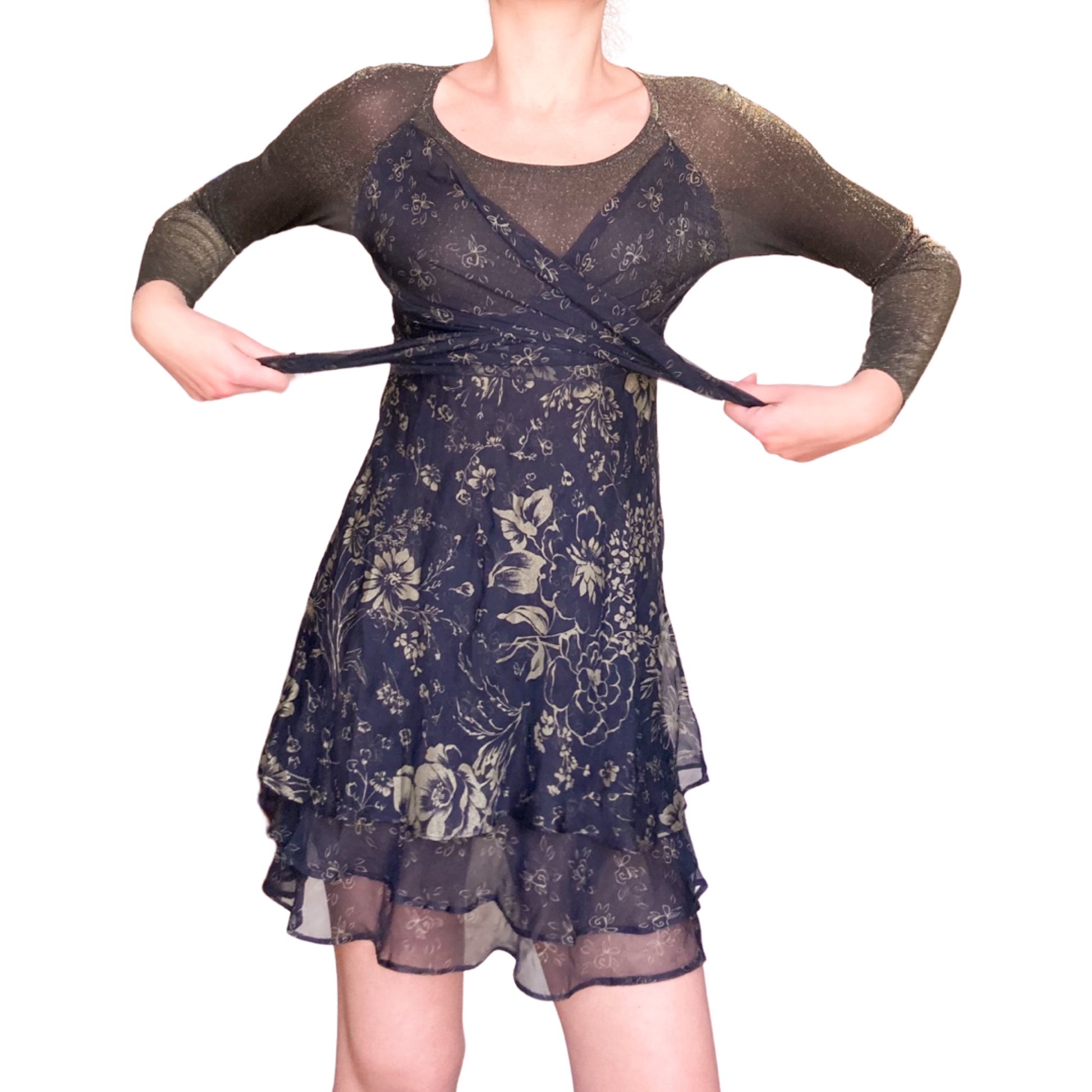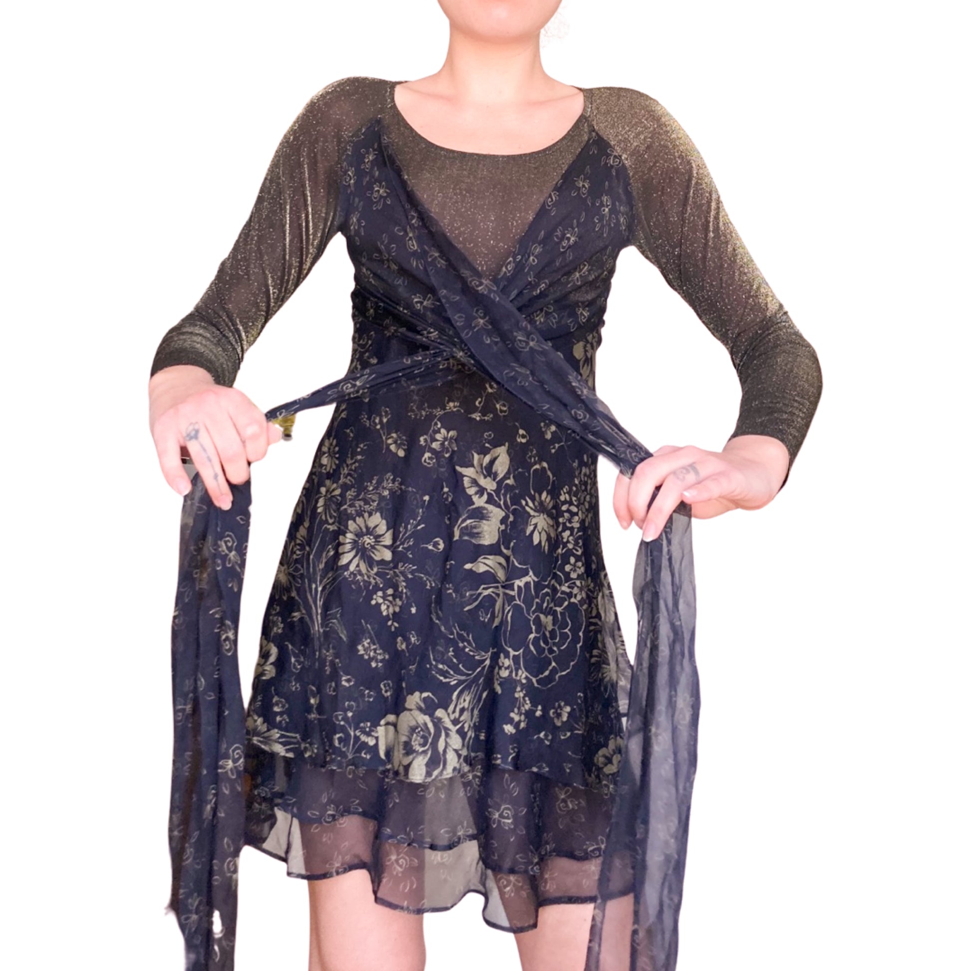 Mini dress with wrapping on front, long sleeves & lurex chest & sleeves. Incredible floral golden print on black silk. Multiple layers of silk sheer fabric et beautiful feminine cut. The dress was seen on the Fall Winter runway the 1994 collection.