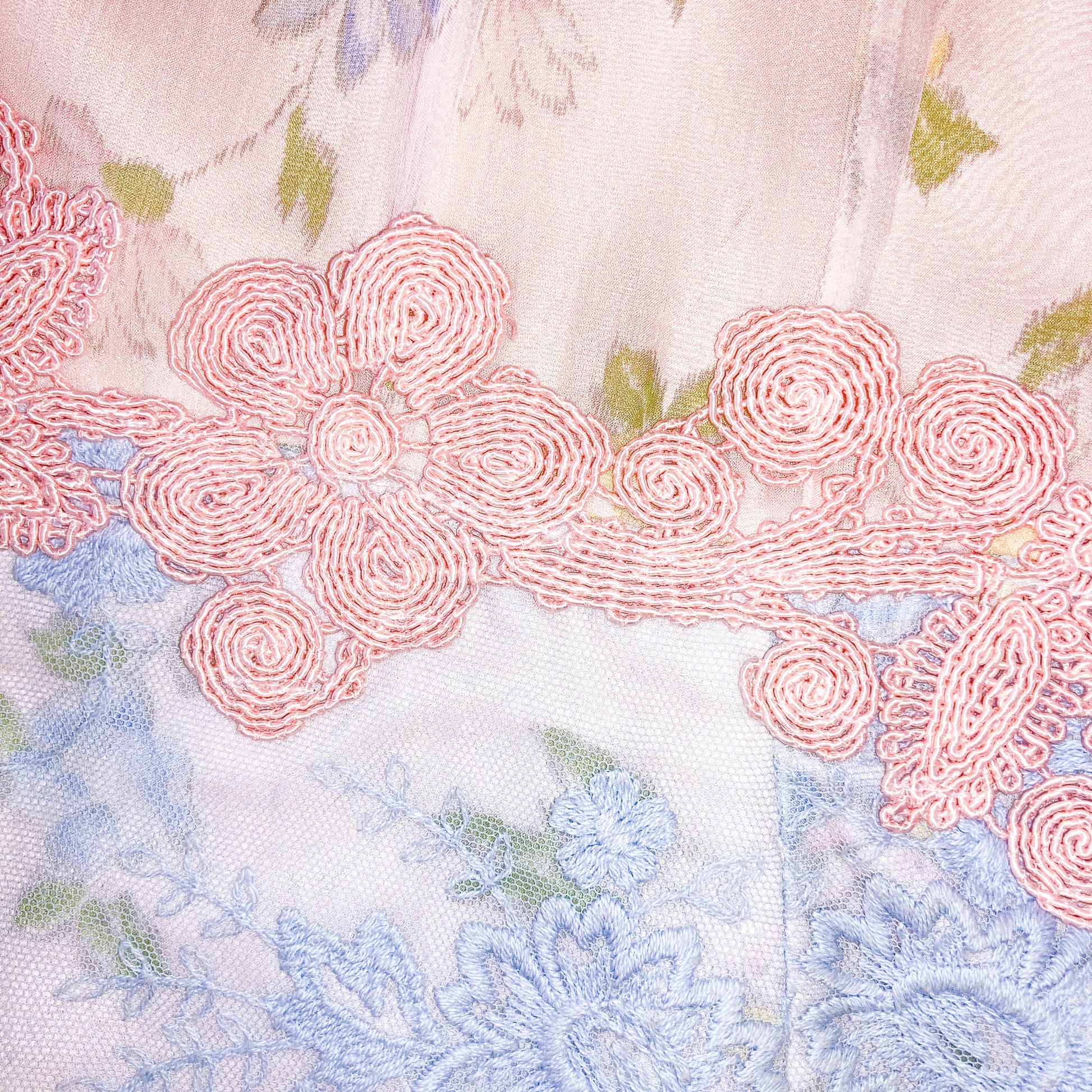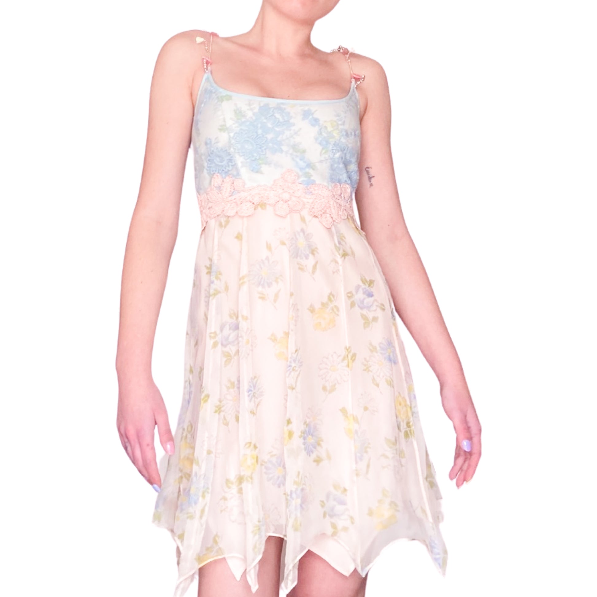 Ultimate daddy's girl dress. She is made with 100% silk. The bust is floral printed silk covered by french baby blue lace. The rest of the dress its creamy flowers print. The bottom of the dress is cut like a fairy dress. Can we talk about the straps ? They are embellished with ceramic, glass & beads jewelry. She is the rarest dress from the brand, & her condition is pristine. She is on the spring summer 1995 runway on full baby blue color.