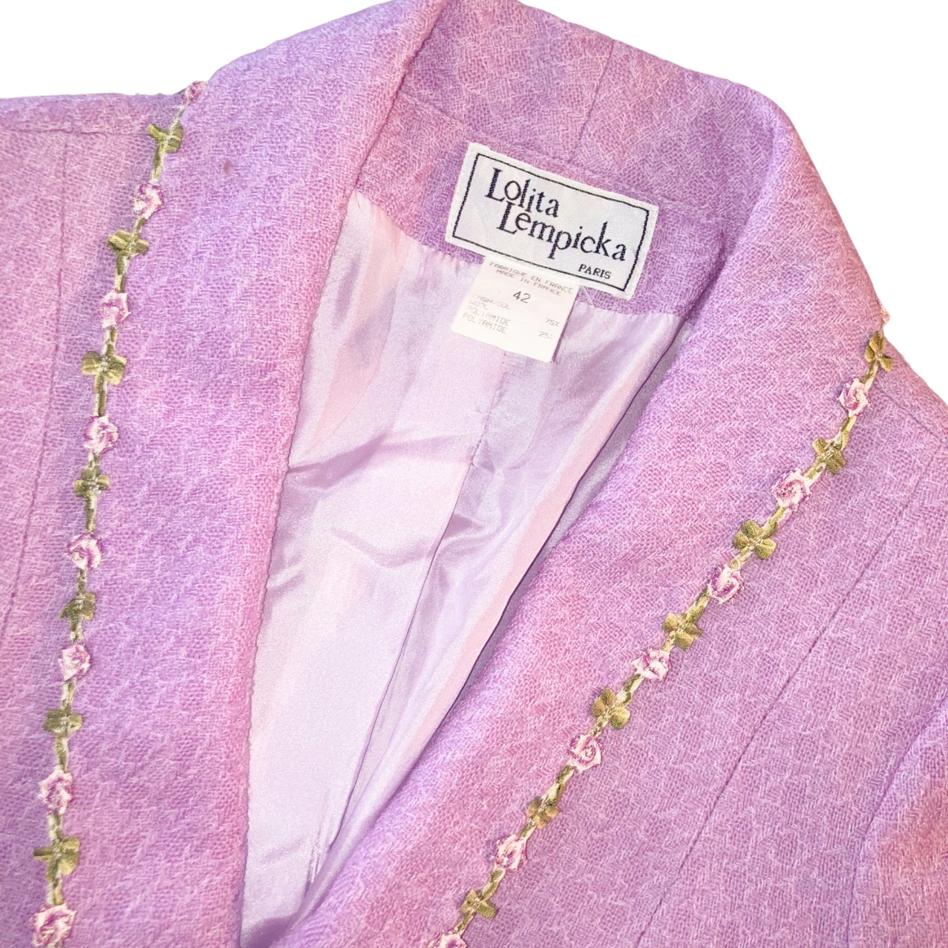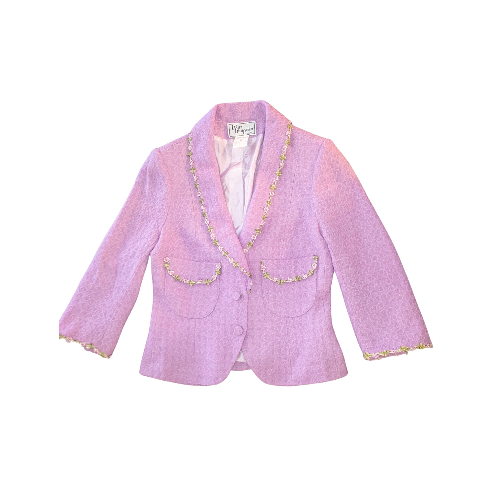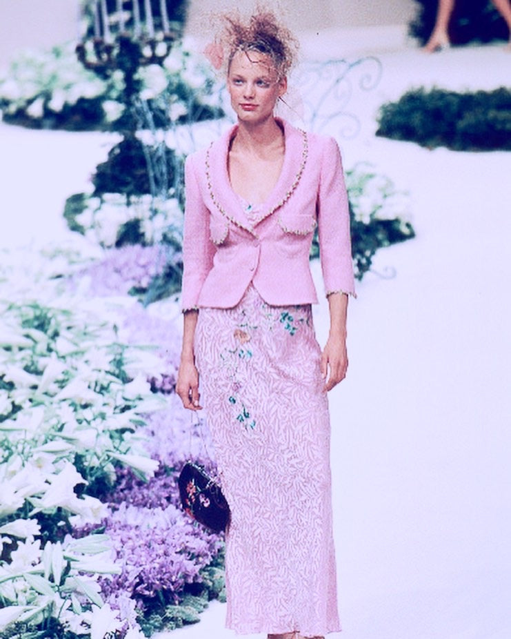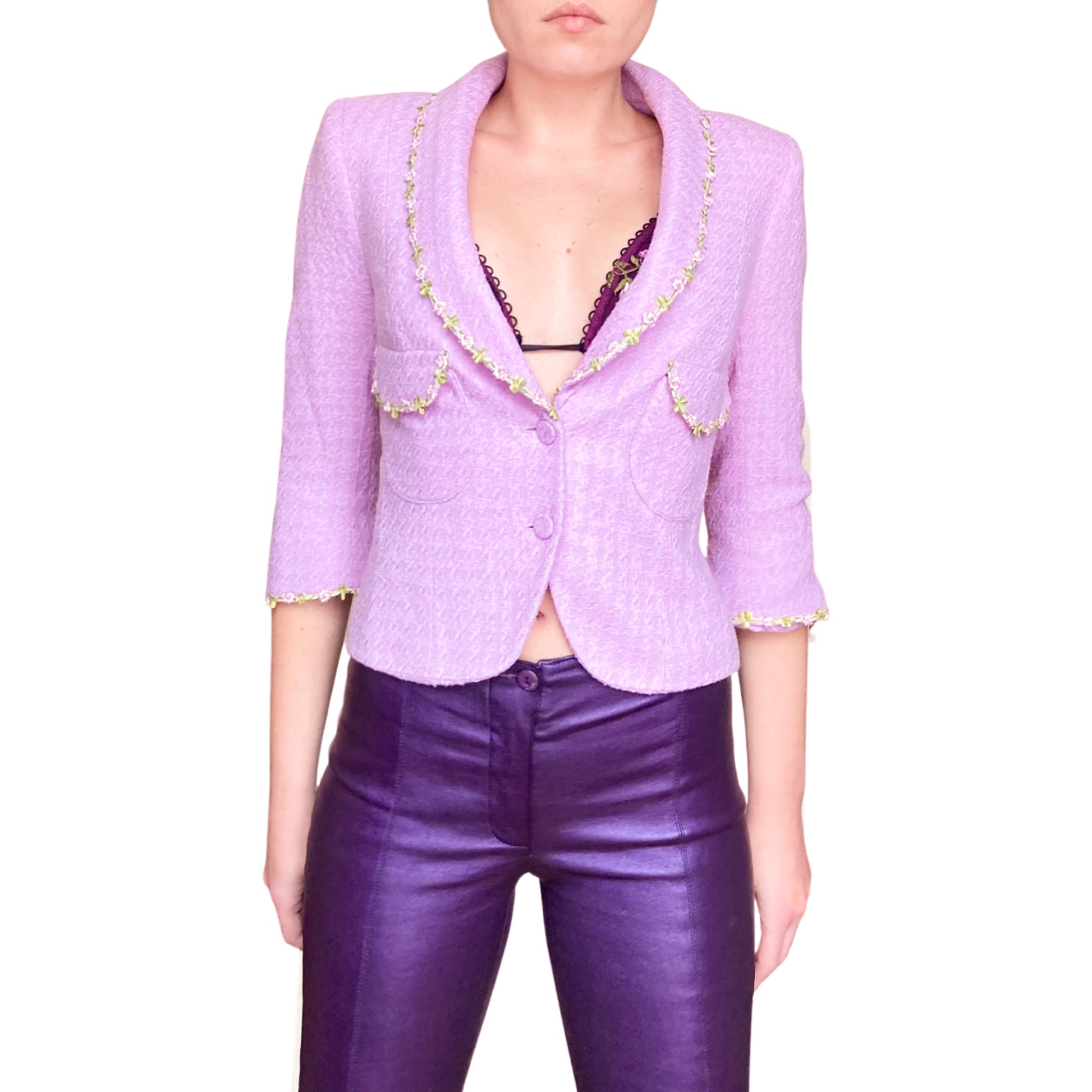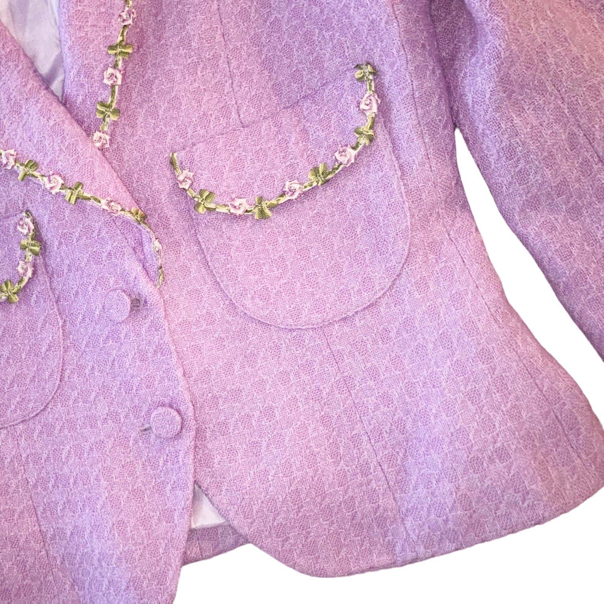 From the 1999 Spring Summer collection, seen on the runway. Dreamy wool jackets embellished with flowers & leaves embroideries. Fitted cut, long sleeves, wide collar, button line on front. The work on fabric is just unbelievable, these are several layers of wool on top of each other. I'd say it's not pink, it's not purple, it's a divine cold pink color. Vintage rare knit dream. Impossible to find anywhere.