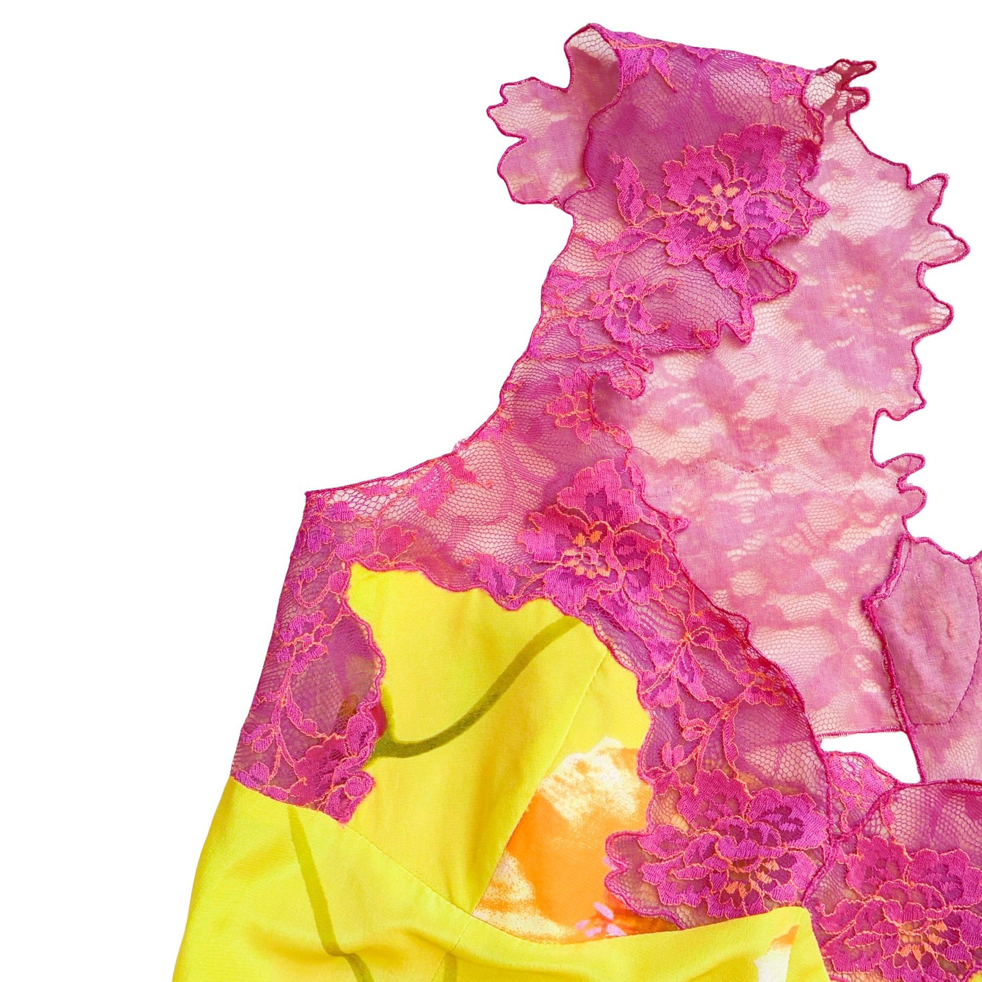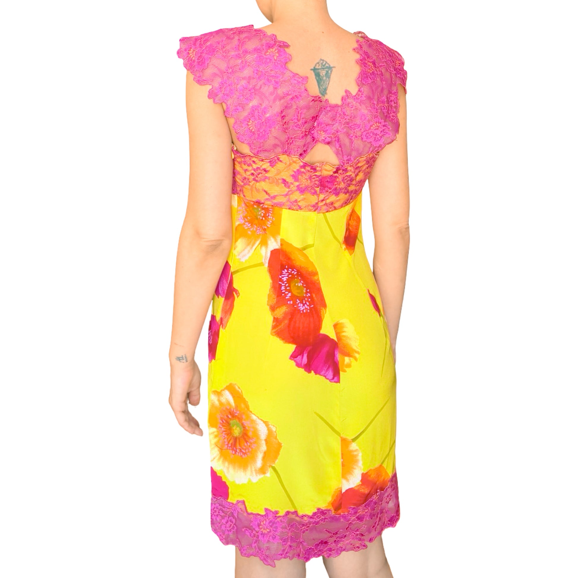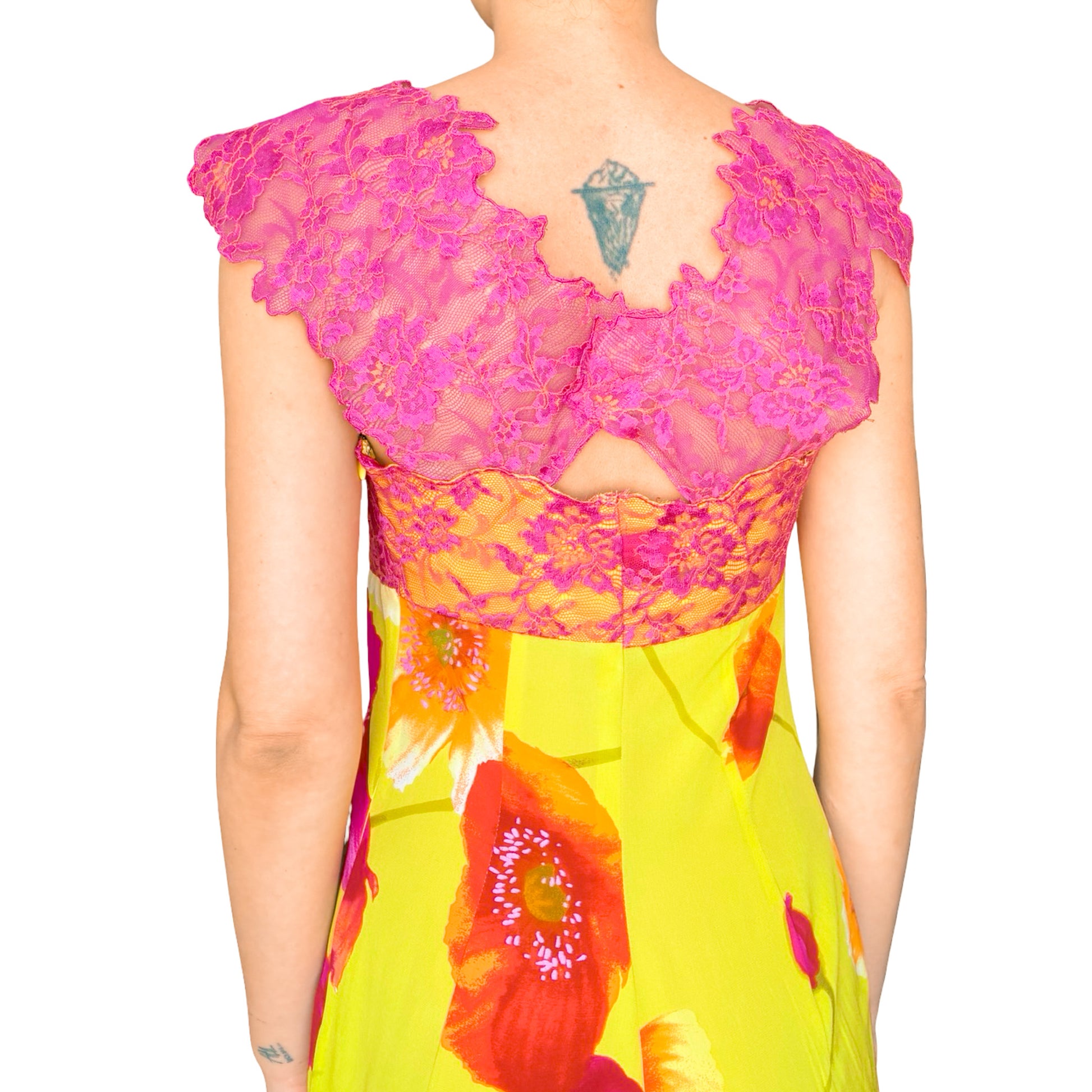 Runway dress from Mariella Burani Spring 2005, crafted in saturated silk floral print with luxurious lace inserts. The design features wide lace panels at the neckline continuing into the back, meeting at the center to create an open lace effect. Matching lace trim at the hem and along a slit detail adds transparency. A rare early 2000s Burani piece with bold color and refined construction.