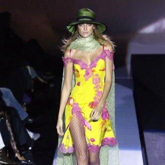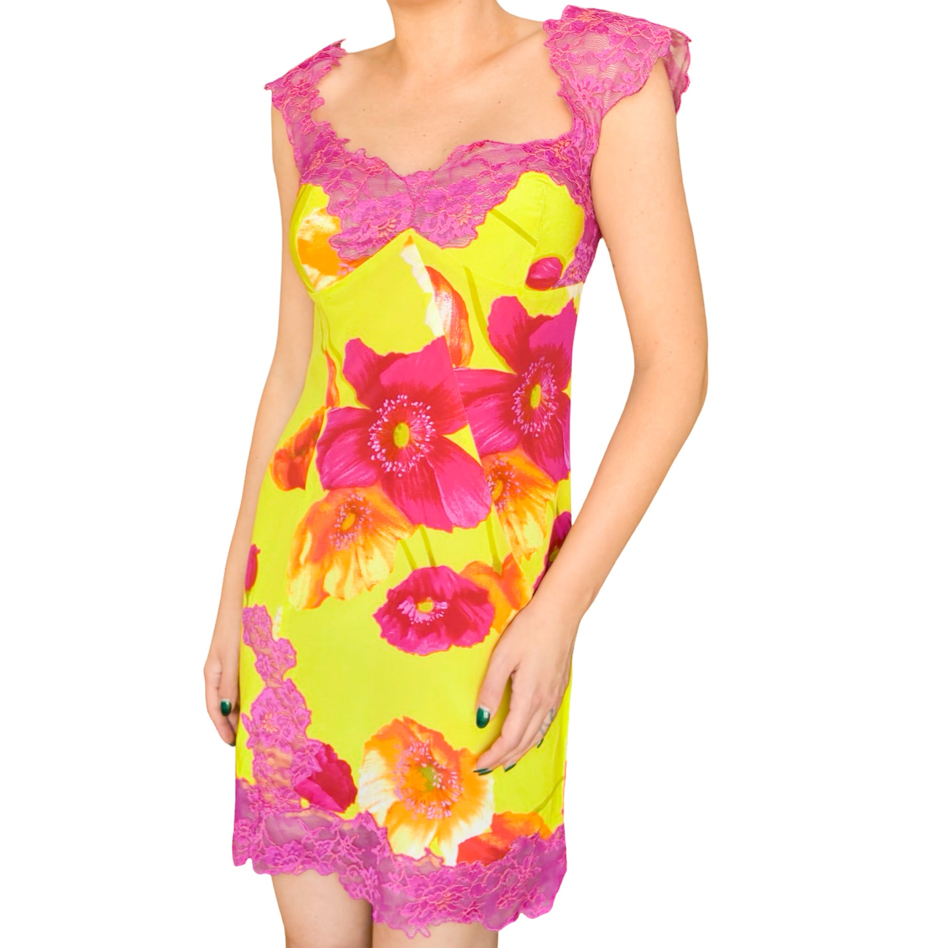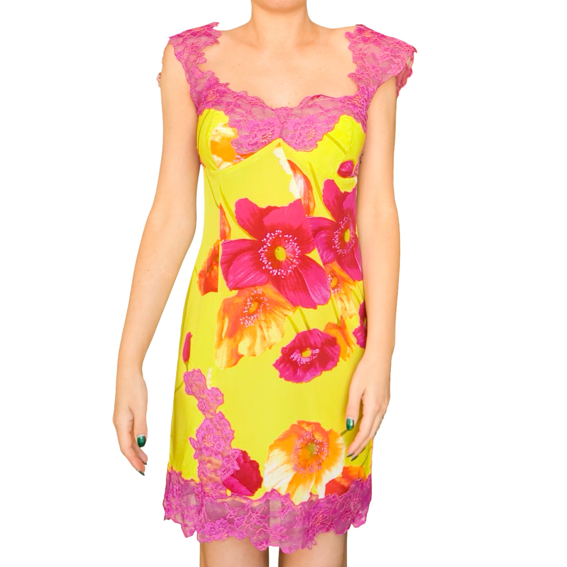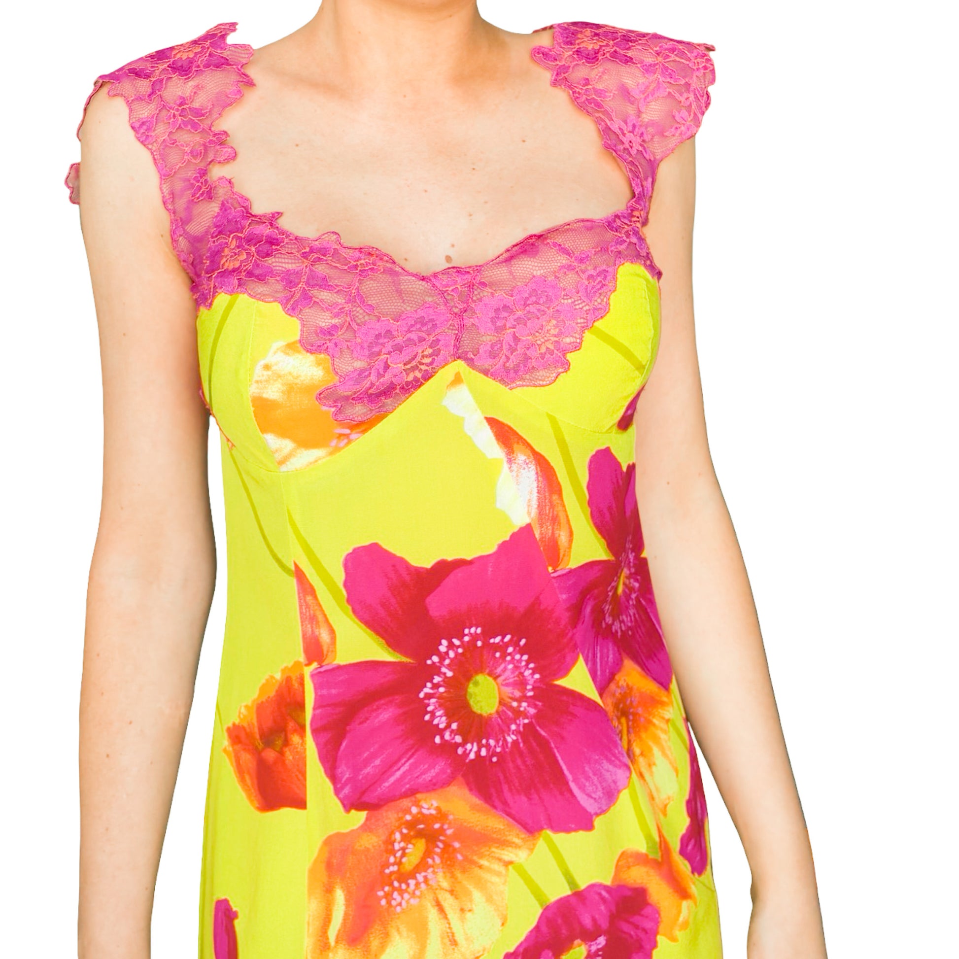 Runway dress from Mariella Burani Spring 2005, crafted in saturated silk floral print with luxurious lace inserts. The design features wide lace panels at the neckline continuing into the back, meeting at the center to create an open lace effect. Matching lace trim at the hem and along a slit detail adds transparency. A rare early 2000s Burani piece with bold color and refined construction.