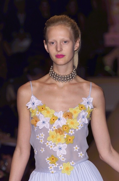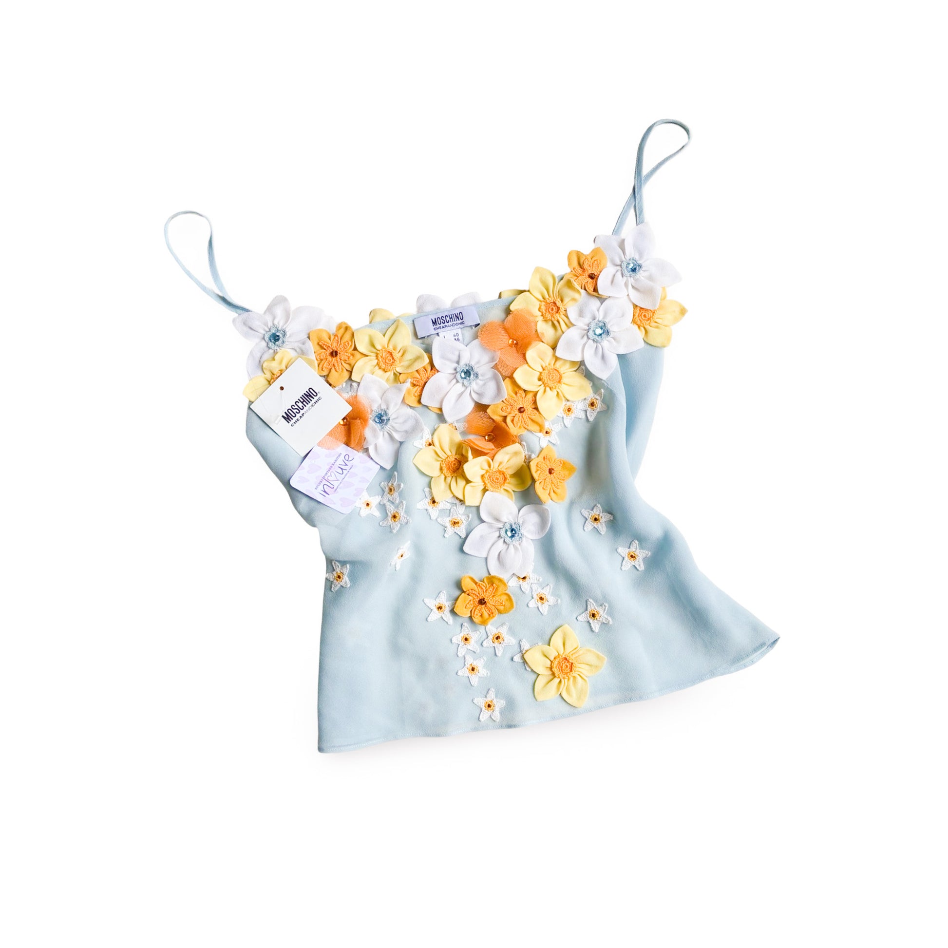 Moschino Cheap & Chic Spring 2001 silk top in sheer pastel blue, adorned with a profusion of three-dimensional daffodils and daisies in soft yellow, white, and tangerine. The playful floral appliqués are accented with light blue crystal centers and layered tulle petals, creating a whimsical yet romantic garden effect. Fitted silhouette with a flattering V-neck and delicate straps. Deadstock with original tags – a true archival gem seen on the runway