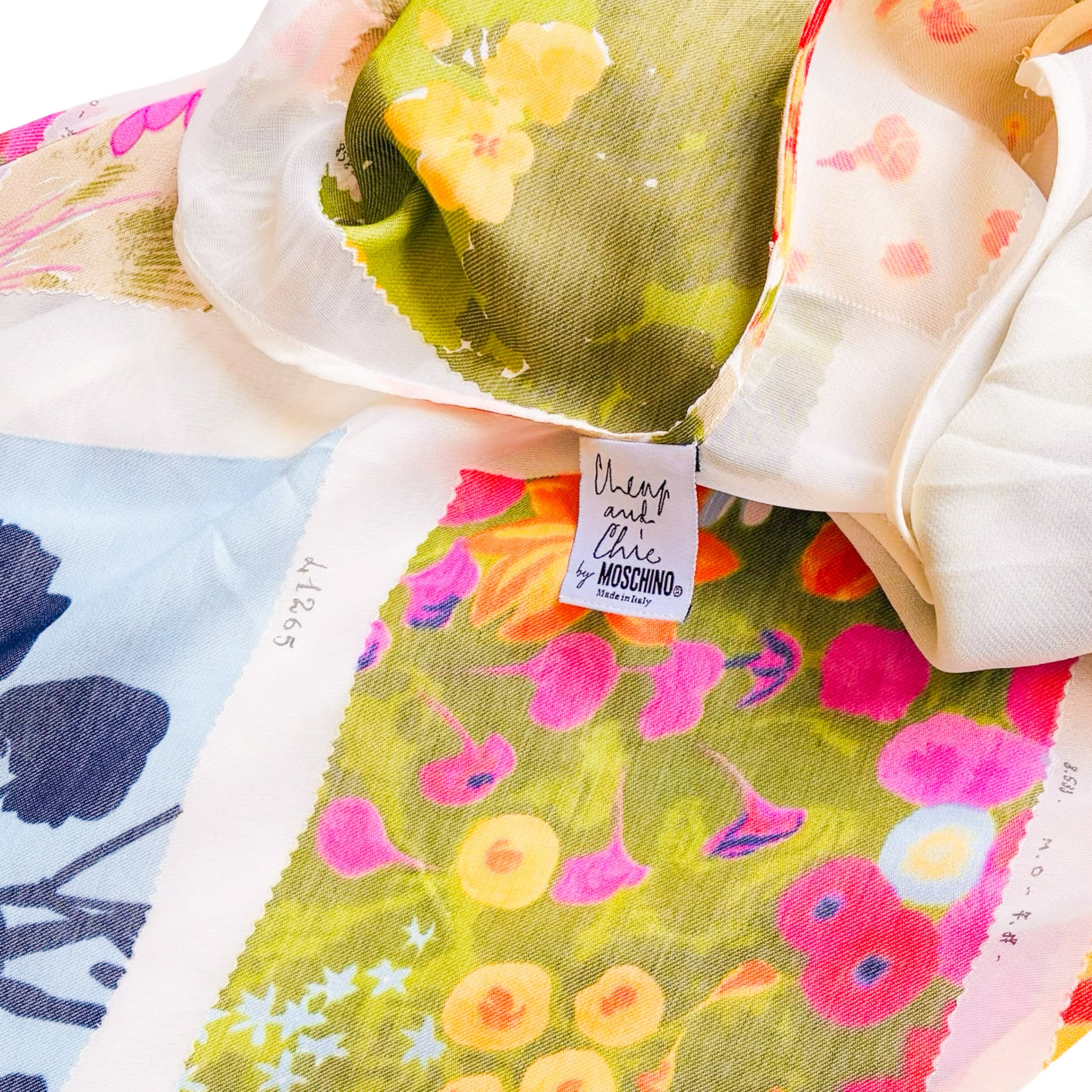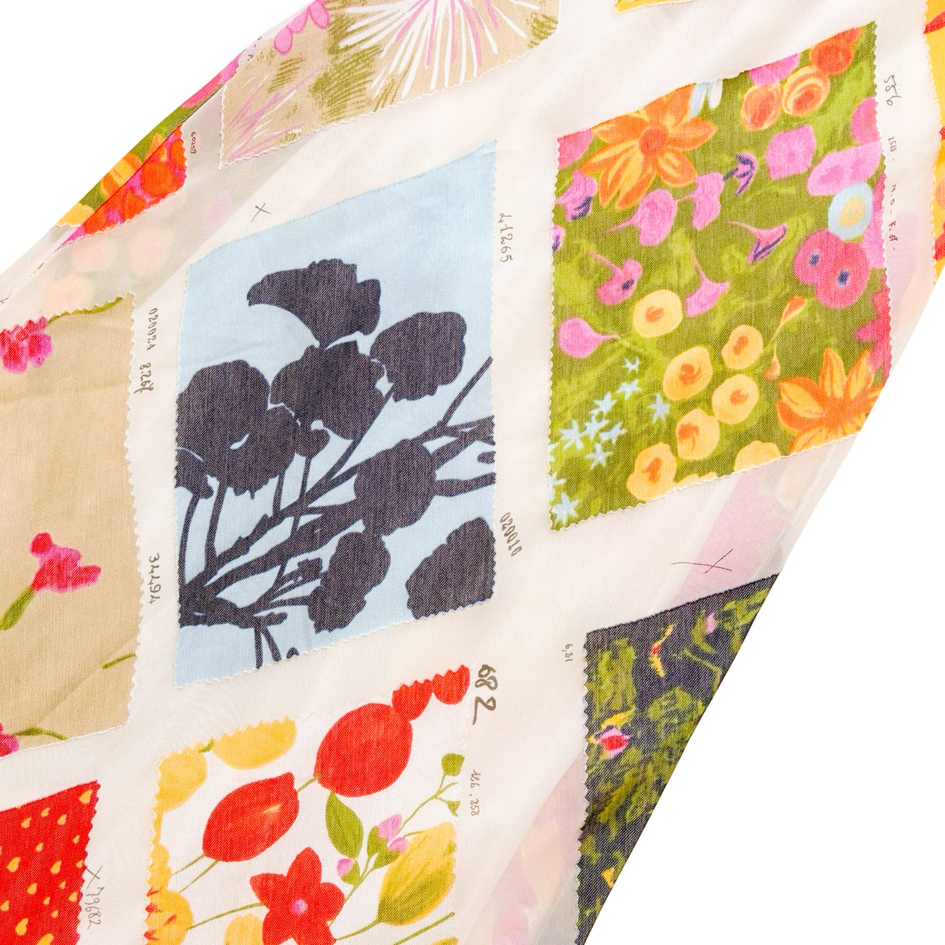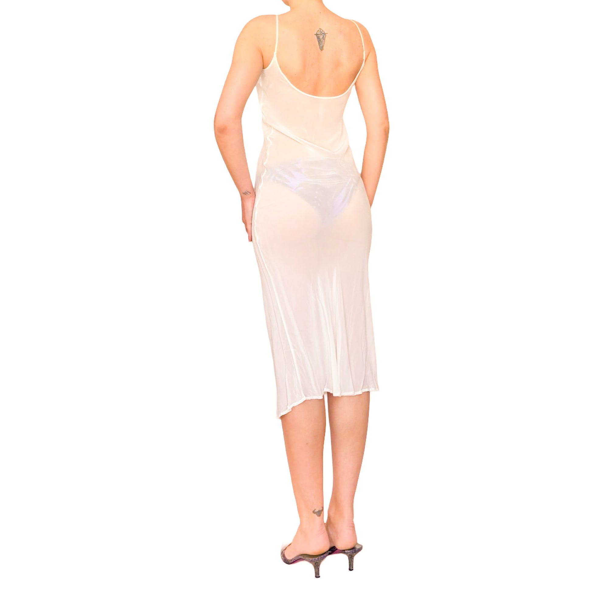 Rare 1990s dress from Moschino’s Cheap and Chic line. Constructed from a sheer white mesh base with applied floral fabric panels arranged in a patchwork collage. Each panel features printed codes and markings that mimic textile archive samples — a playful, conceptual take typical of Moschino’s visual irony. Cut on the bias for a naturally flattering, body-skimming silhouette. Low scoop back, slight flare at the hem, very limited stretch. No zips or buttons — just jump in. Comes with its original ivory slip dress. Visually unique, collectible, and meticulously constructed.