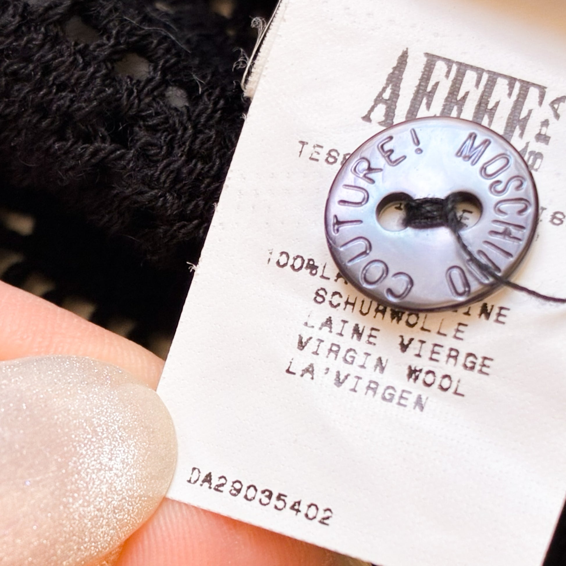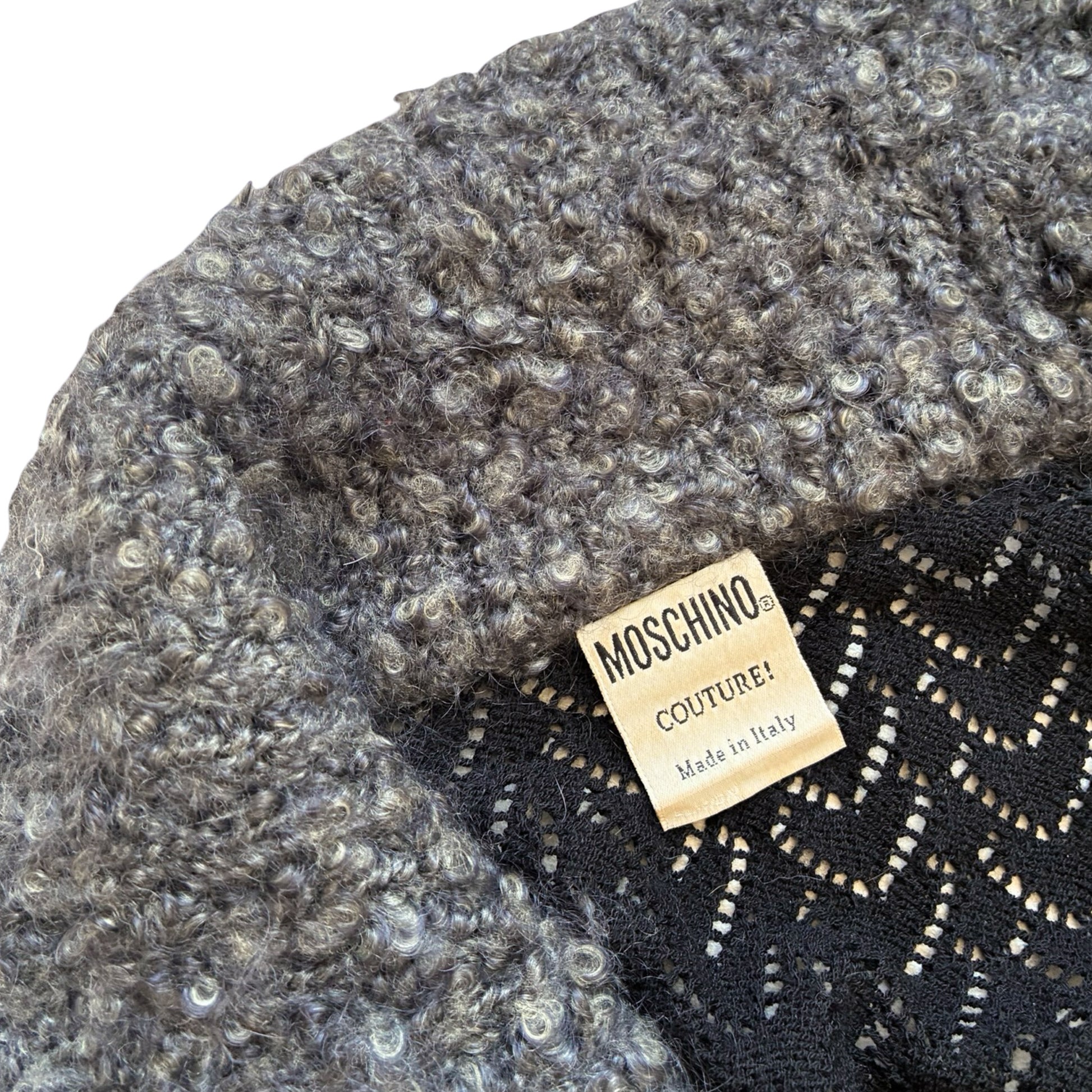 A virgin-wool crochet cardigan featuring a heart-shaped open-knit pattern, framed by contrasting bouclé wool at the collar and cuffs. Finished with Moschino Couture buttons and a fitted, lightweight silhouette.