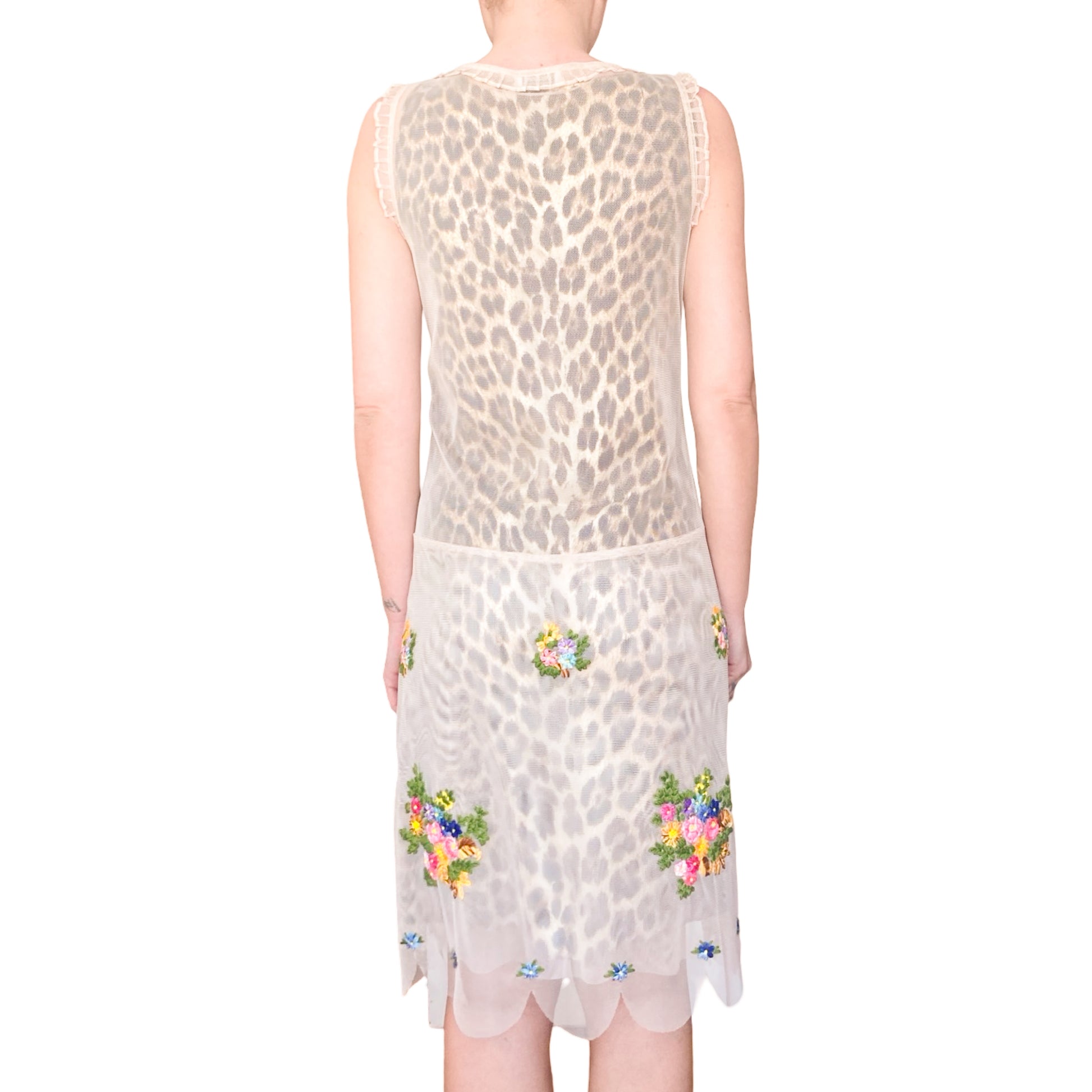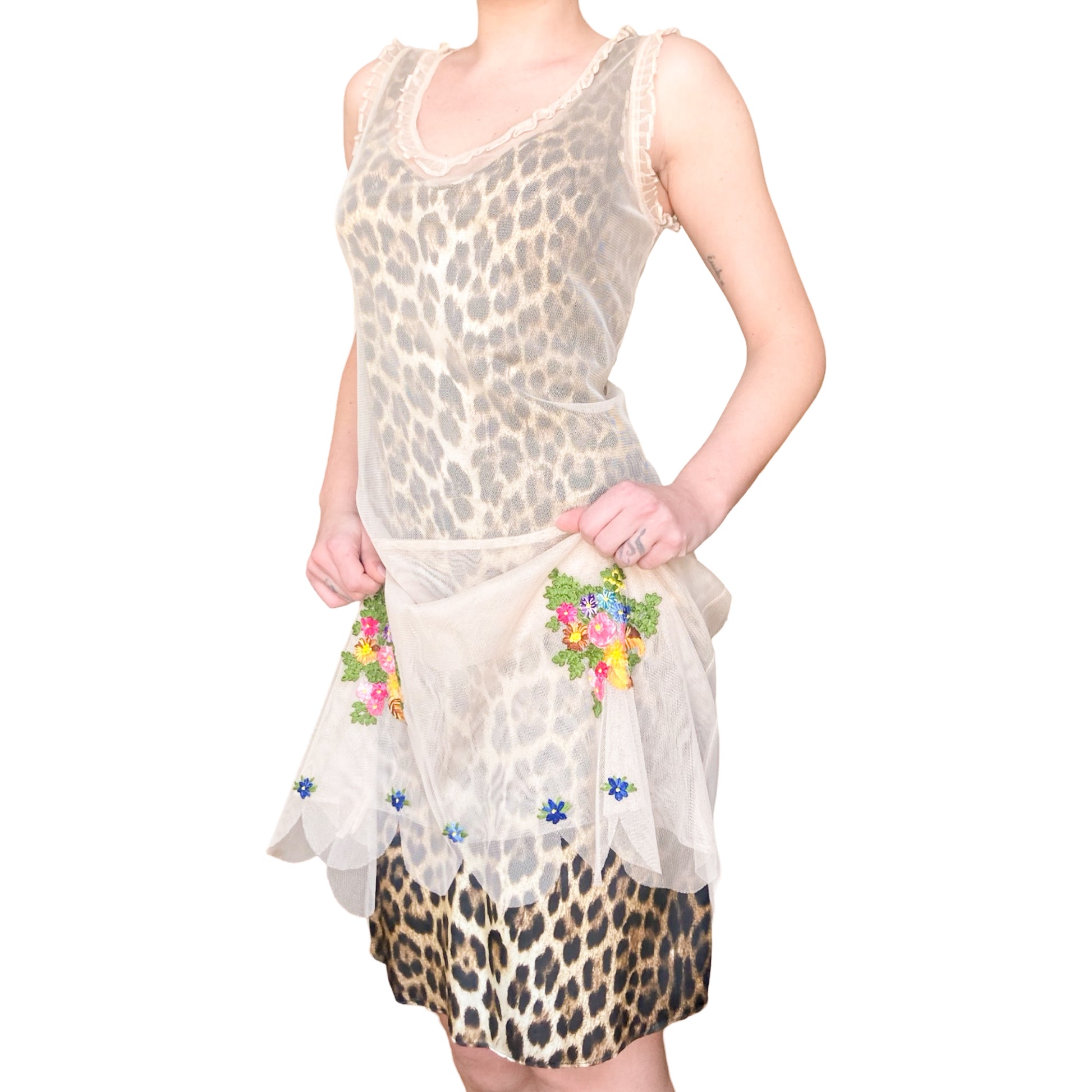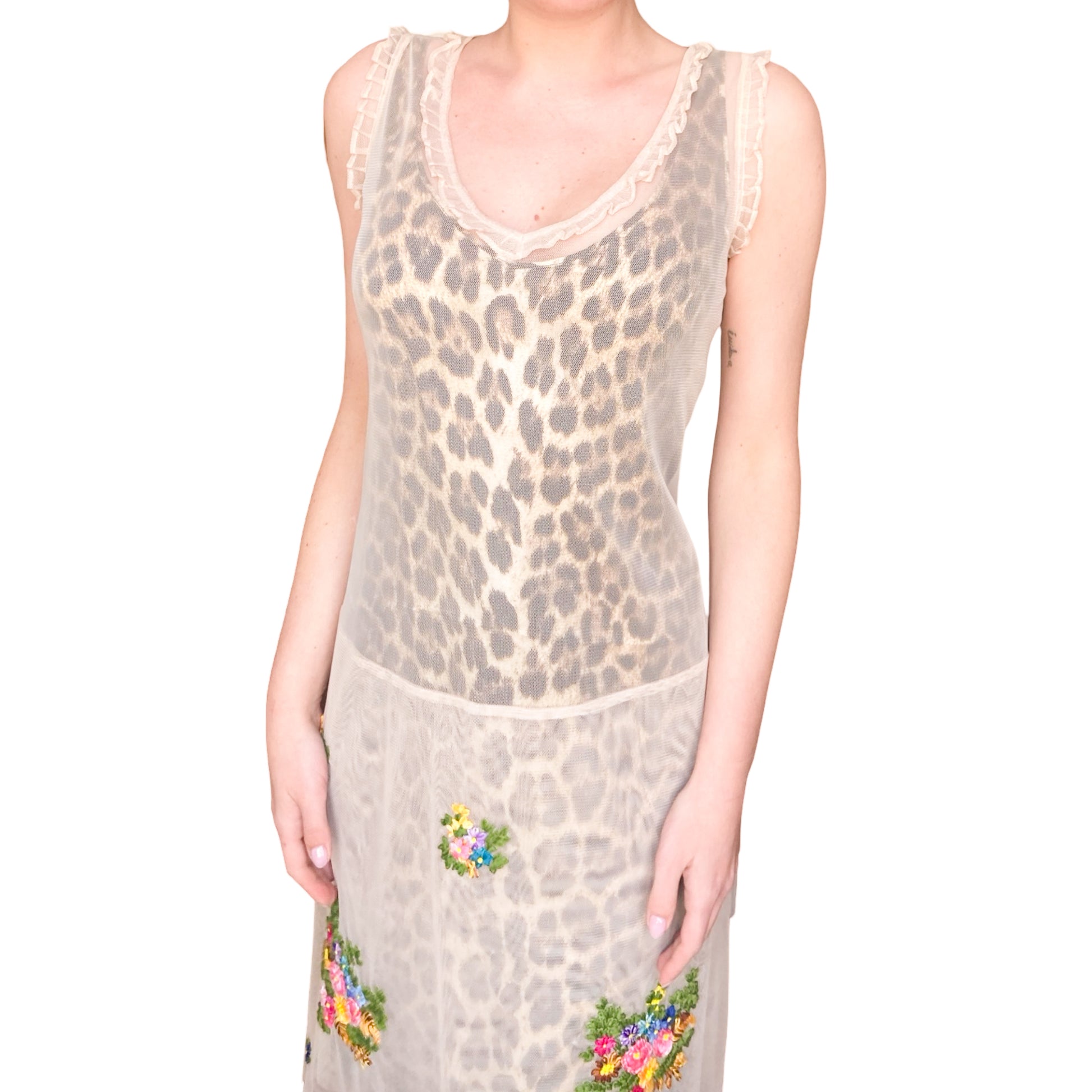 Extremely rare and utterly collectible piece from Moschino Cheap & Chic Spring 2000. This romantic dress features a double-layered construction: a bias-cut leopard satin slip dress, overlaid with a delicate sheer mesh embroidered with colourful wildflowers, finished with ruffled mesh trims.The scalloped hem and floral embroidery add an ethereal charm, while the contrast with the wild leopard print underneath brings the perfect Moschino twist. Wear it with nothing underneath for a sheer effect, or with the slip for a playful peek-a-boo moment.