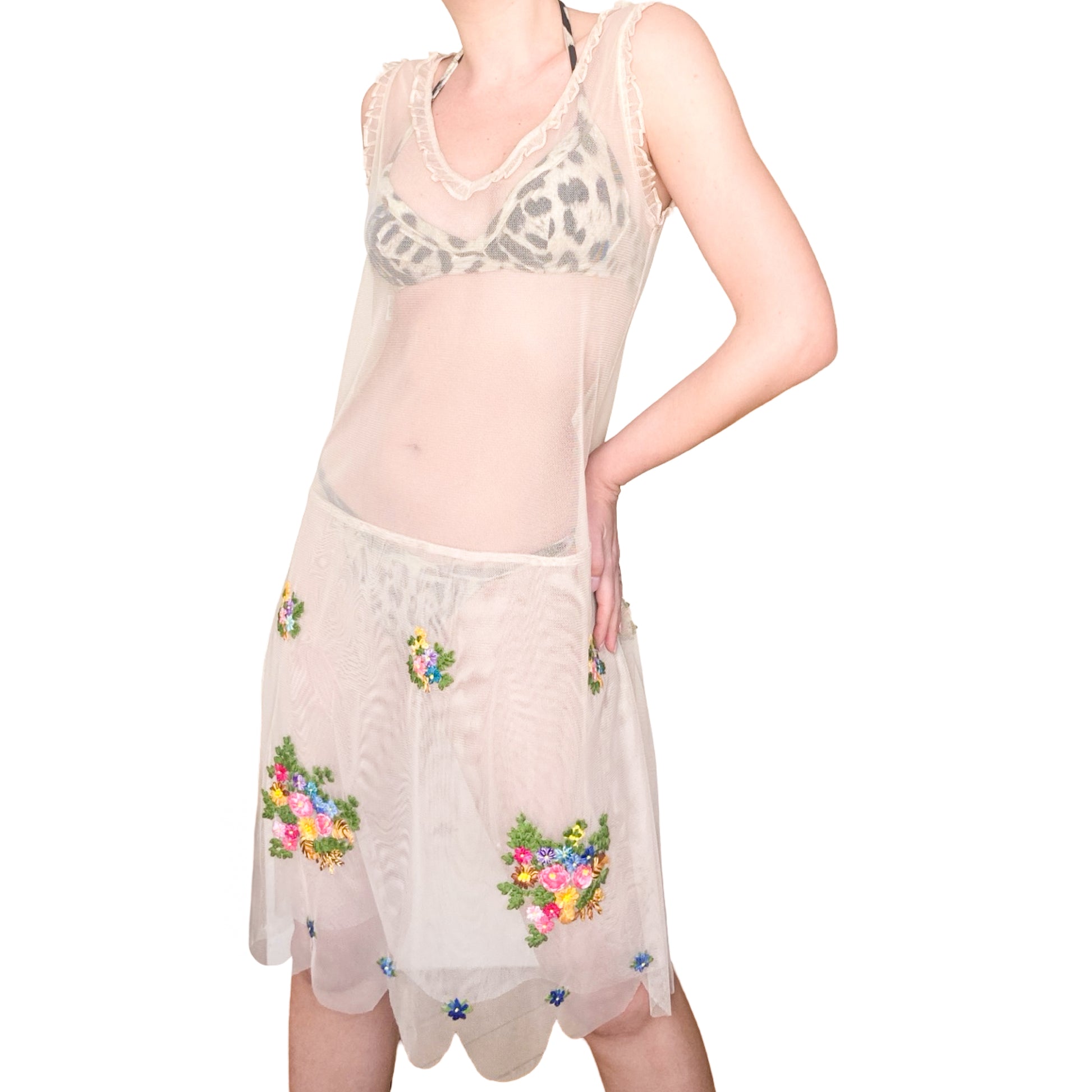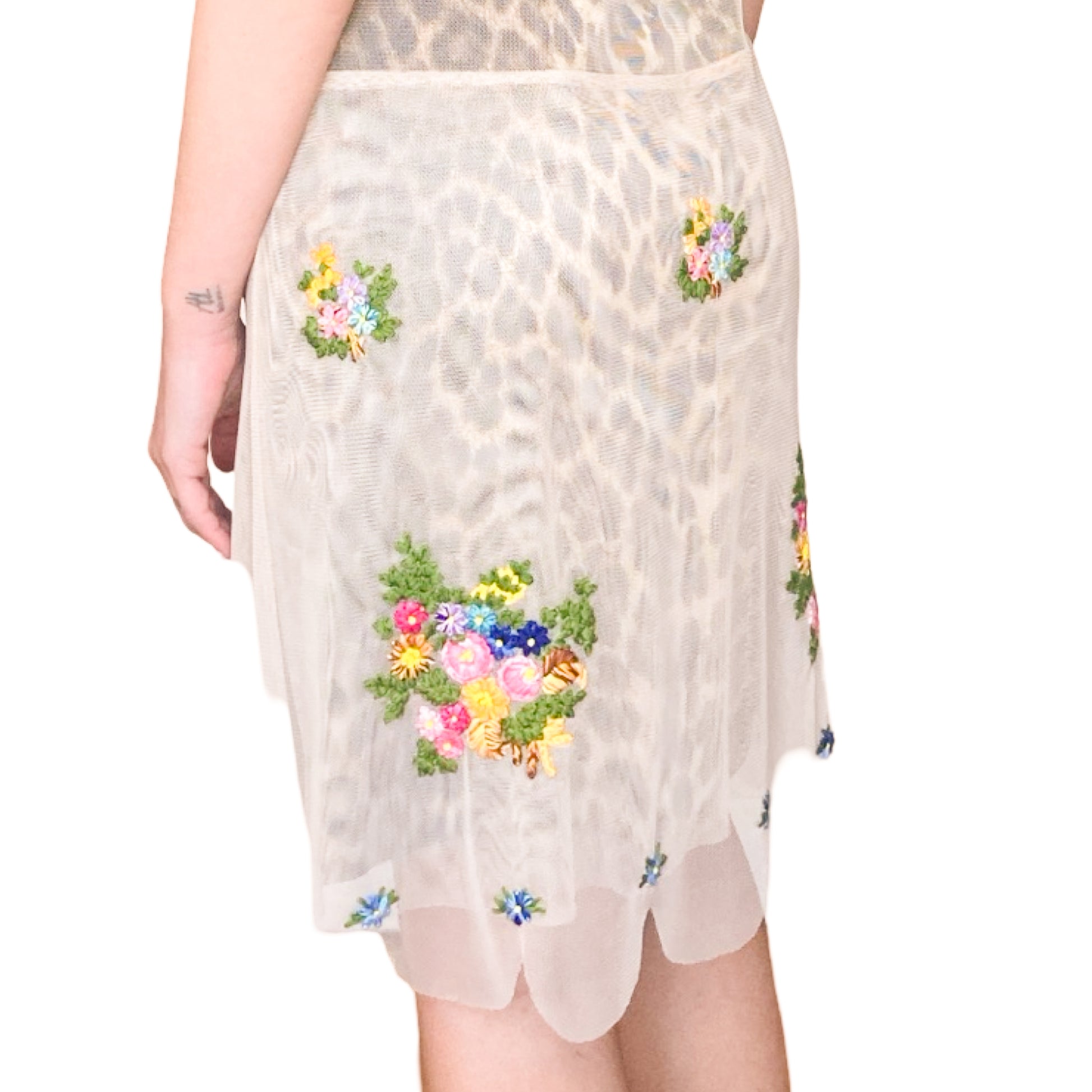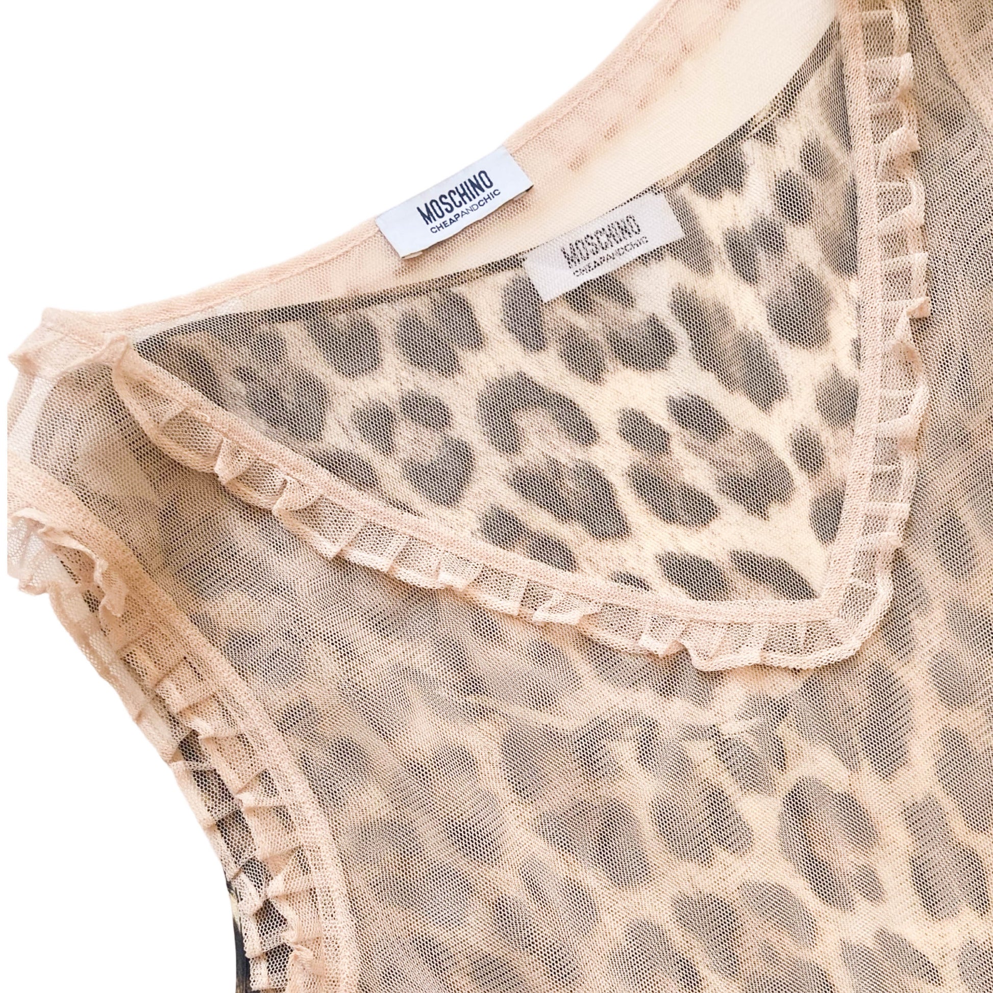 Extremely rare and utterly collectible piece from Moschino Cheap & Chic Spring 2000. This romantic dress features a double-layered construction: a bias-cut leopard satin slip dress, overlaid with a delicate sheer mesh embroidered with colourful wildflowers, finished with ruffled mesh trims.The scalloped hem and floral embroidery add an ethereal charm, while the contrast with the wild leopard print underneath brings the perfect Moschino twist. Wear it with nothing underneath for a sheer effect, or with the slip for a playful peek-a-boo moment.