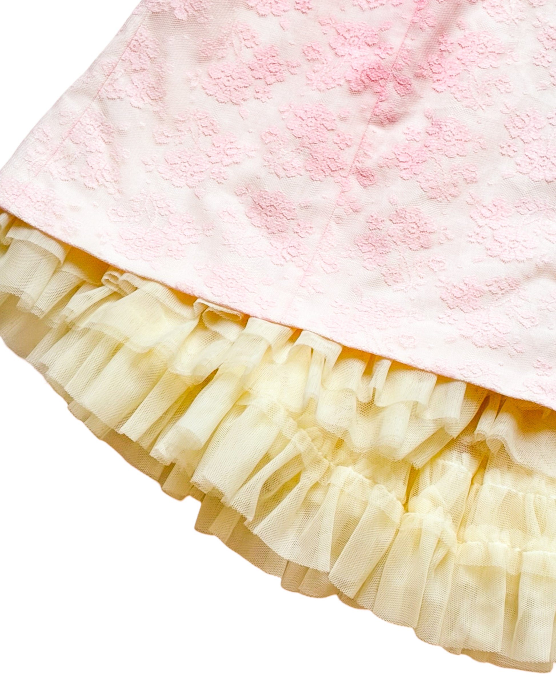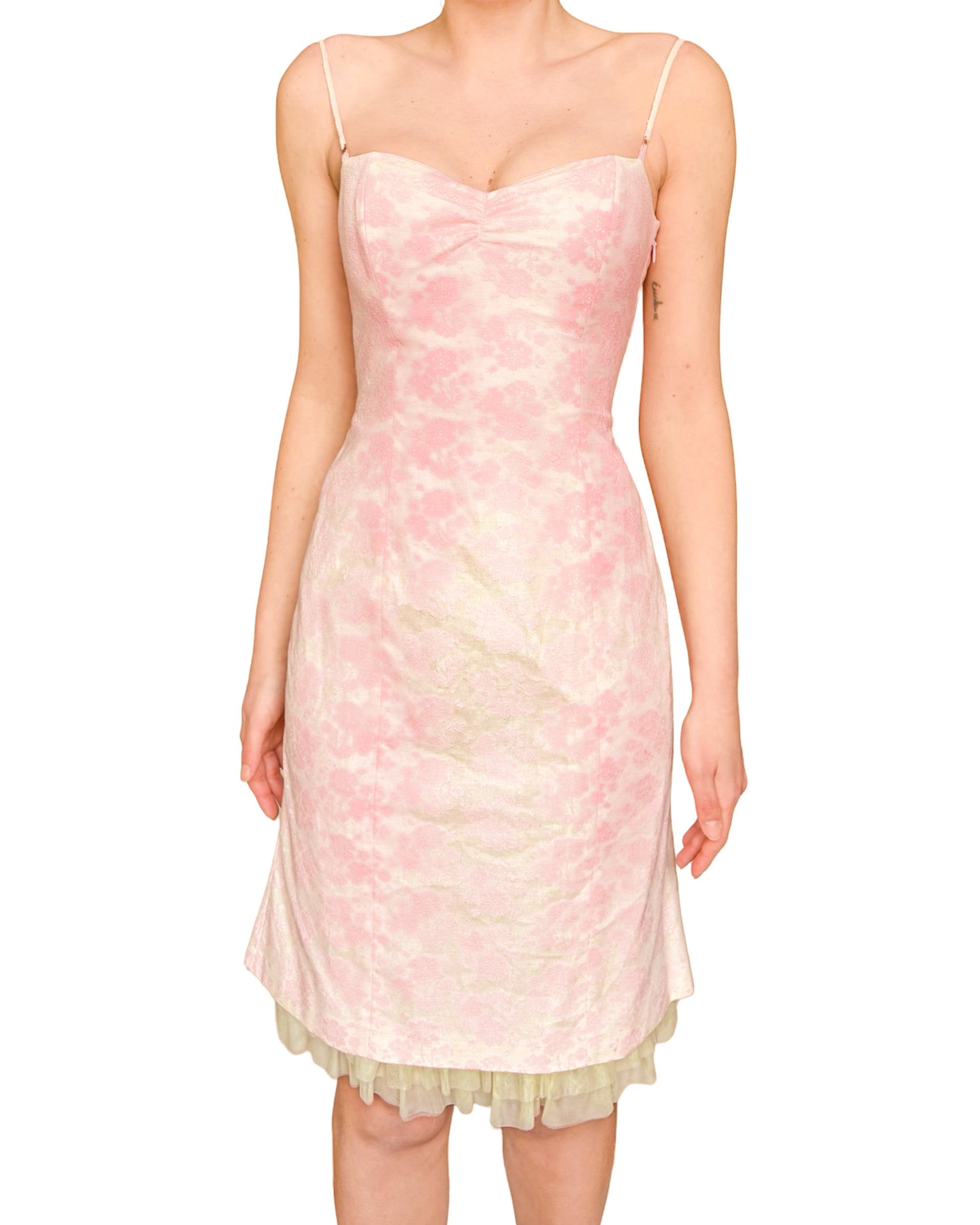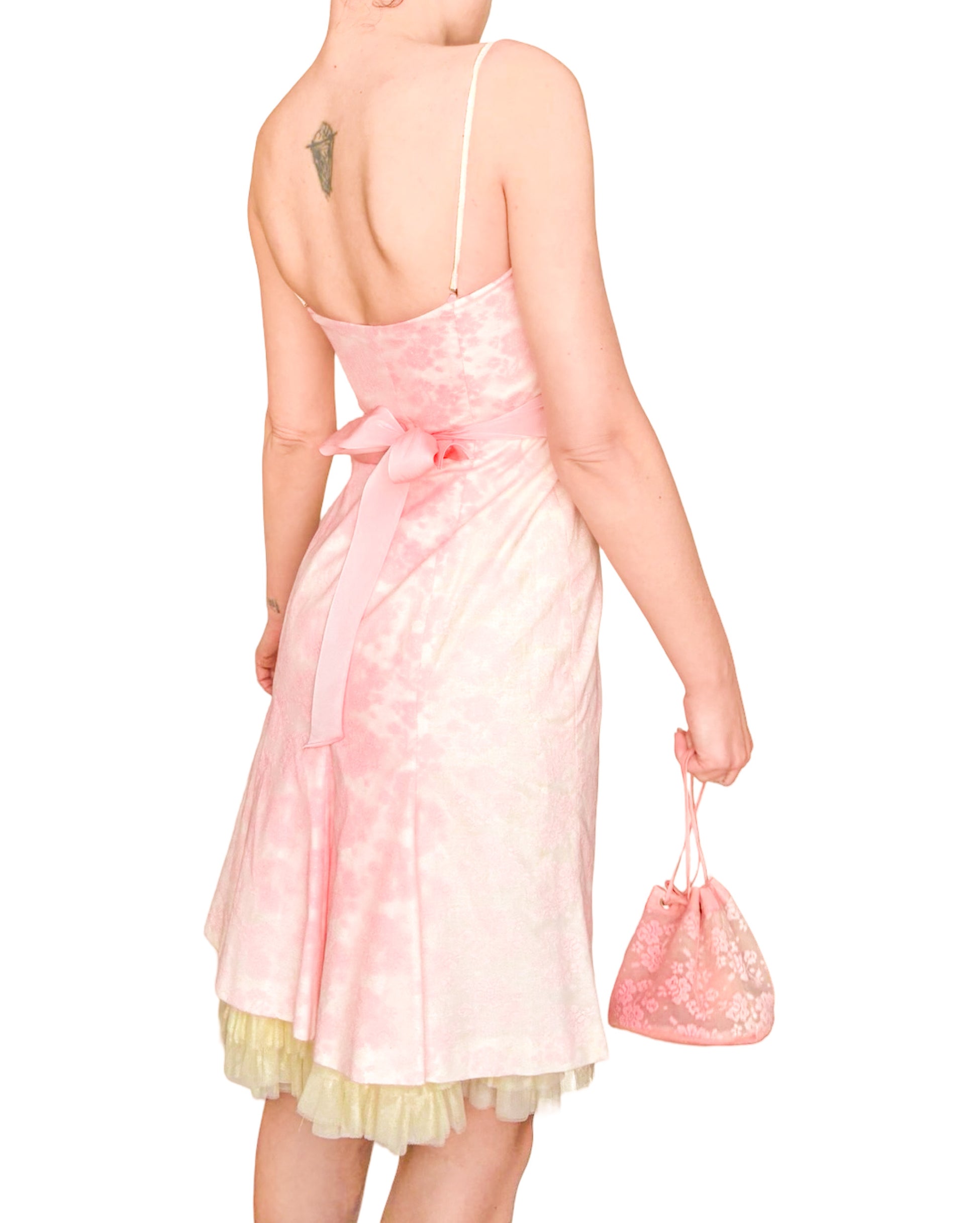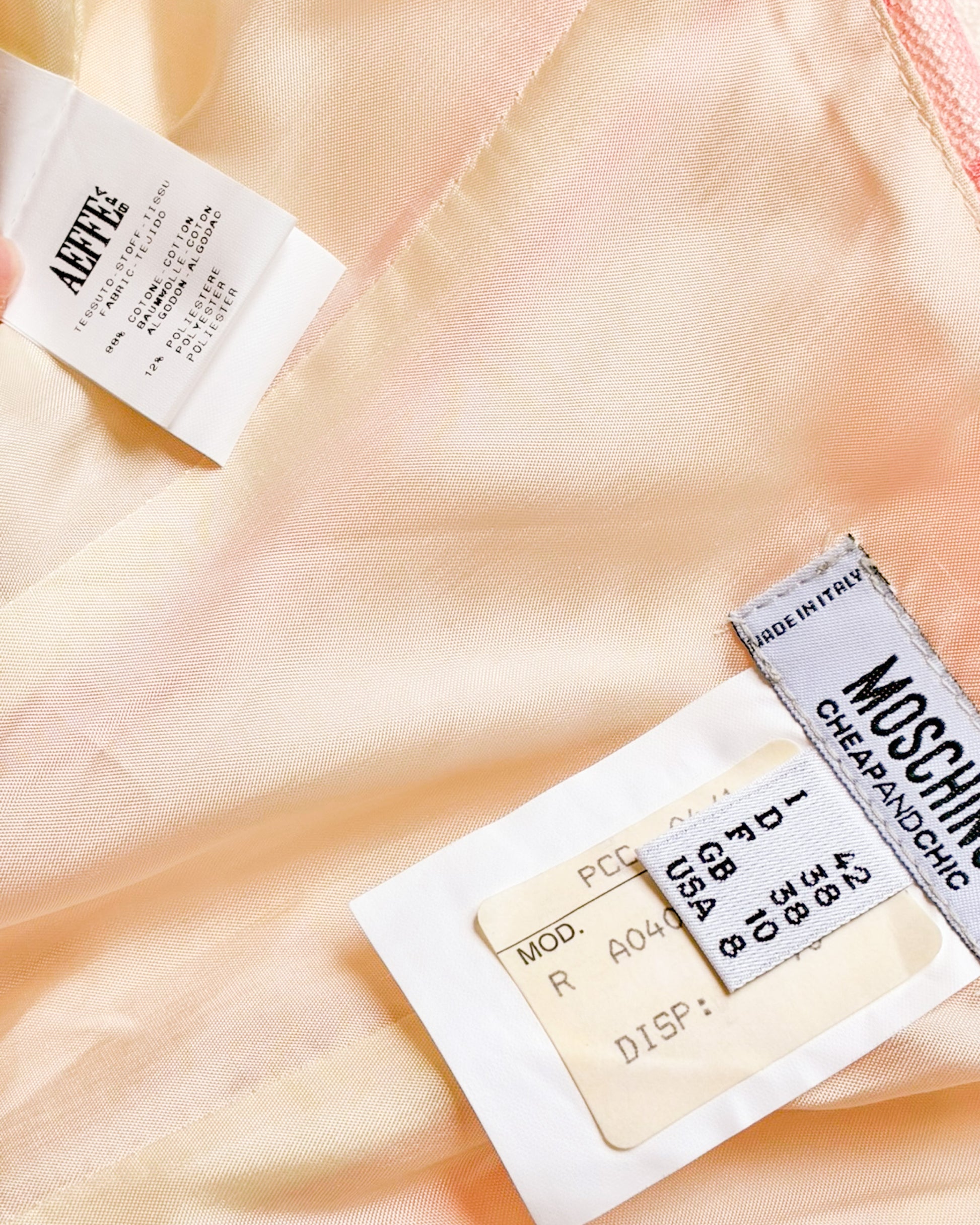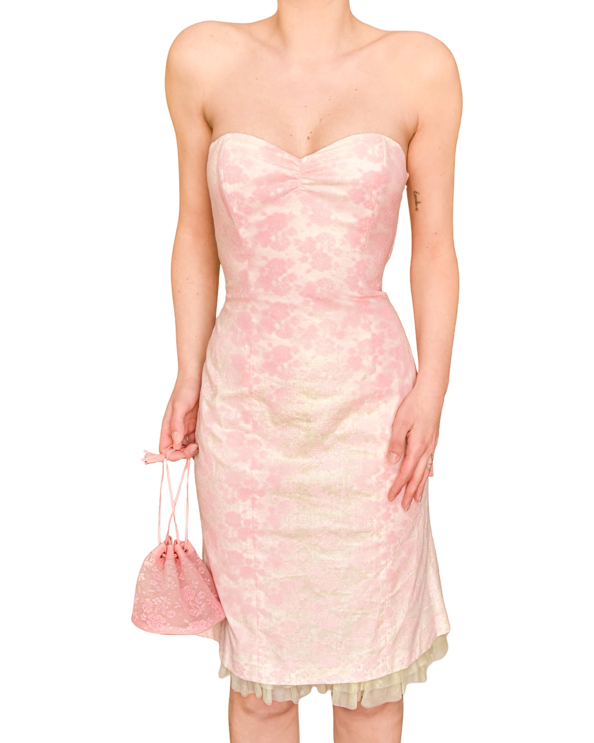 From the Moschino Cheap and Chic 2004 collection, this cute dress is made in a pastel pink cotton with tonal lace overlay that shifts with the light. Can be worn as a bustier dress thanks to side boning and removable straps. Features a built-in petticoat, sweetheart neckline, and adjustable ribbon tie at the back to cinch the waist. Comes with a matching drawstring mini bag. The dress has a zipper & a lining.
