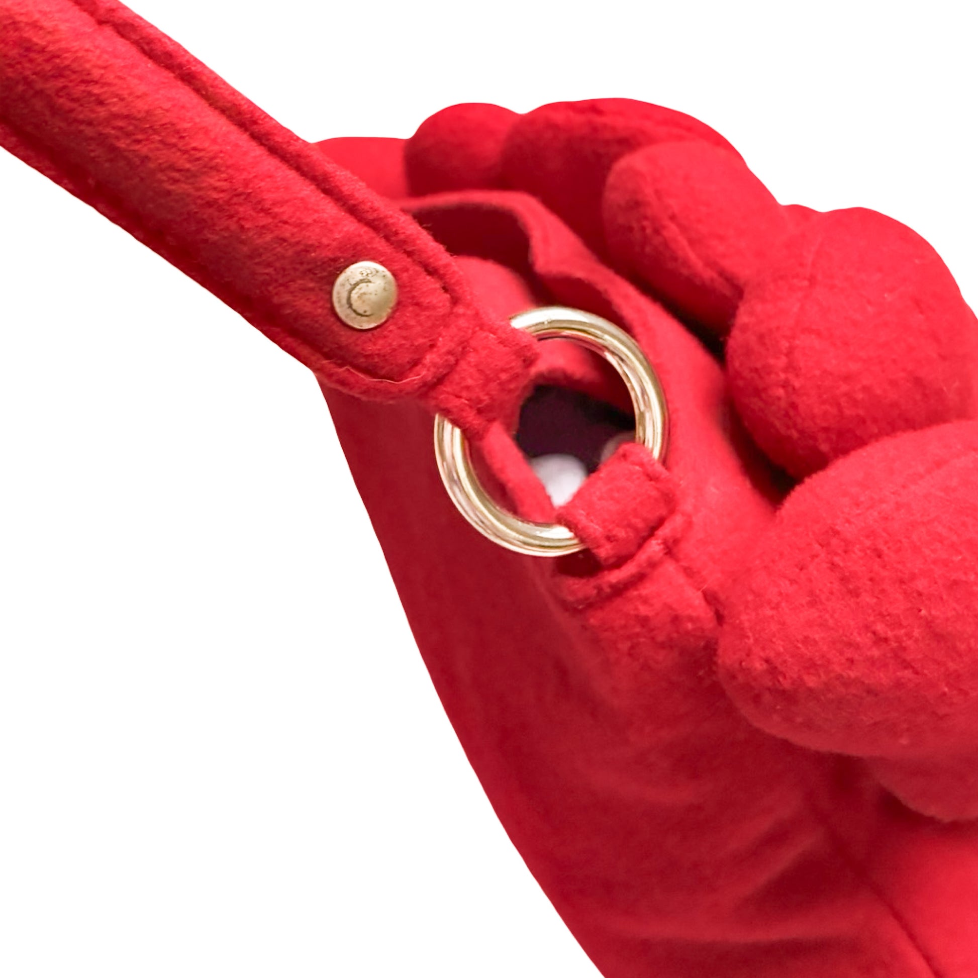 Moschino Vintage bag featuring an all-over construction of sculptural 3D hearts, emblematic of the brand’s archival aesthetic. It's possible to wear it as a shoulder bag & handbag. This icon closes with a top snap button and includes a zipped interior pocket. Finished with a Moschino signature at the back, this piece is crafted in a wool blend and remains particularly hard to source on the vintage market; labeled Moschino Jeans.
