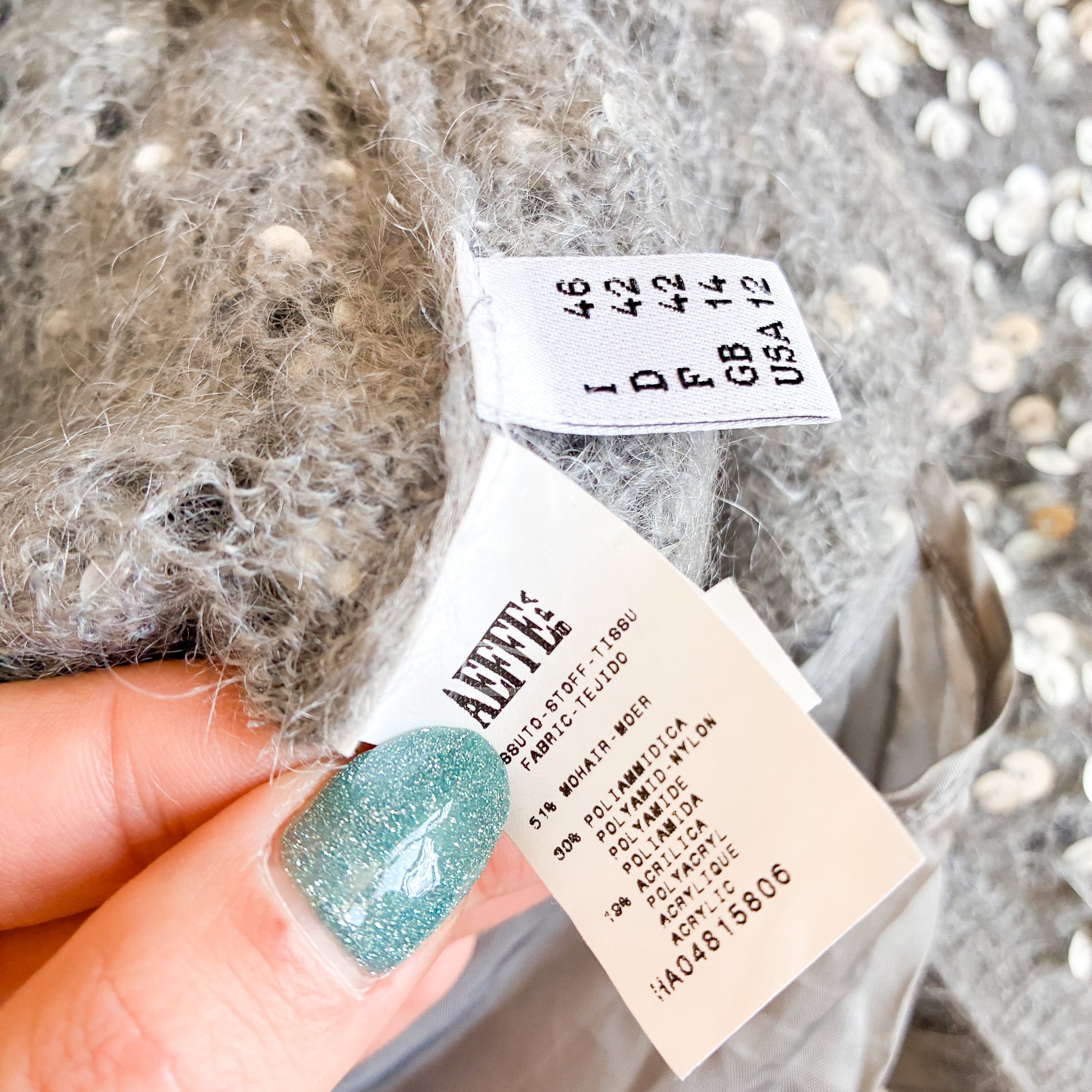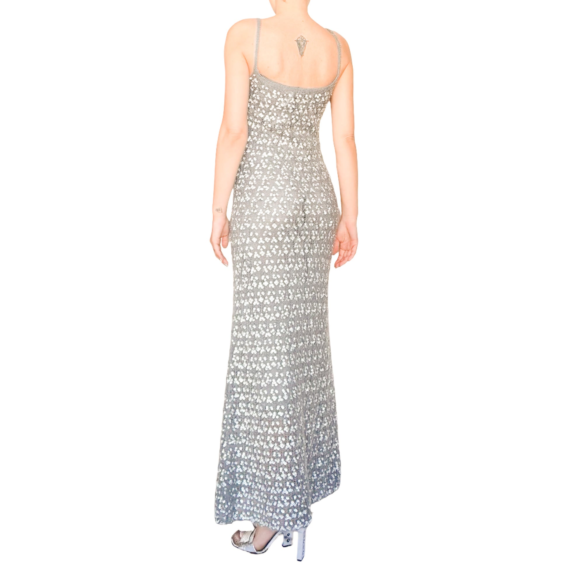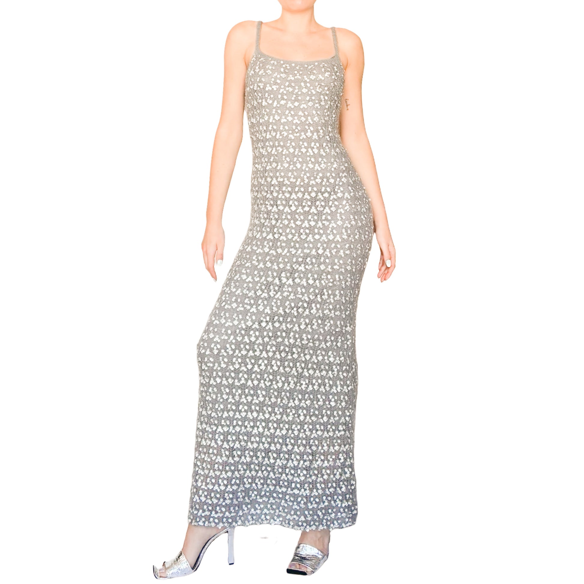 Rare Moschino maxi dress from the early 2000s, crafted in a grey mohair blend with reflective silver sequins throughout. Long, fluid and fitted silhouette with thin straps. Fuzzy texture typical of mohair combined with an all-over sequin finish. The dress comes with its original slip lining, which is attached to the dress but can be easily detached. Can be worn as a winter evening gown, a statement party dress, or styled as an elevated everyday piece.