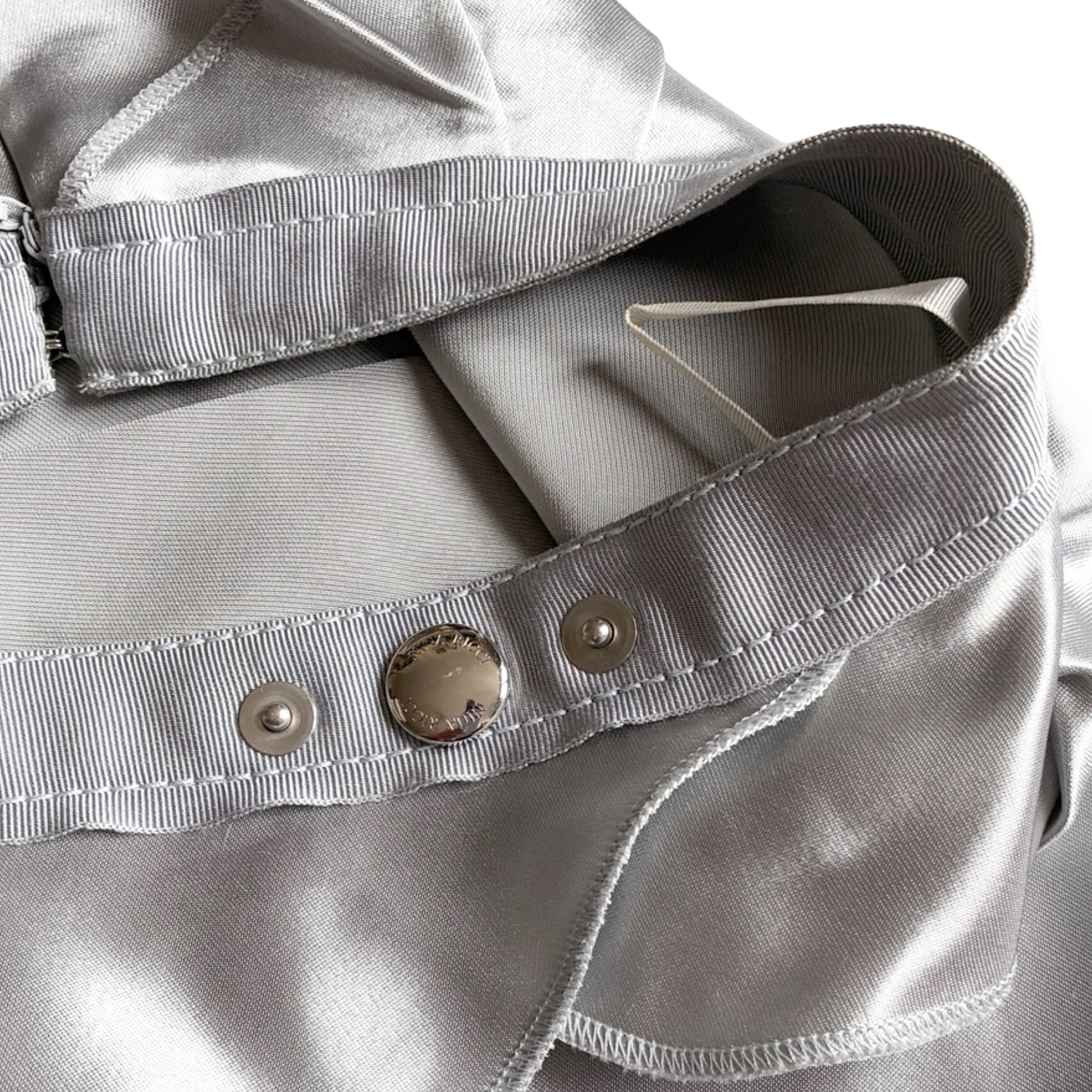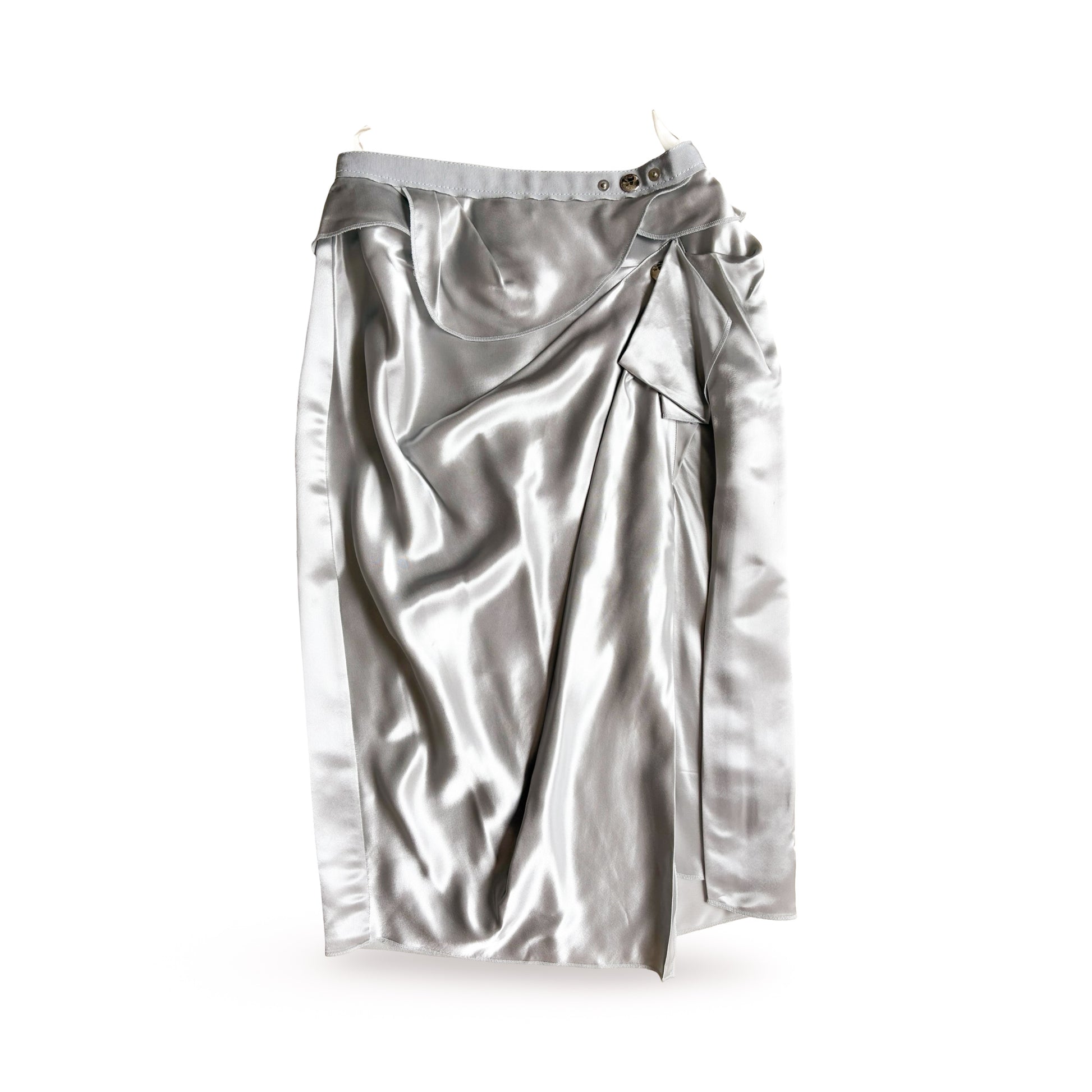 Nina Ricci Spring 2013 runway draped satin skirt in a luminous liquid silver viscose, designed with an origami construction at the waist and asymmetric front draping. The midi silhouette fastens with a zipper on the side. At the waist some decorative signed snap buttons balancing modern minimalism with couture-level detailing. An iconic piece from the 2013 runway, capturing Nina Ricci’s signature.