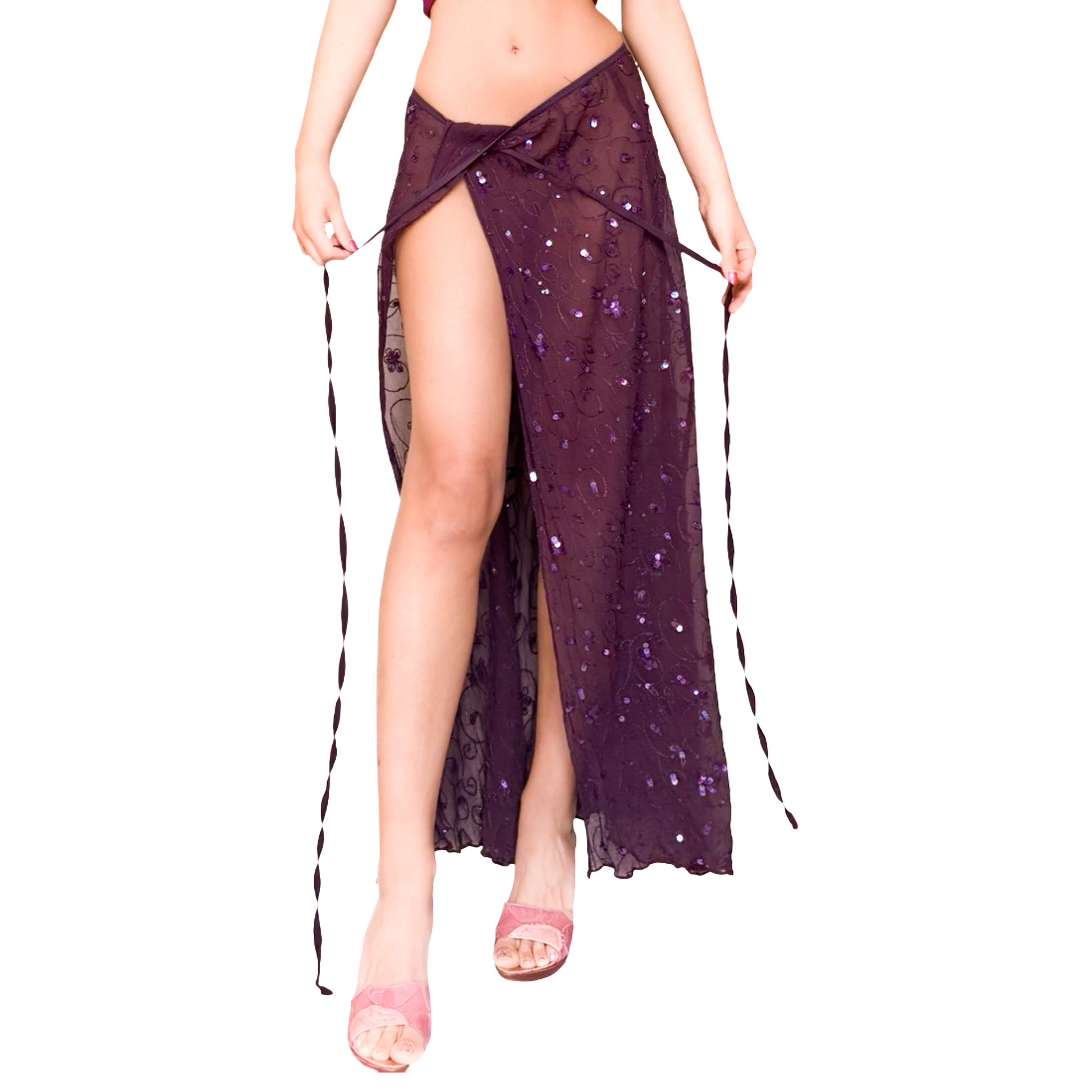 Sheer wrap skirt in deep purple silk, delicately embroidered with tonal threads and embellished with iridescent sequins. Designed with an adjustable tie waist and daring slit for a fluid, sensual silhouette. A striking archival piece from Plein Sud, seen on an Elle Spain Editorial of 1995. The matching mini dress in a slightly different tone with the same embroidery is also available, and the two can be worn together to form a stunning maxi-dress look.