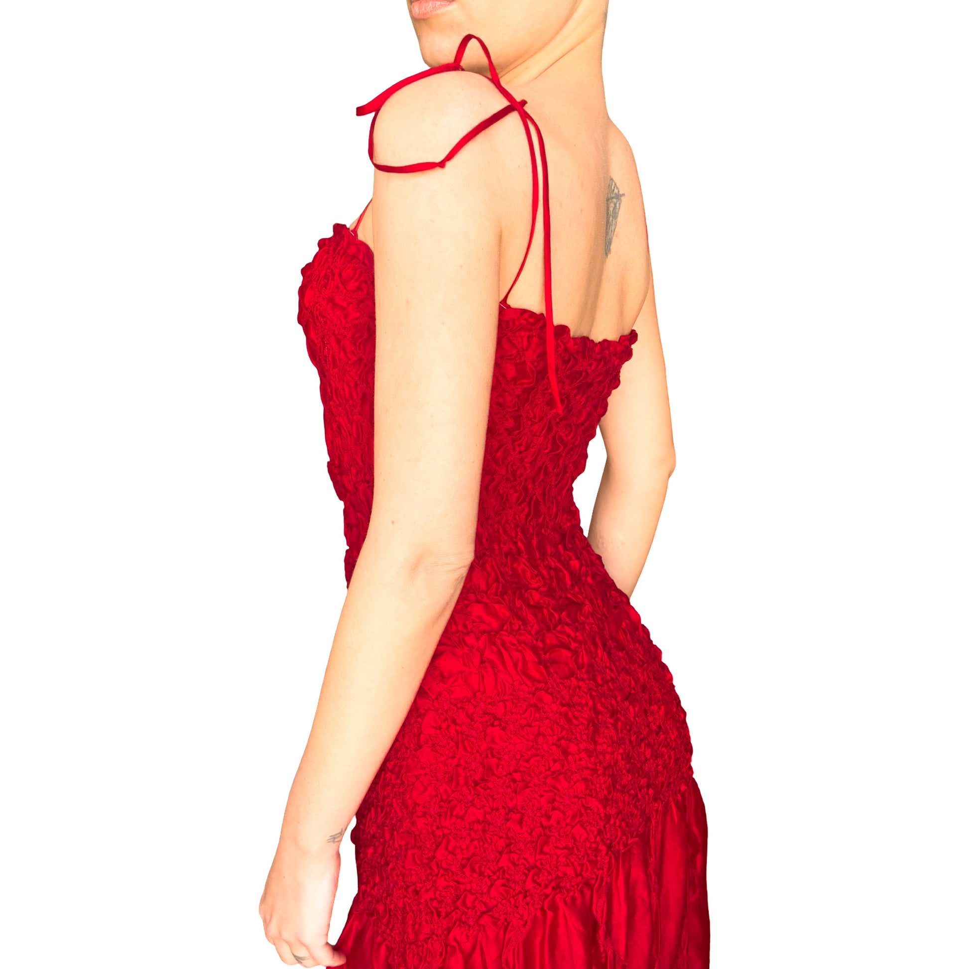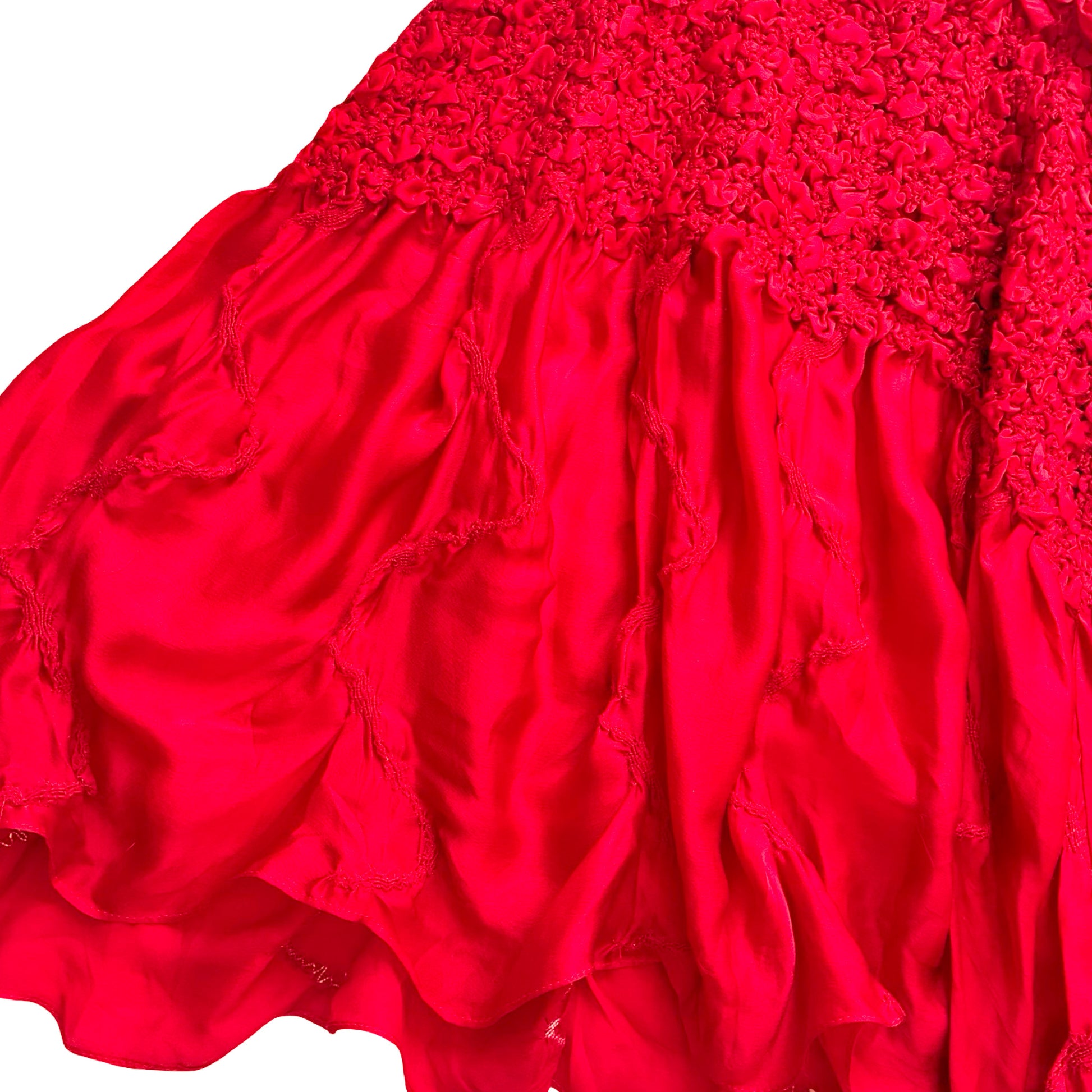 The ultimate epitome of the Spring 2004 collection by designer Fayçal Amor, which is entitled "La Dolce Vita", this vibrant crimson silk dress stands as the iconic symbol of the runway. It features an extraordinary level of artisanal craftsmanship, with extensive hand-stitched chaotic smocking that creates a rare, sculptural texture and allows the delicate silk to stretch perfectly to any silhouette. Finished with slender tie-fastening straps and a fluid ruffled hem, this high-octane now-vintage gem is a virtually impossible-to-find.