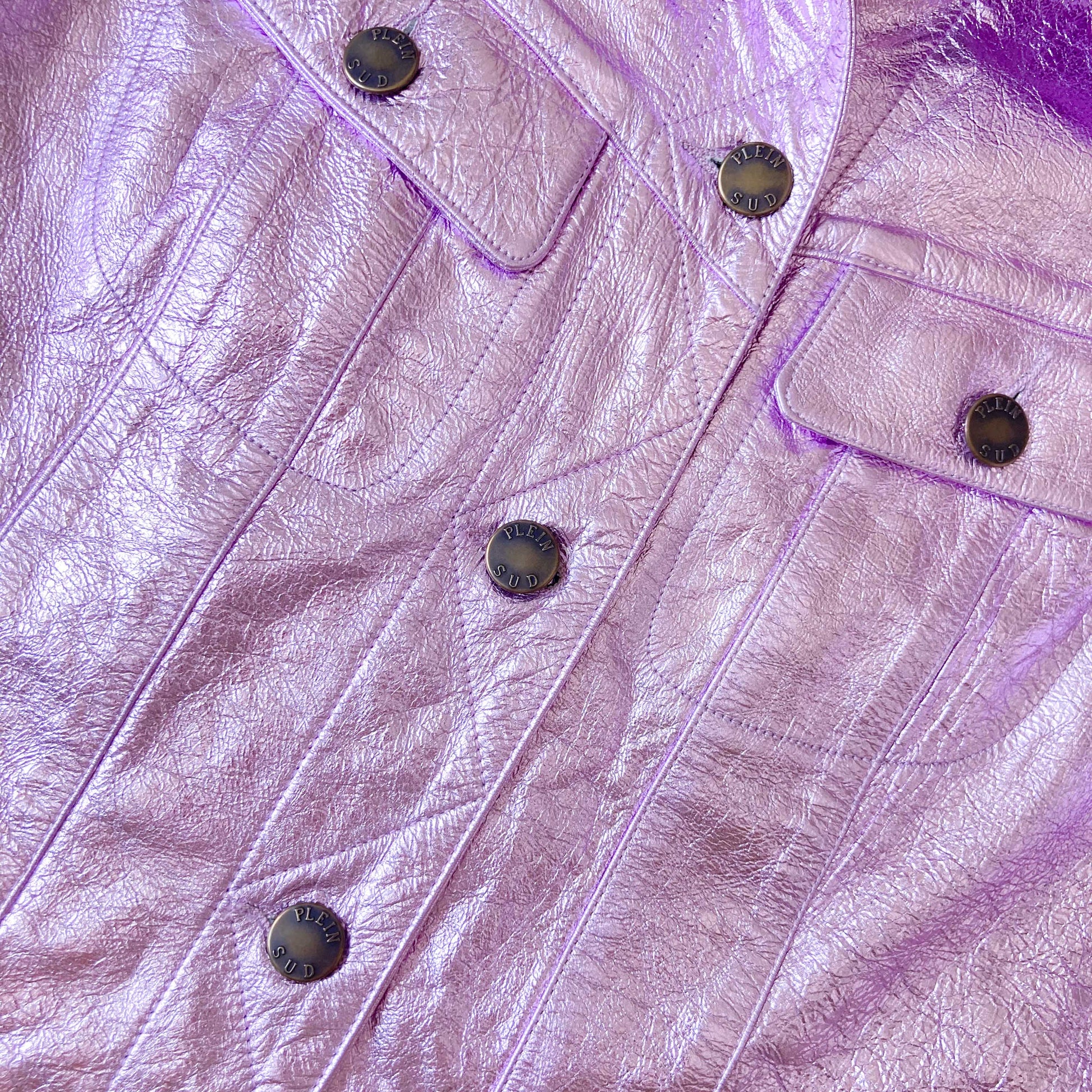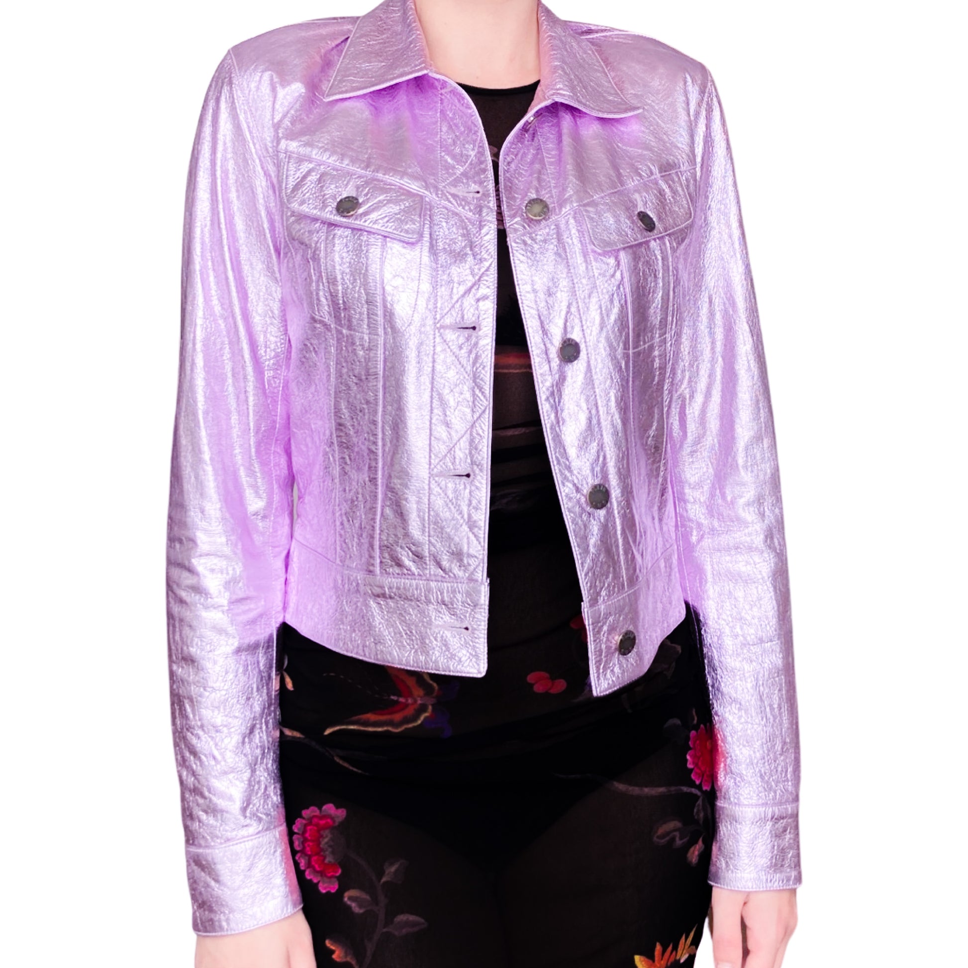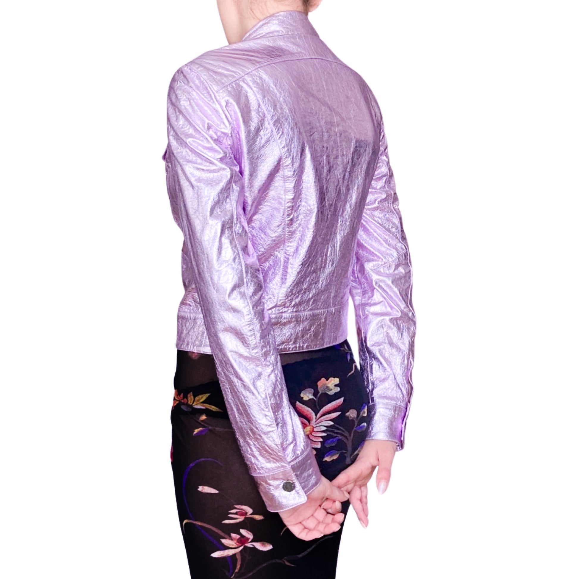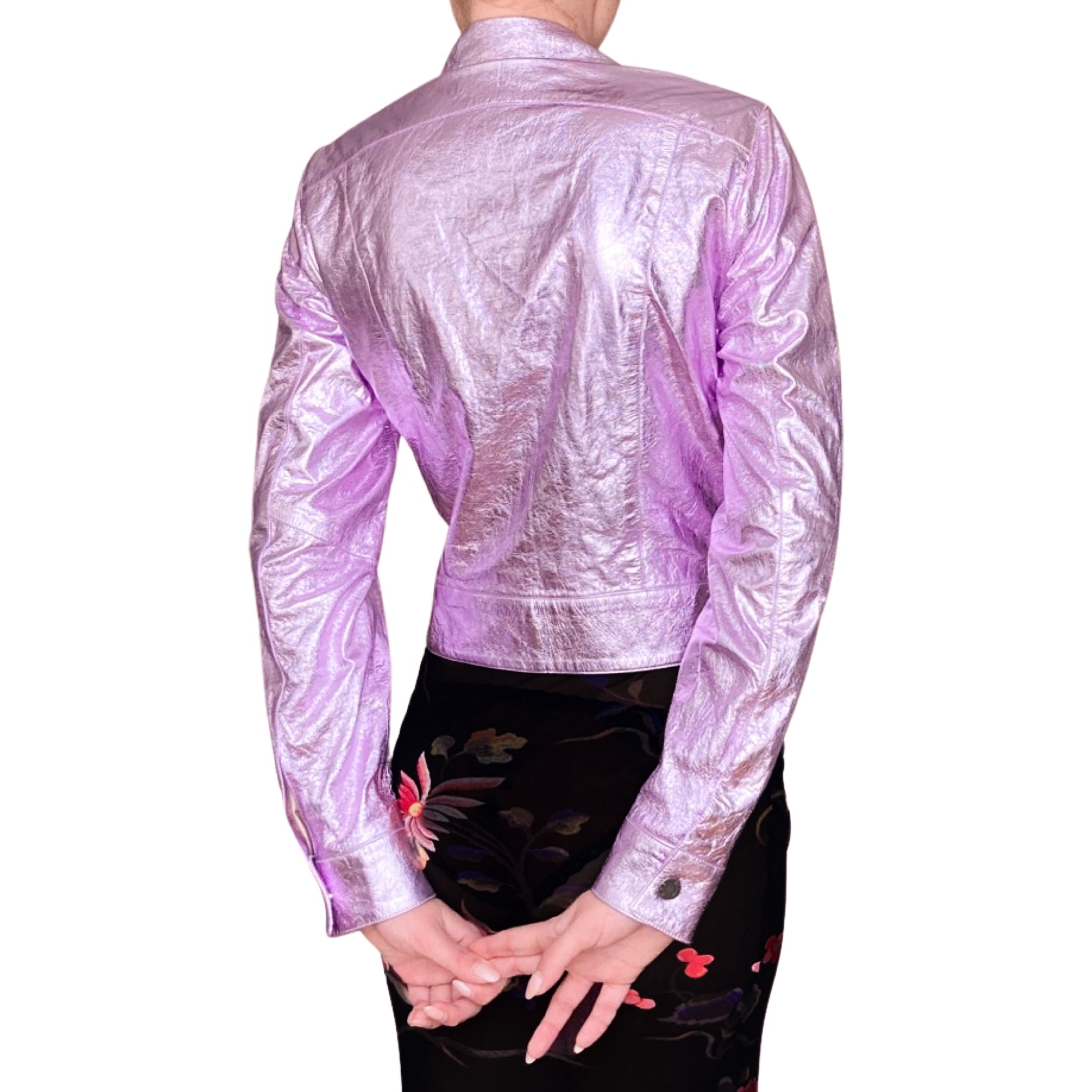 This metallic leather jacket is a unique collector item from the Spring Summer 1998 collection. Crafted with an insane metallic soft leather, it features double pockets on the chest, signed buttons, and an eye-catching purplish pink shimmered color. Fully lined. This metallic leather was seen as a pants on the official campaign shot by Ellen Von Unwerth. MEGA CRUSH HERE !