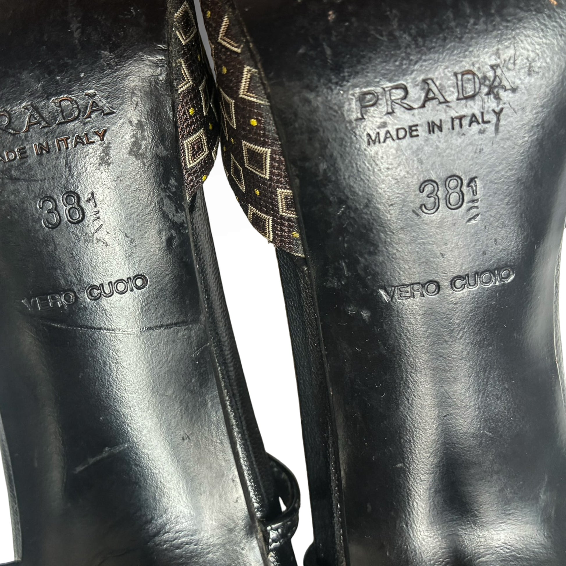 These iconic Prada Spring/Summer 2003 "Kimono" slingbacks are blending traditional Japanese aesthetics with early 2000s codes. Crafted from a geometric diamond-patterned canvas with sleek patent leather accents, they feature a signature "Obi" sash-inspired silk band and a delicate 3D leather flower tie. Sharp pointed-toe silhouette and dainty buckled straps.