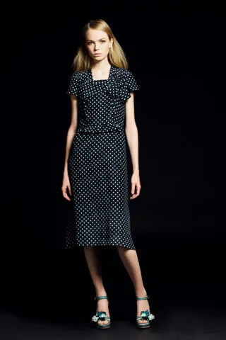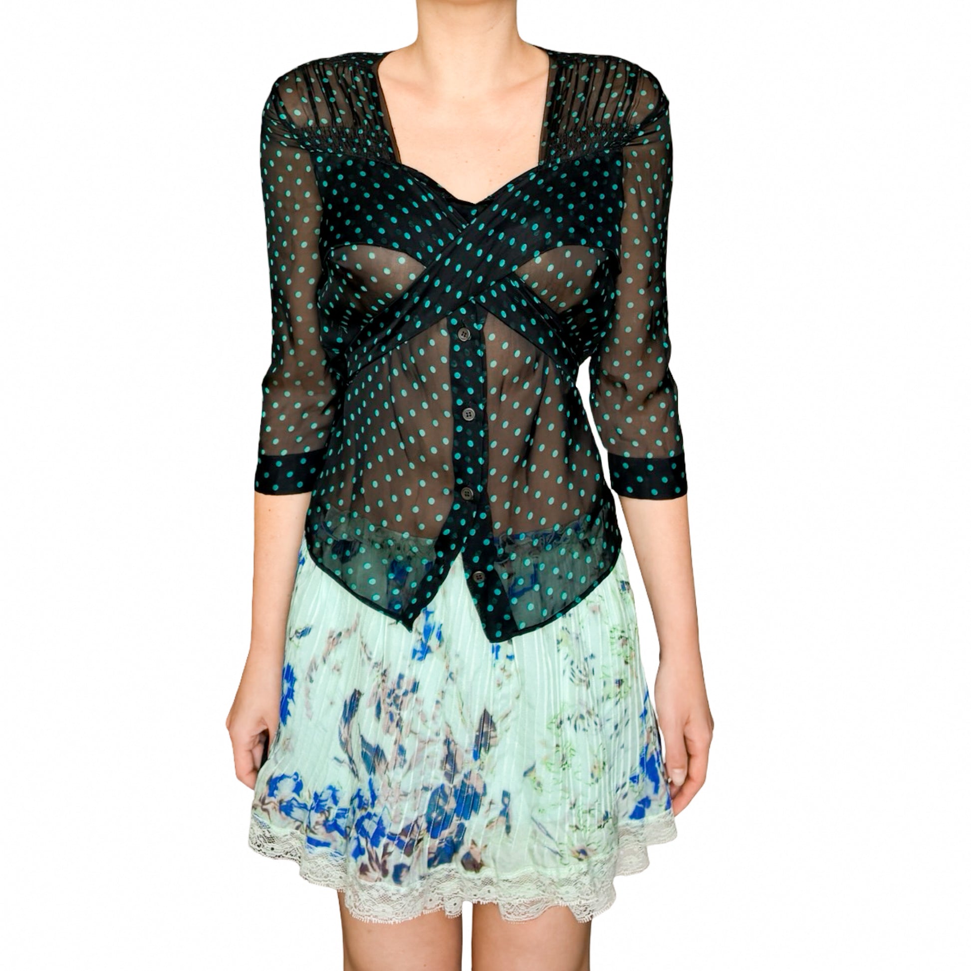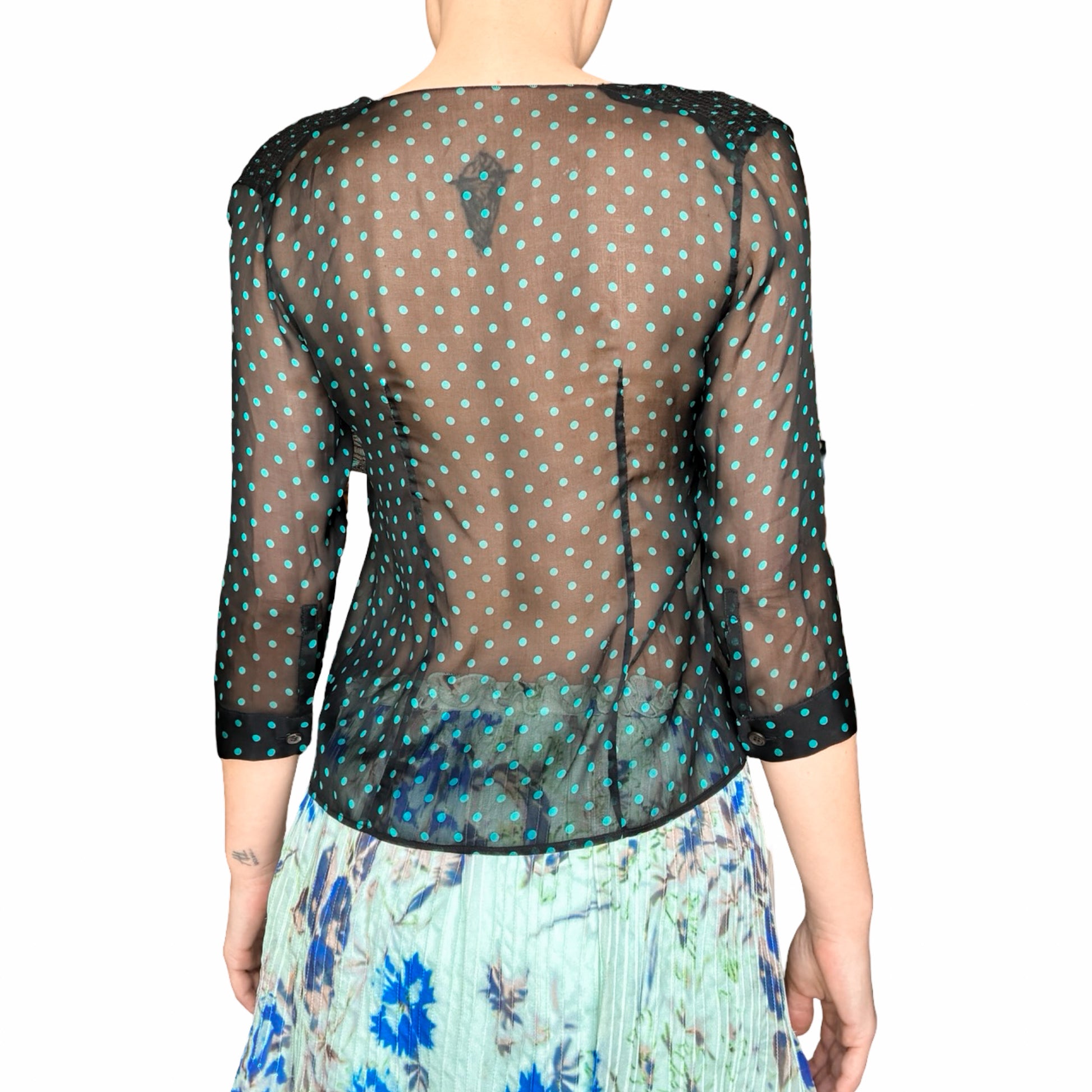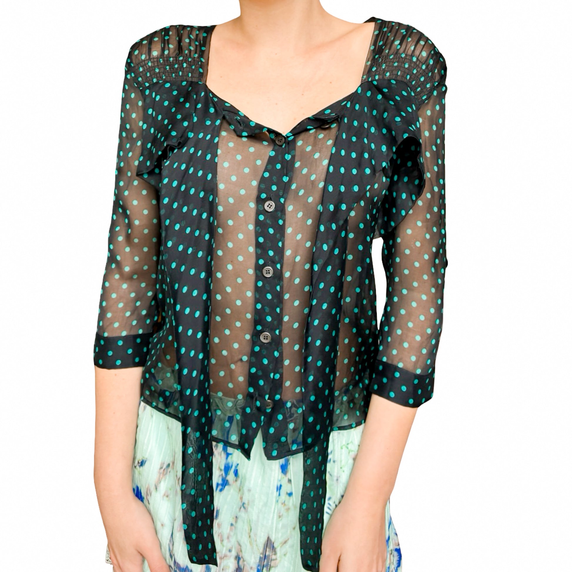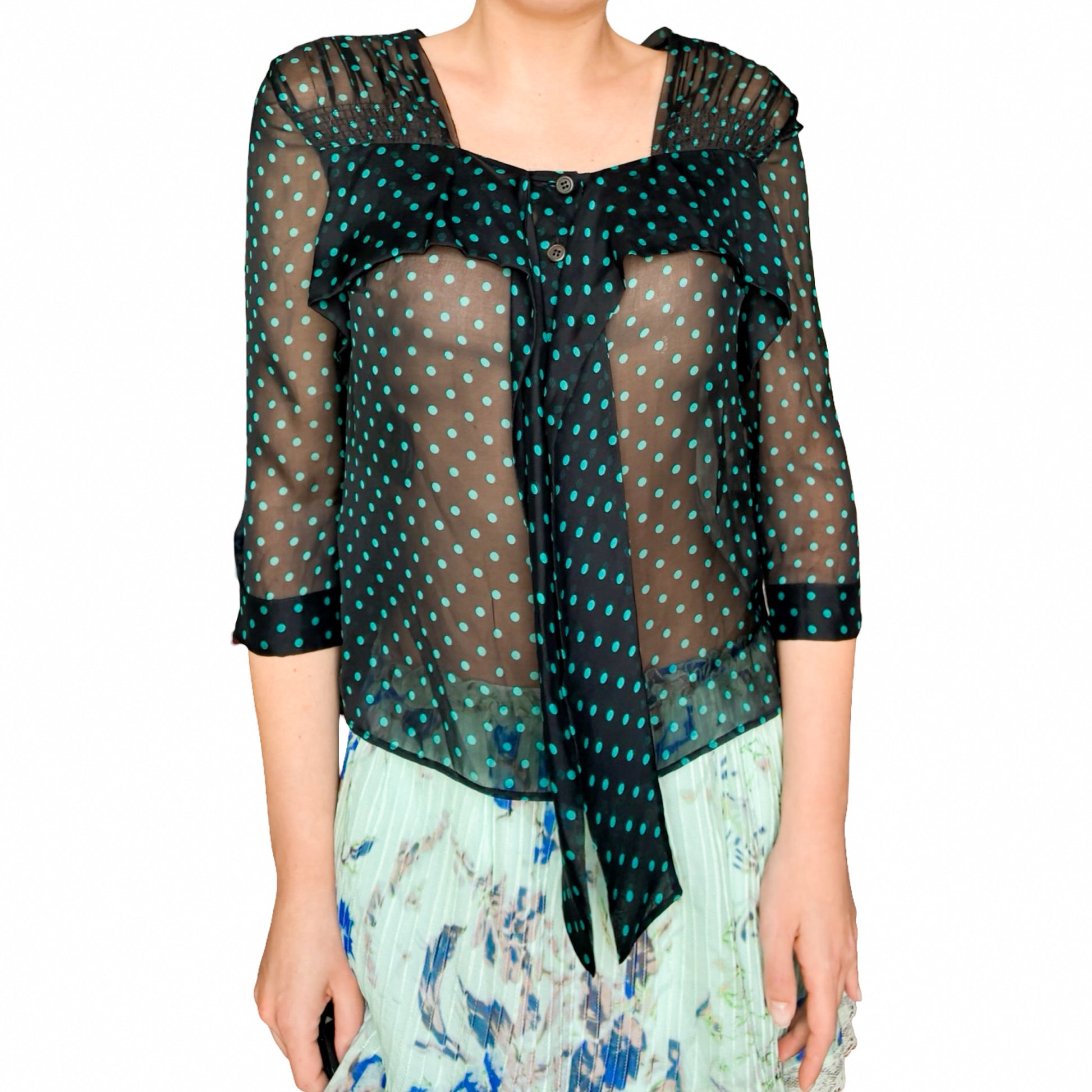 Prada sheer silk fitted shirt in navy with turquoise-green polka dots, designed with a button-up front and lavallière ties that can be styled in different ways, either crossed at the bust or tied traditionally. The blouse features three-quarter sleeves with buttoned cuffs and delicate gathers at the shoulders. Fully transparent, best worn with a bra or layered depending on styling preference. Print was short for the official lookbook of the resort 2008 collection.