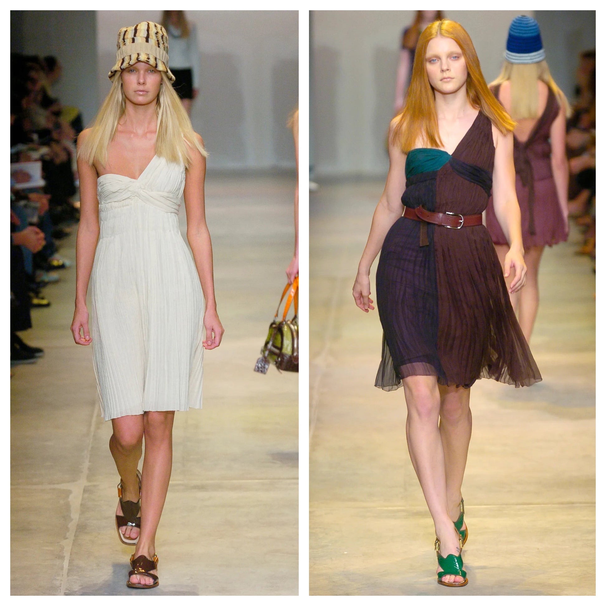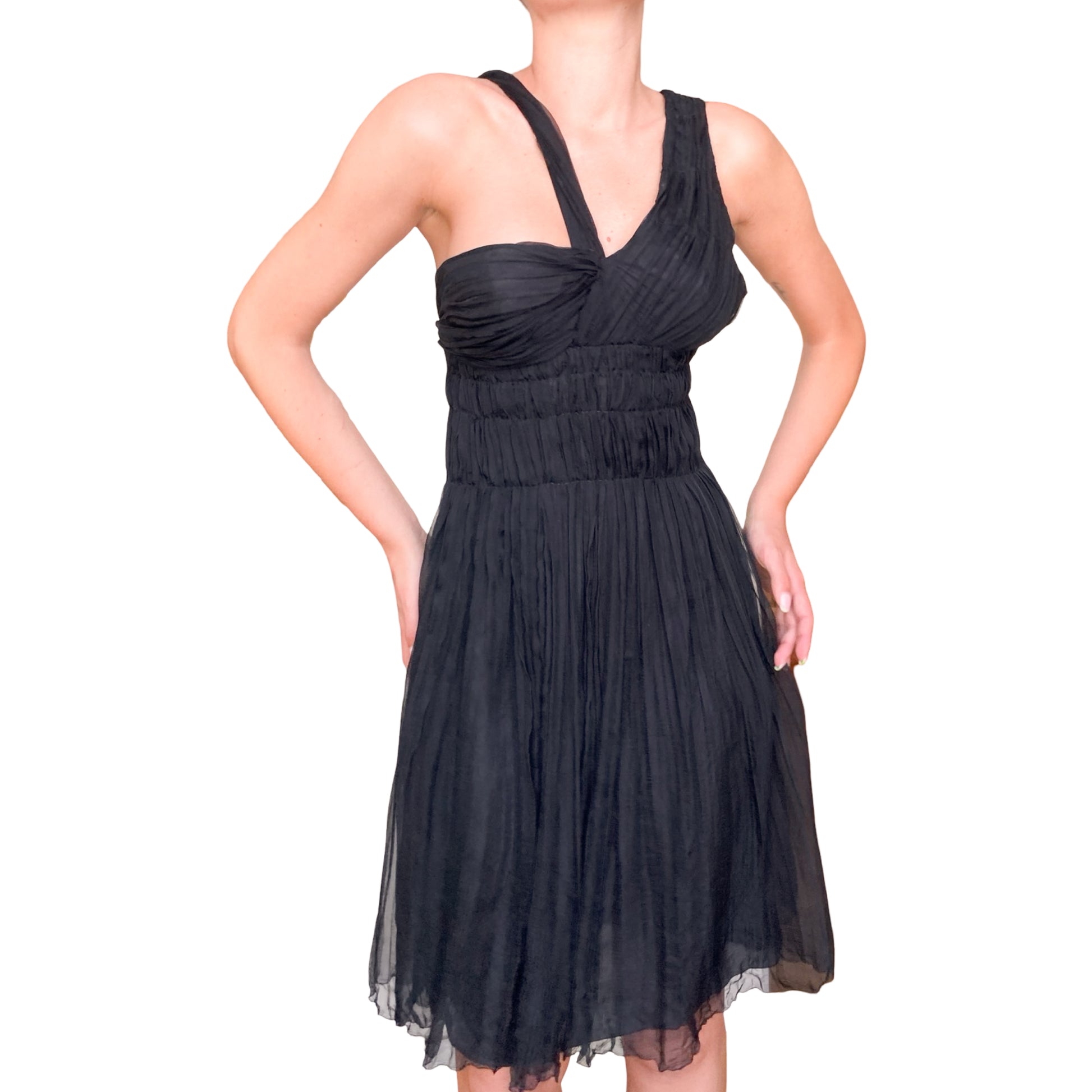 A strikingly similar version to the ones seen on the Spring/Summer 2005 runway, this empire waist dress exudes Greek goddess elegance. Crafted from black ruched pleated silk, it features asymmetrical straps and includes a wired bra for added support. The dress has a side zipper, and one of the straps can be detached or attached using snap buttons. A marvel of elegance and sophistication!