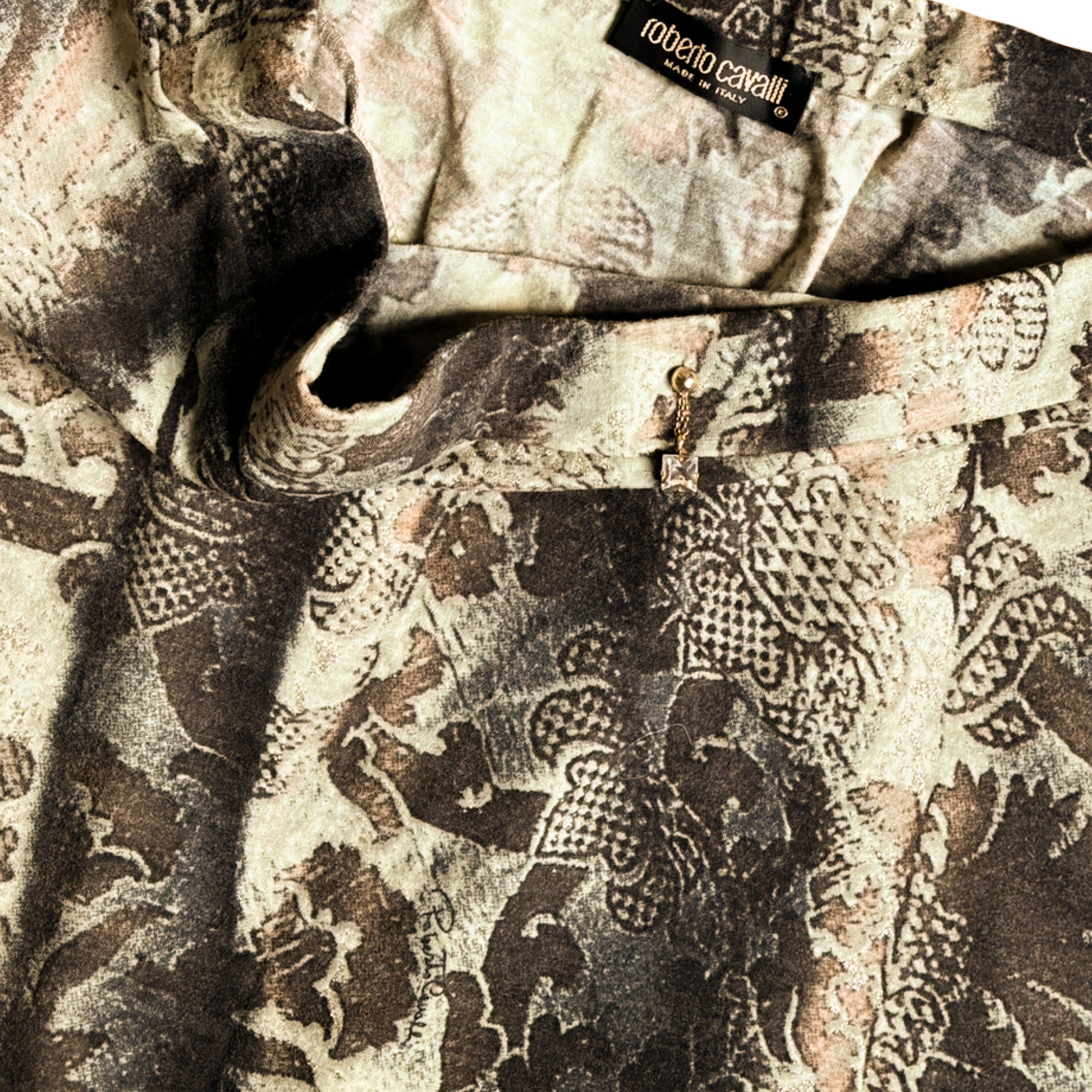 Fitted stretch wool brocade skirt with metallic gold threads and a muted bronze-sage palette. Cut in a soft pencil shape that hugs the hips and subtly flares at the hem. Slightly longer at the back for a natural drape and movement. Finished with an elastic waistband and Cavalli’s belly-piercing charm at the waist. Roberto Cavalli signature on the print. This print was seen on the runway of the Fall 2001 collection.