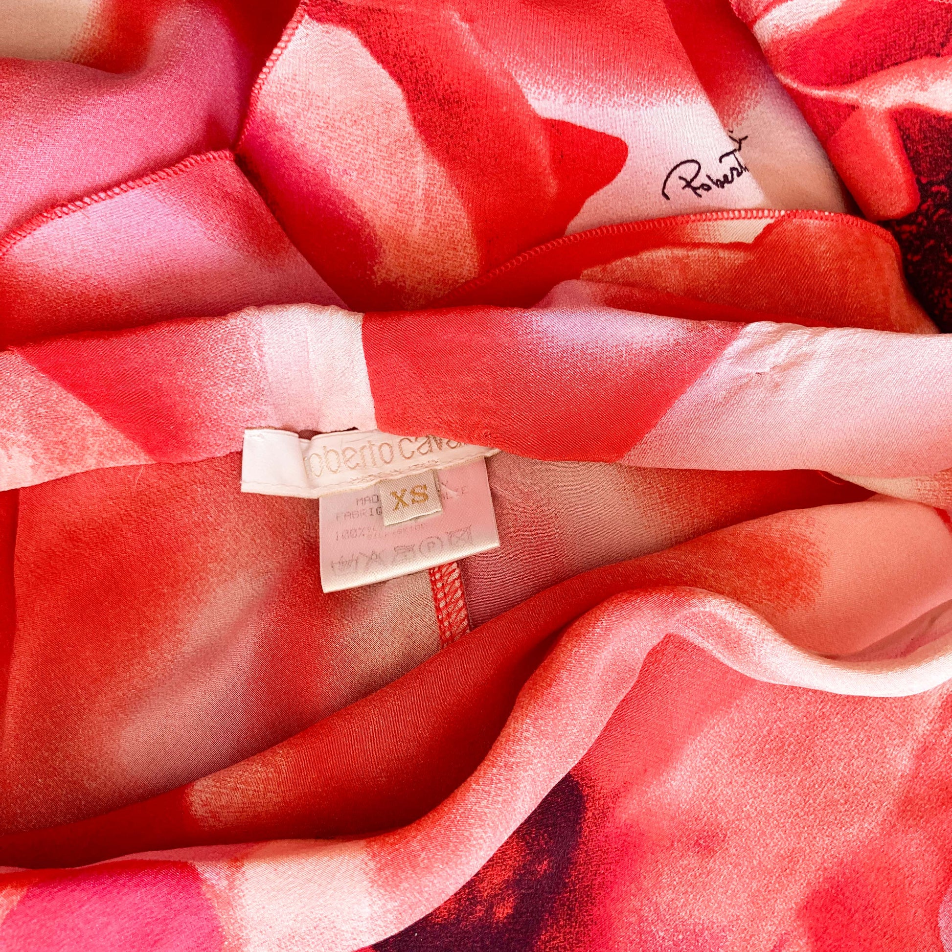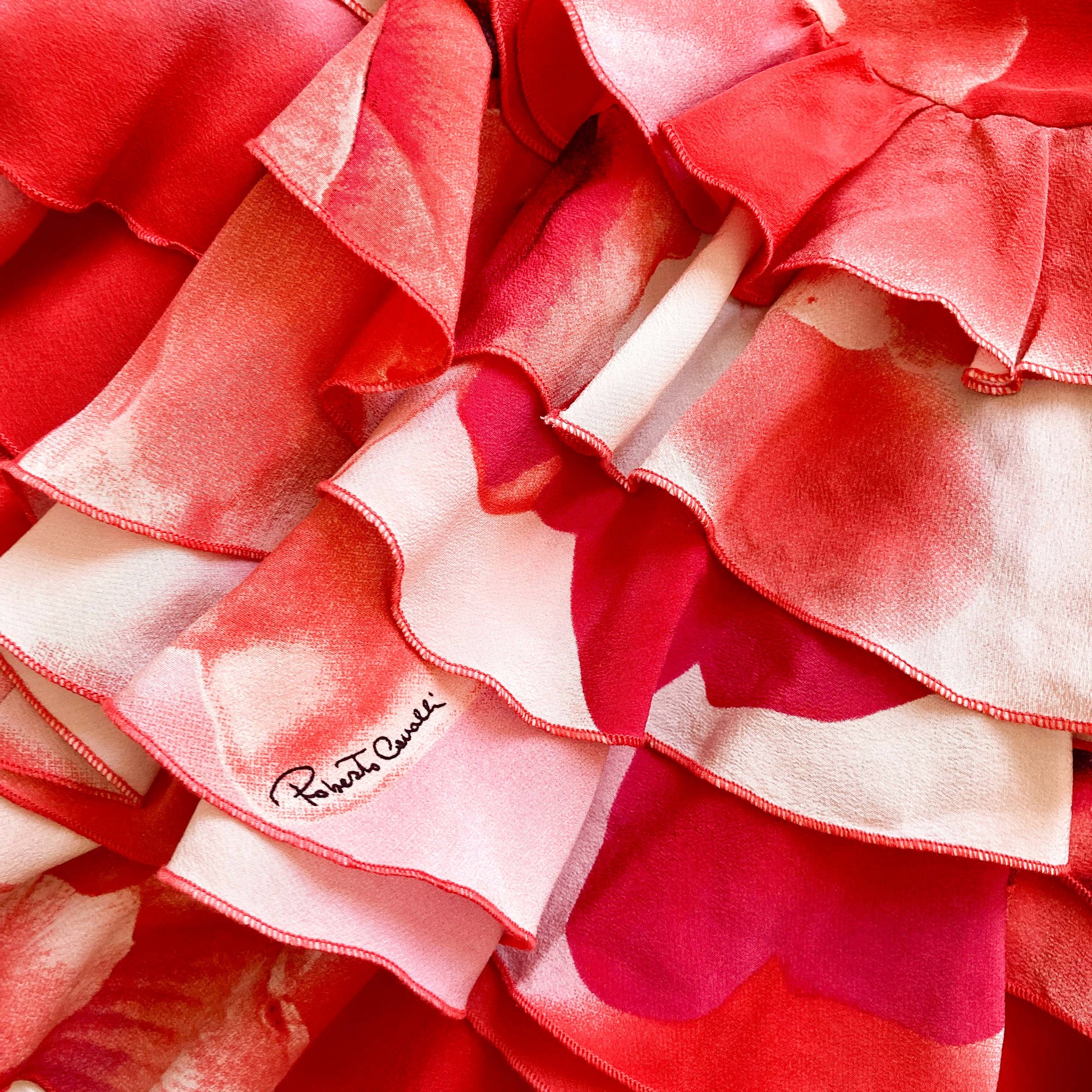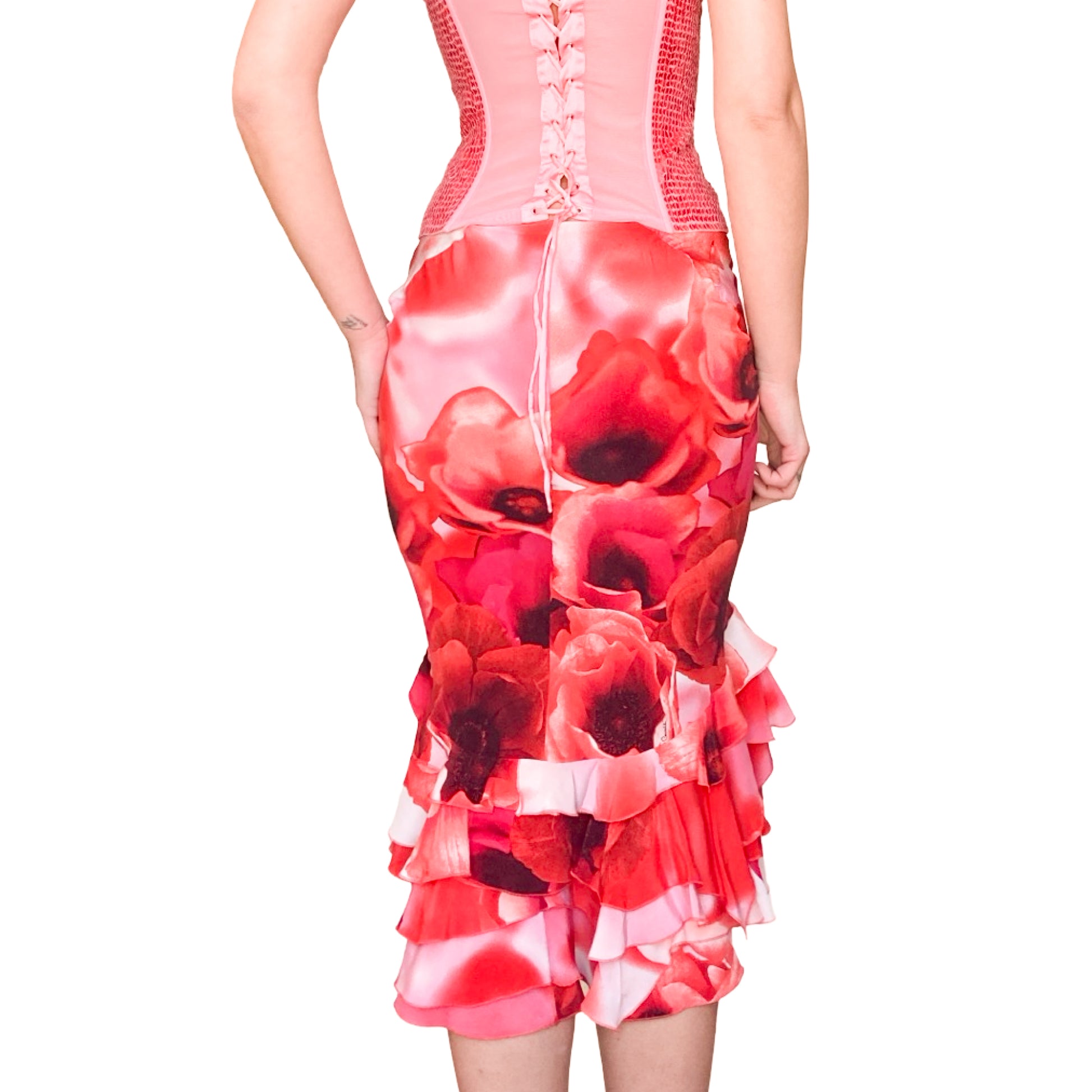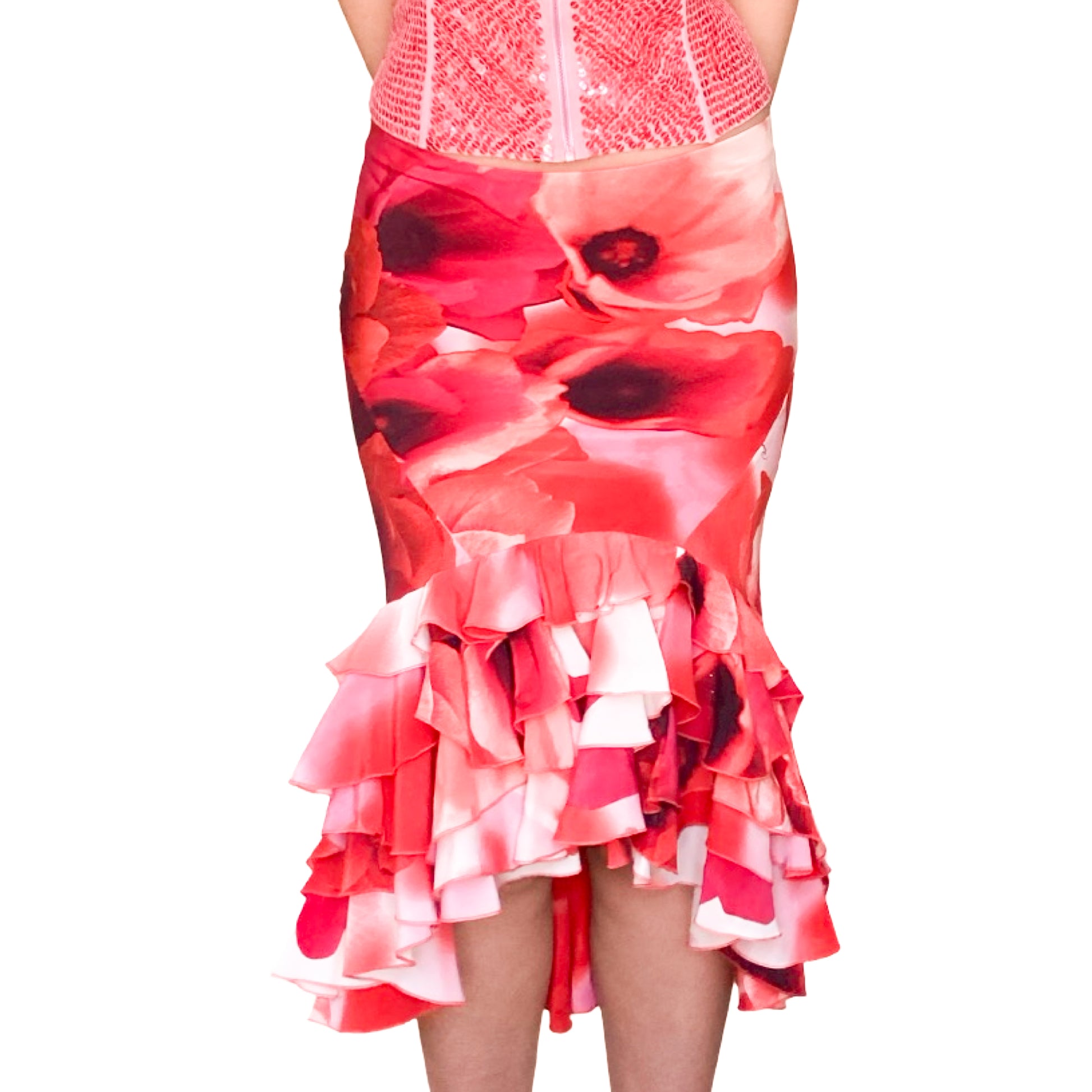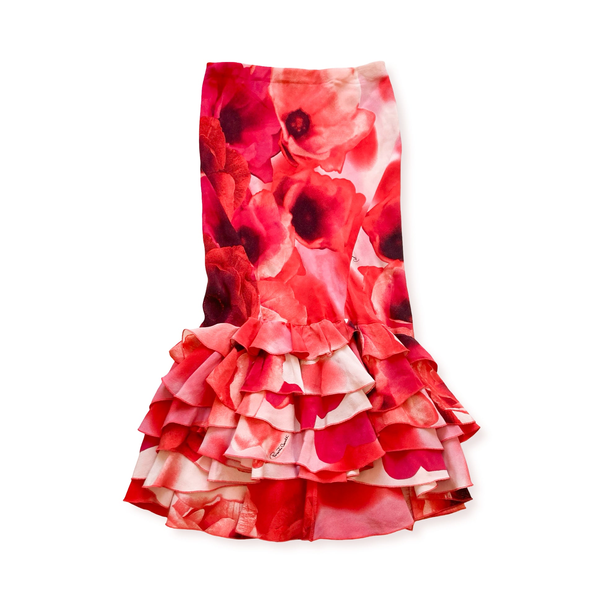 We are all in lo(u)ve with that rare print from the Spring Summer 2002 collection ! Silk versatile skirt/dress with an ultra-realistic poppy print. Layers of cascading ruffles and an asymmetrical hem give it drama. Can be worn high-waisted, low on the hips, or even as a strapless dress. Fabric signed with the Cavalli logo. Fully stretchy ! Print seen on the runway in another color.