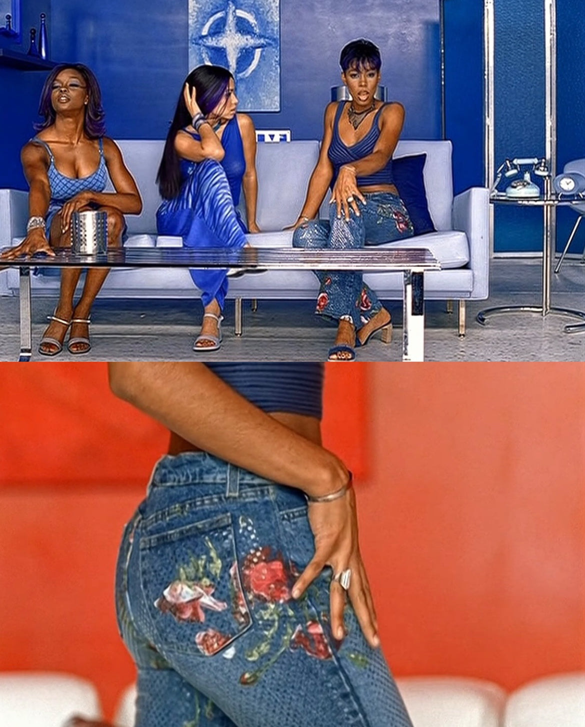 Hand Painted flowers jeans, & squared fish scales to catch the light. All metal / buttons are branded Roberto Cavalli. straight low cut with a little flare. Similar pants seen on advertising the Vogue Italia (oct 1999) AD : Curtesy of ScannedFashionWorld.com