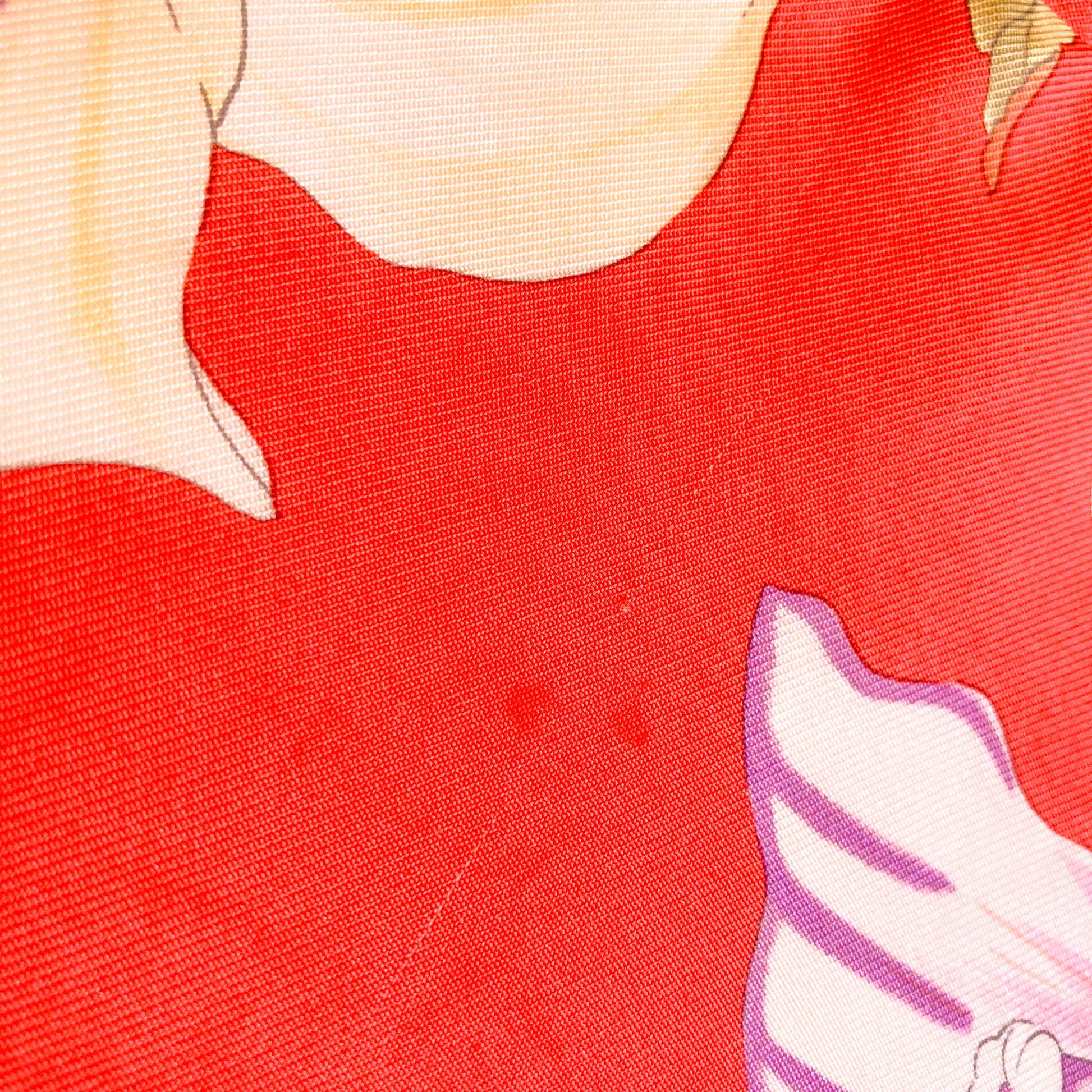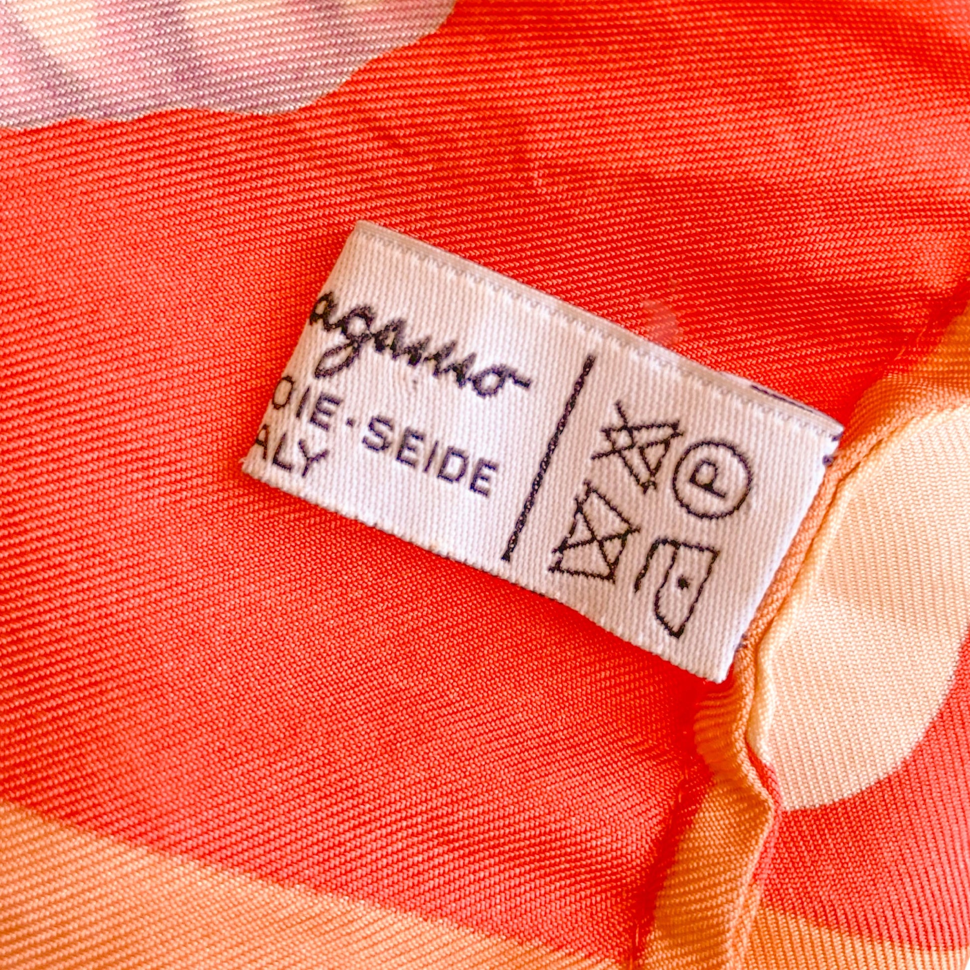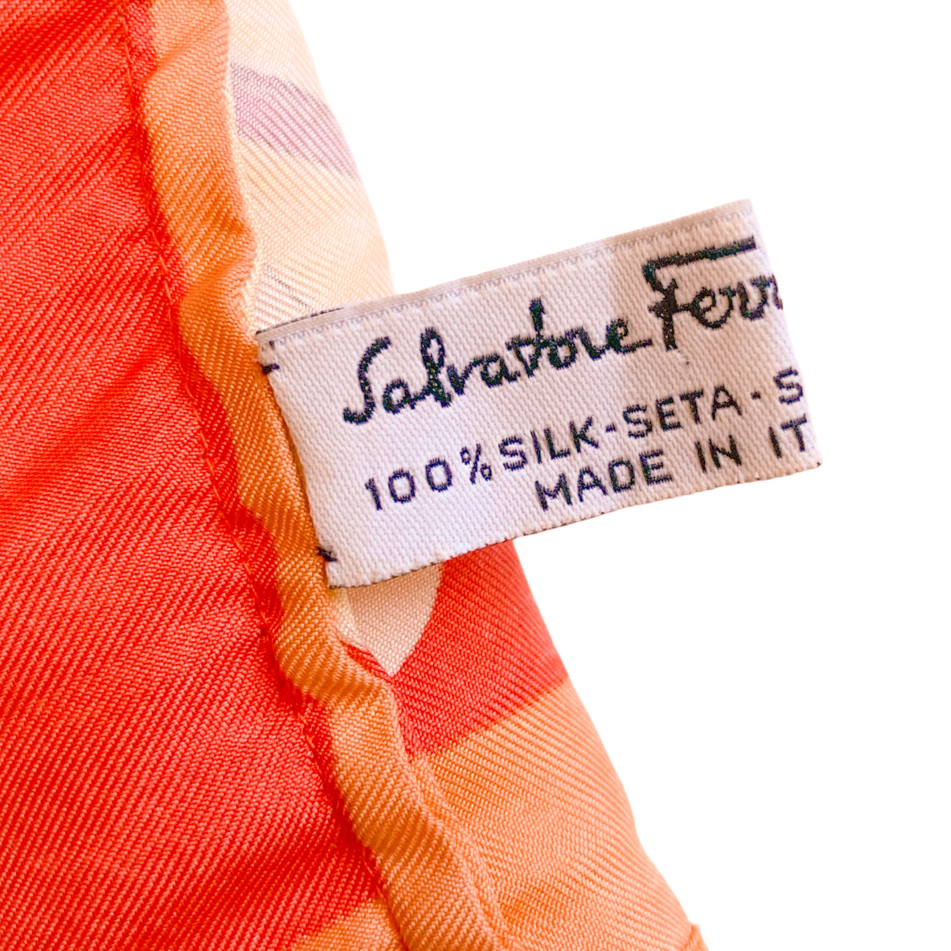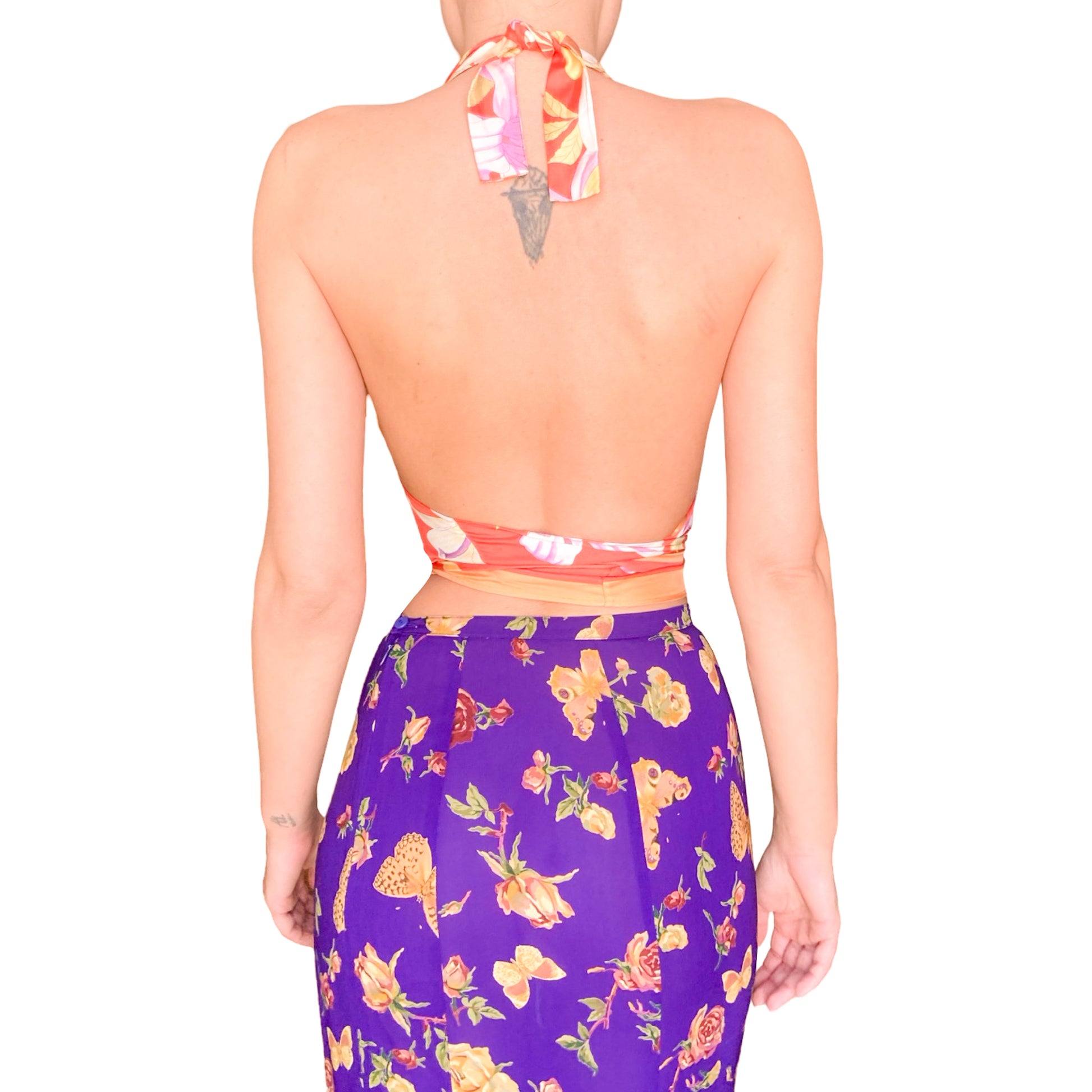 This vintage Salvatore Ferragamo halter top showcases a vibrant lilies print on fine orange silk. Designed with versatility in mind, it can be wrapped and tied either at the front or back, offering different styling options. This is deep V-neckline and open-back cut & there is a signature Ferragamo logo on front. This top became famous because it was worn by Elsa Hosk in another color.