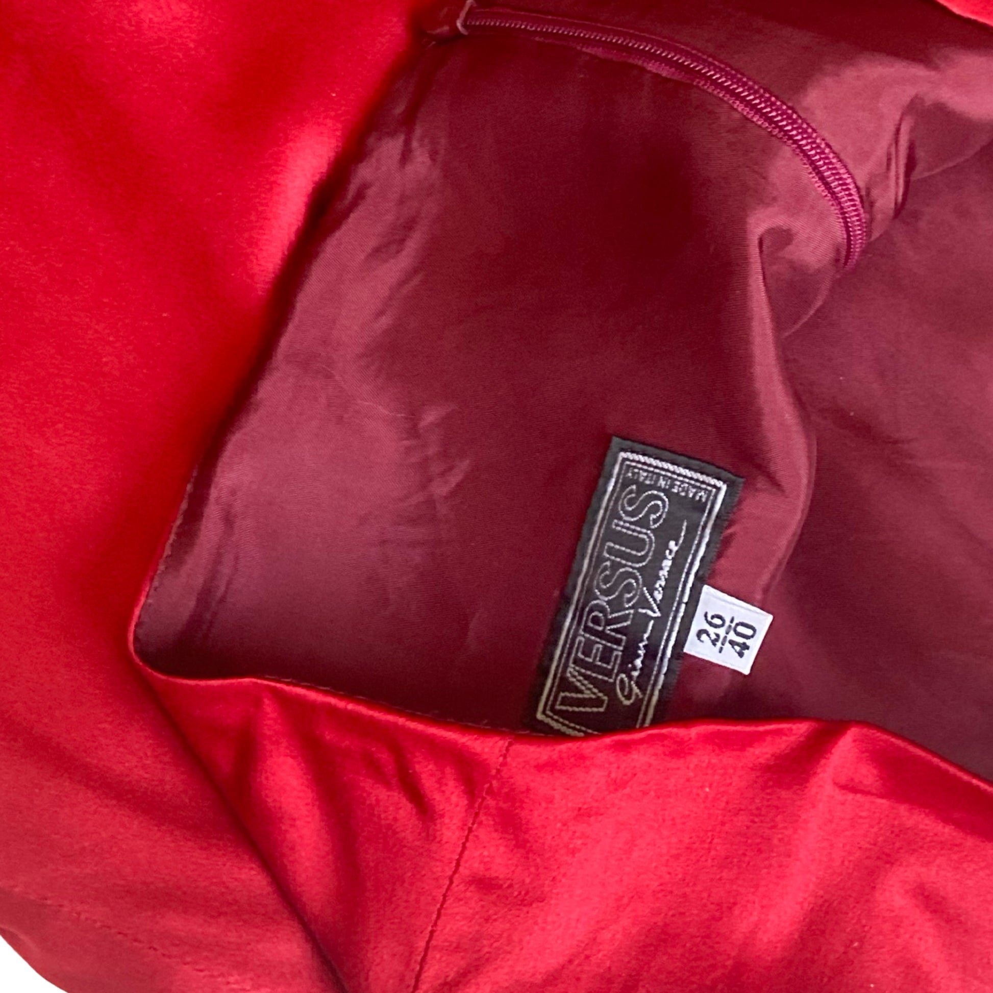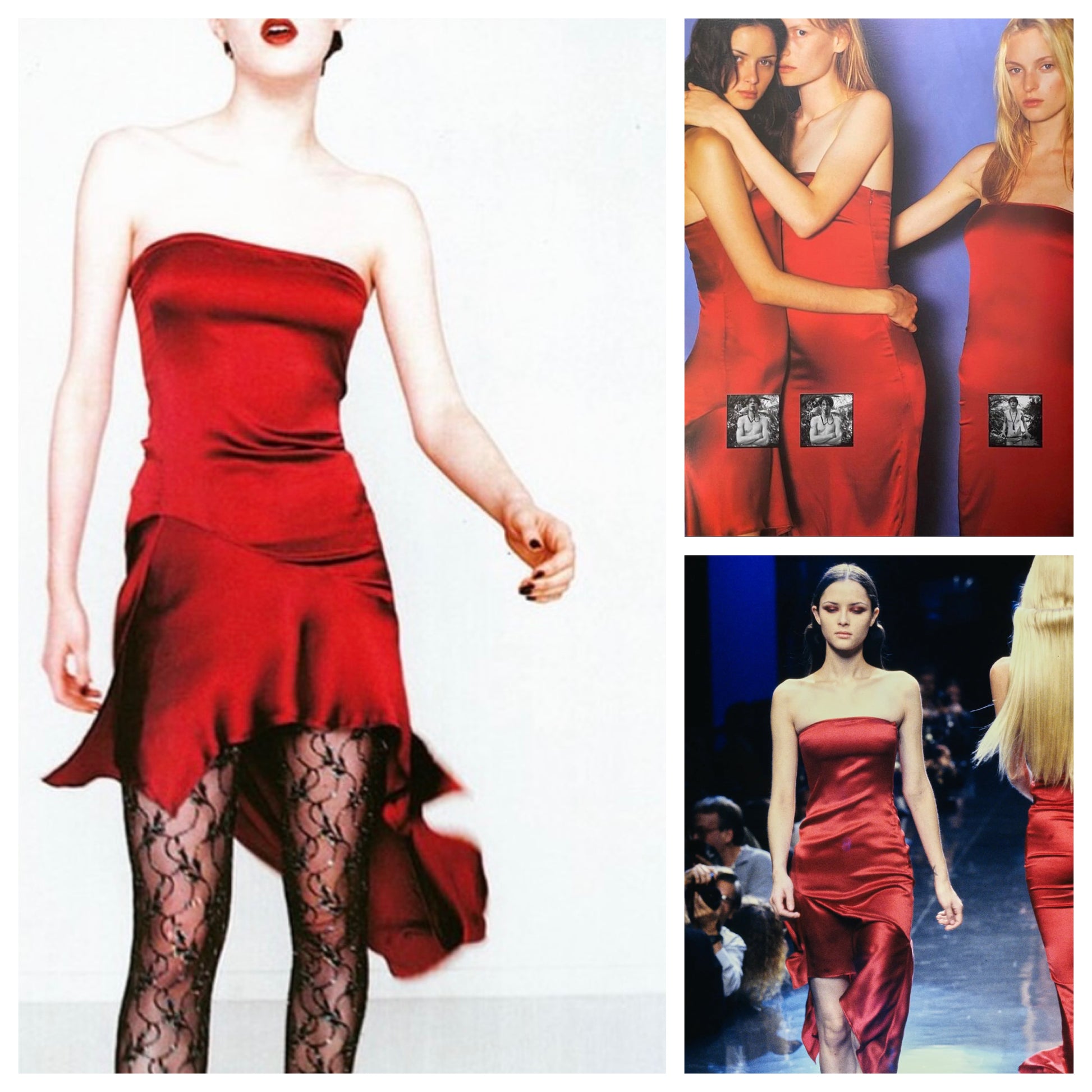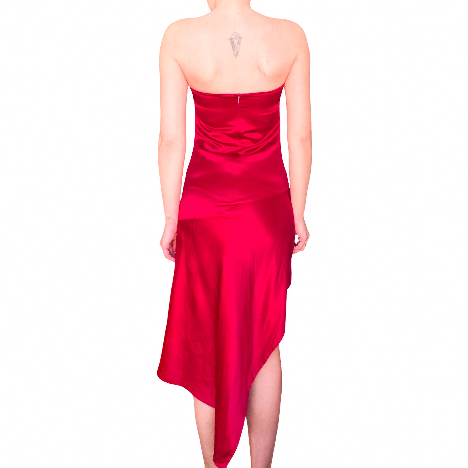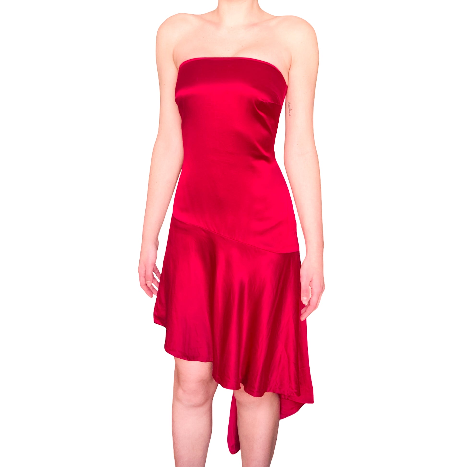 This strapless bias-cut dress from the Versus - Gianni Versace Spring 1997 collection embodies minimalist perfection. Crafted from heavy satin silk, she boasts a luxurious drape and a dangerous red color that exudes confidence. She has an asymmetrical hemline & a back zipper ensures a seamless silhouette. Fully lined. As featured in runway shows, campaigns, and editorials of the late '90s, this dress captures the essence of an era.