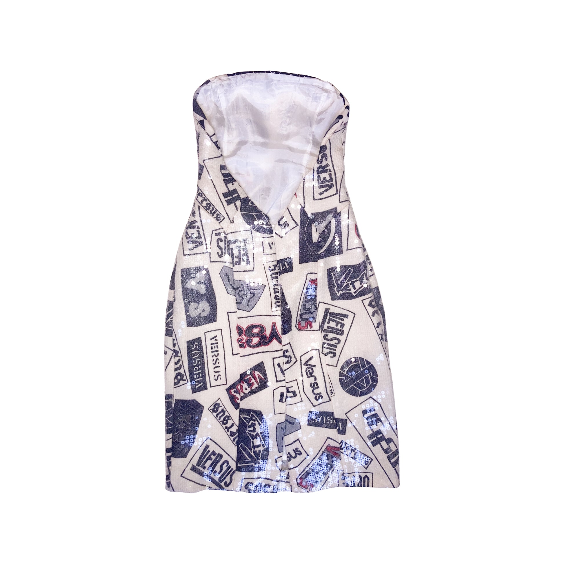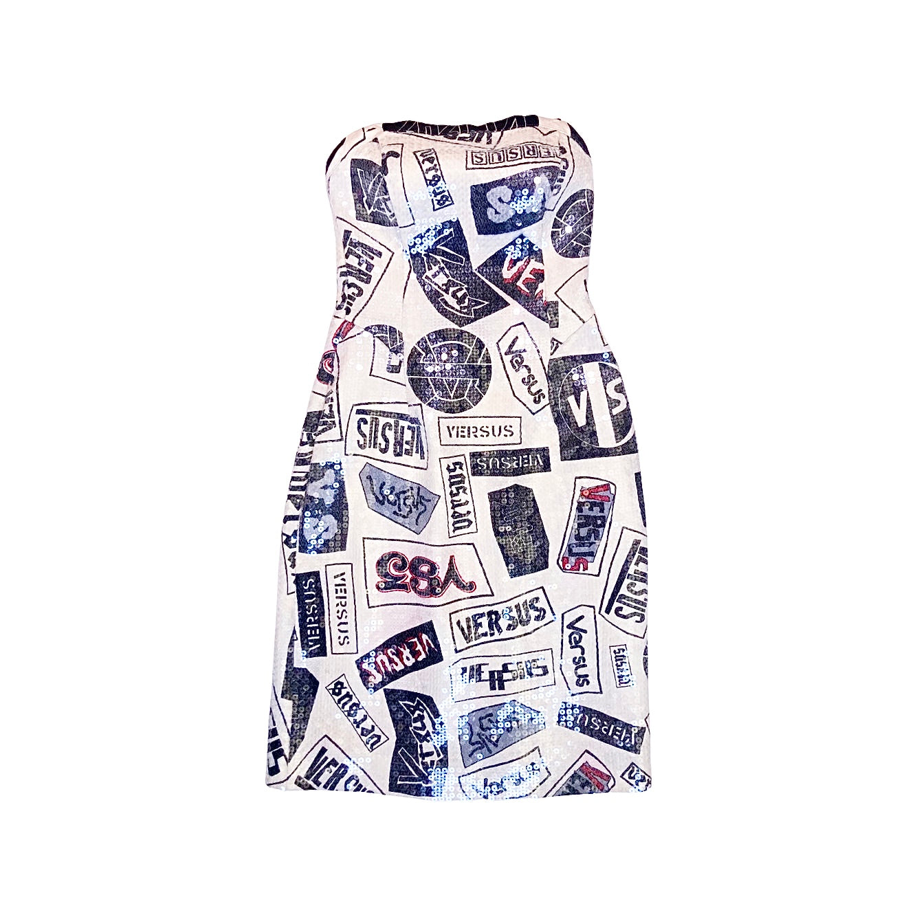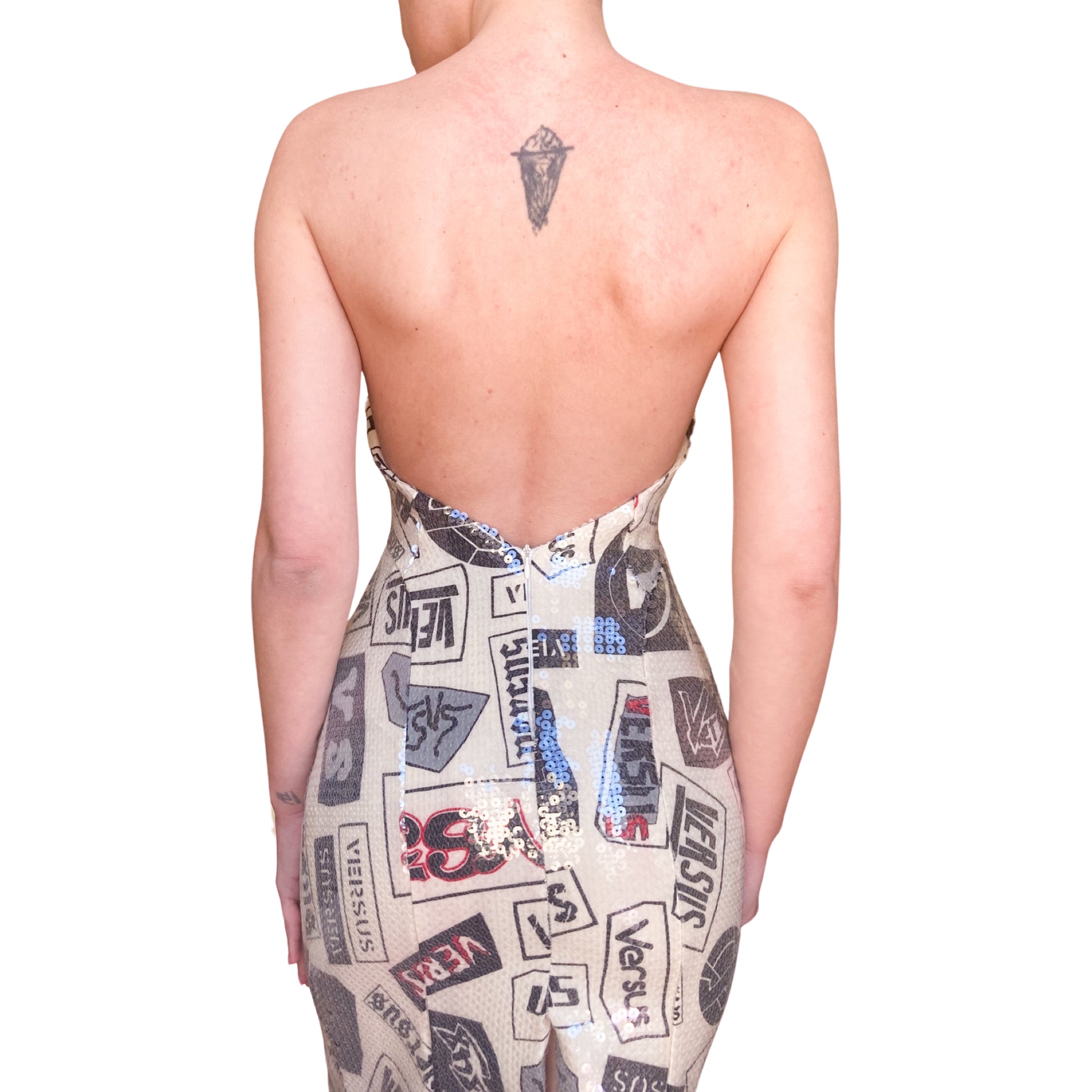 Super rare deep bare back bustier dress from Versus (Versace) embellished with transparent sequins all over. She catch the light as hell !! Very Flattering cut. Print is a combination of different "Versus" Signatures. The rear has a slit to make it easy to walk in, a zip-closure, and a sultry open back. Very Hard to come by.