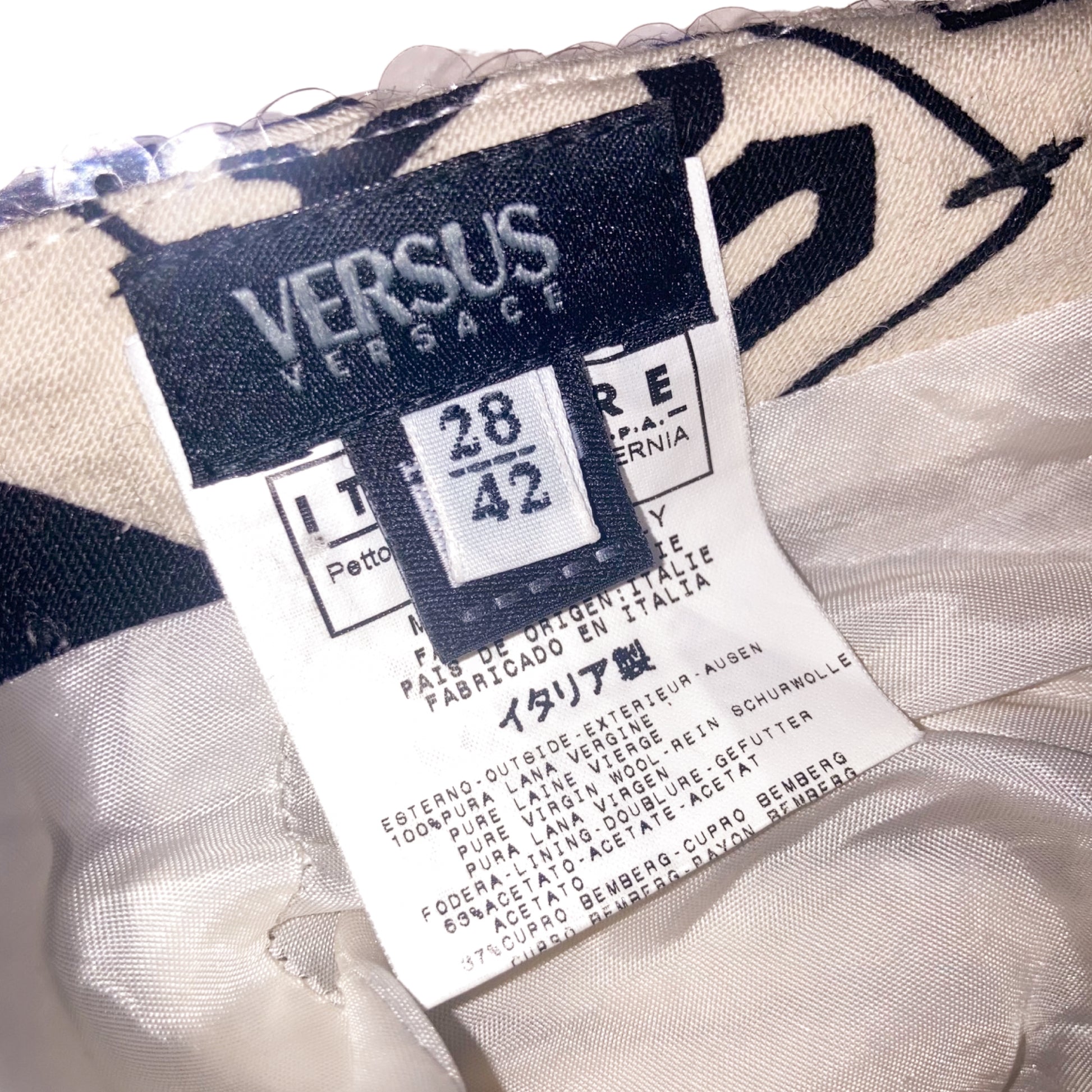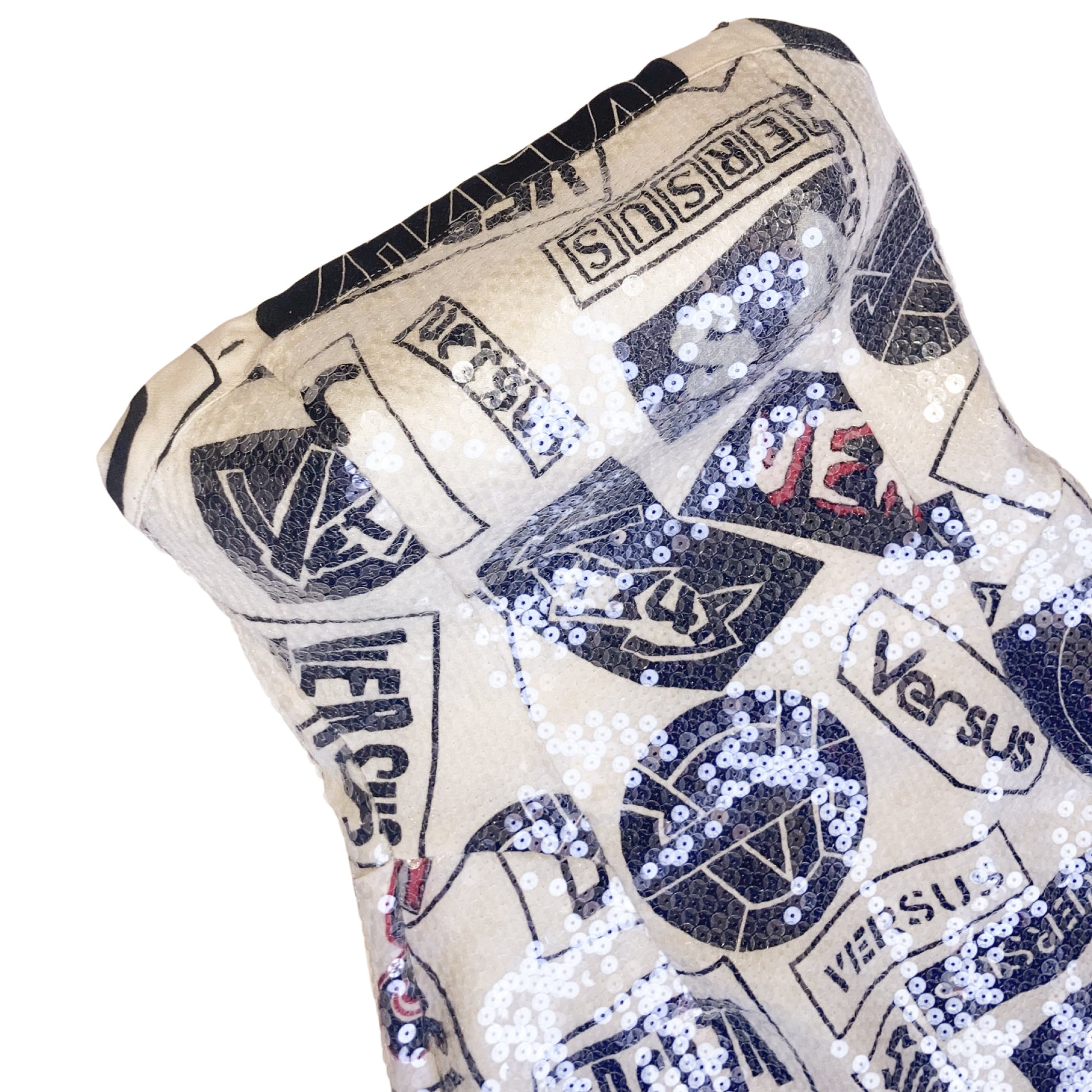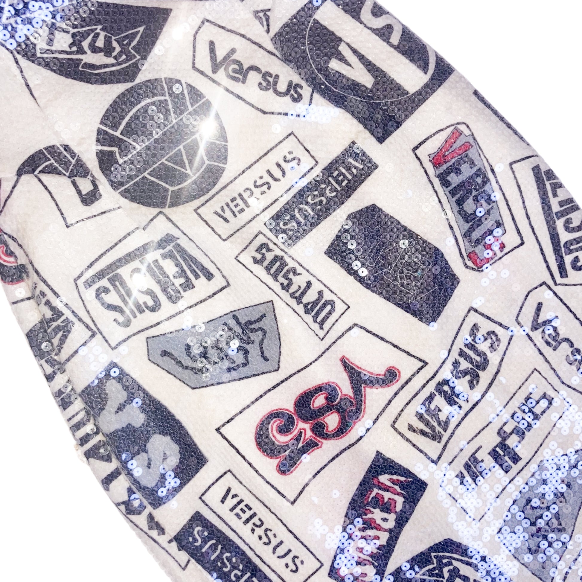 Super rare deep bare back bustier dress from Versus (Versace) embellished with transparent sequins all over. She catch the light as hell !! Very Flattering cut. Print is a combination of different "Versus" Signatures. The rear has a slit to make it easy to walk in, a zip-closure, and a sultry open back. Very Hard to come by.