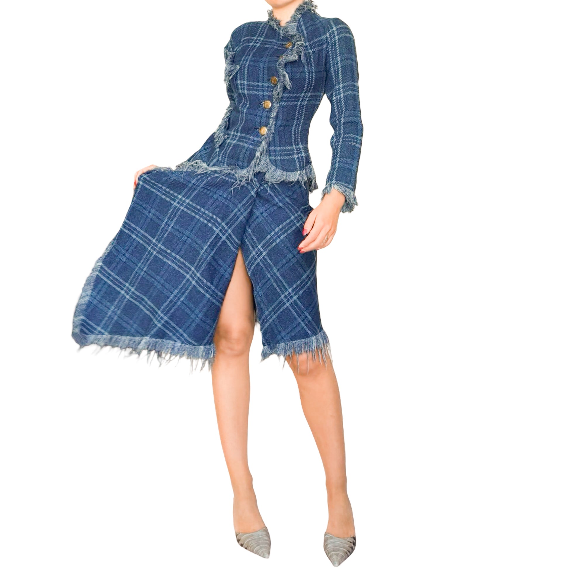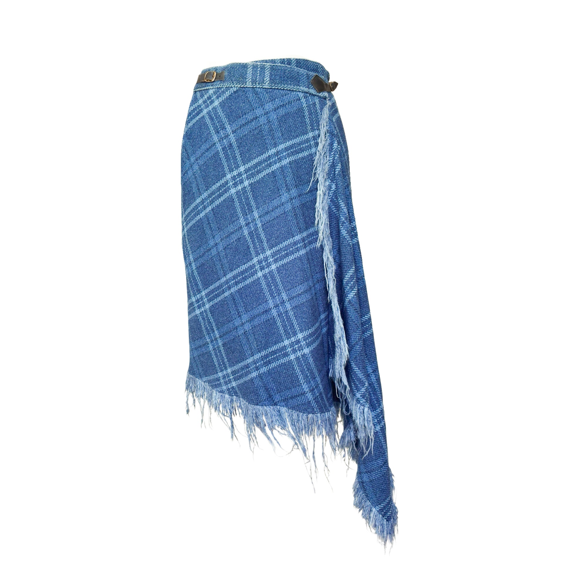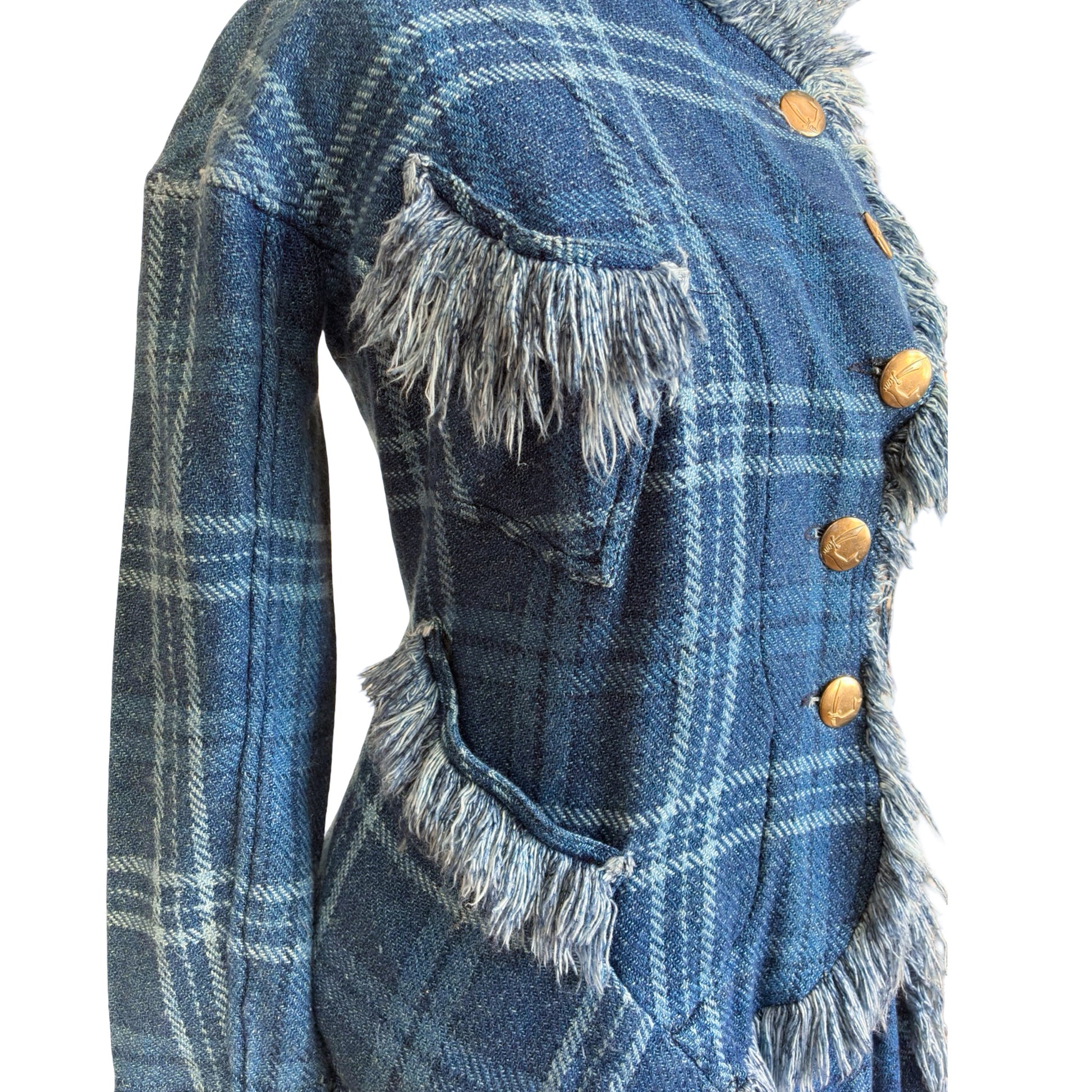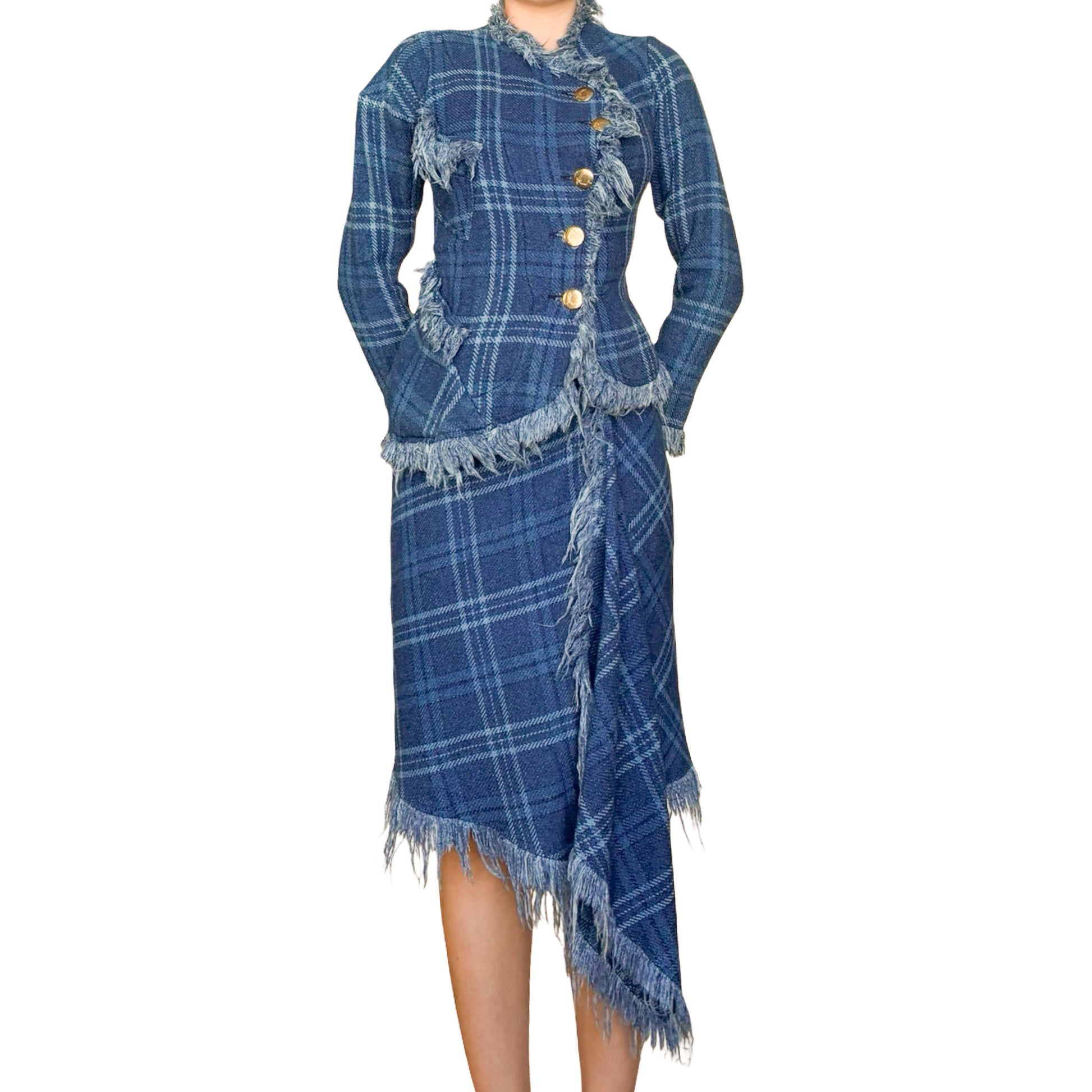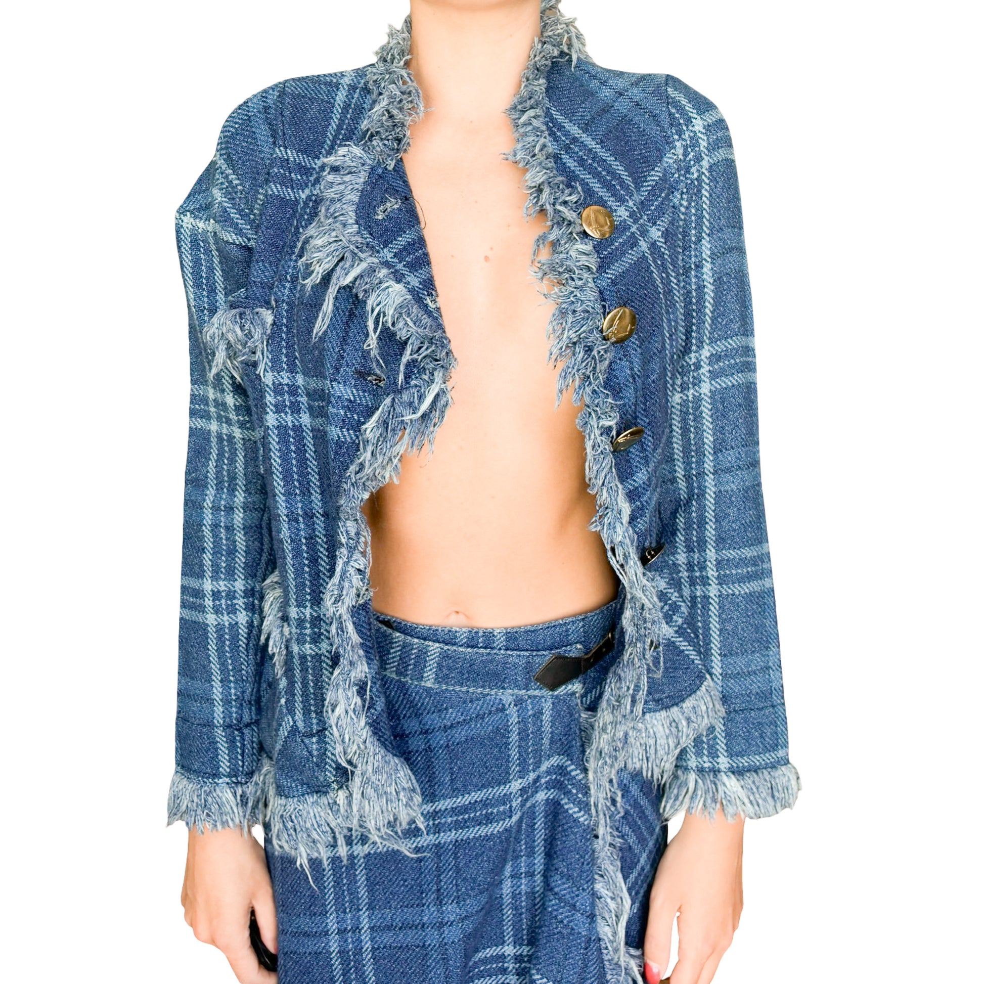 Cut from the signature denim-tartan of the Spring 1998 "Tied to the Mast" collection, this set carries all the codes of Westwood’s deconstructed tailoring. The jacket is sharply contoured with curved paneling, bias cut, raw fringed edges and gleaming pirate gold sabre buttons that echo the season’s swashbuckling mood. The wrap skirt is secured with the original leather side straps and falls in an asymmetric, deliberately undone drape, mirroring the collection’s rebellious construction. A rare runway two-piece capturing the exact spirit of Westwood’s late-90s, seen on the campaign & runway.