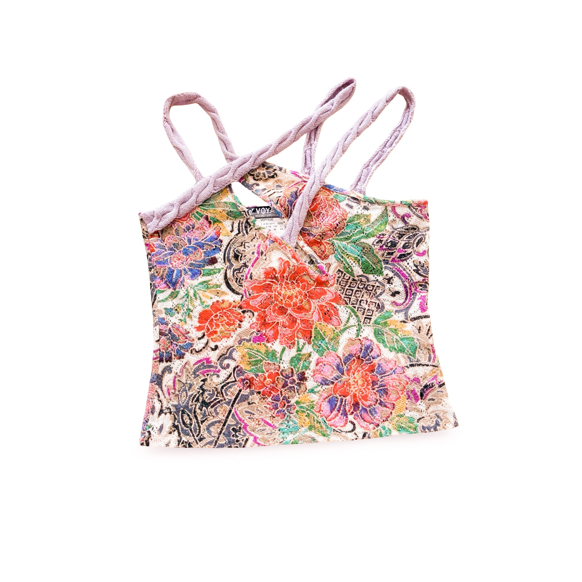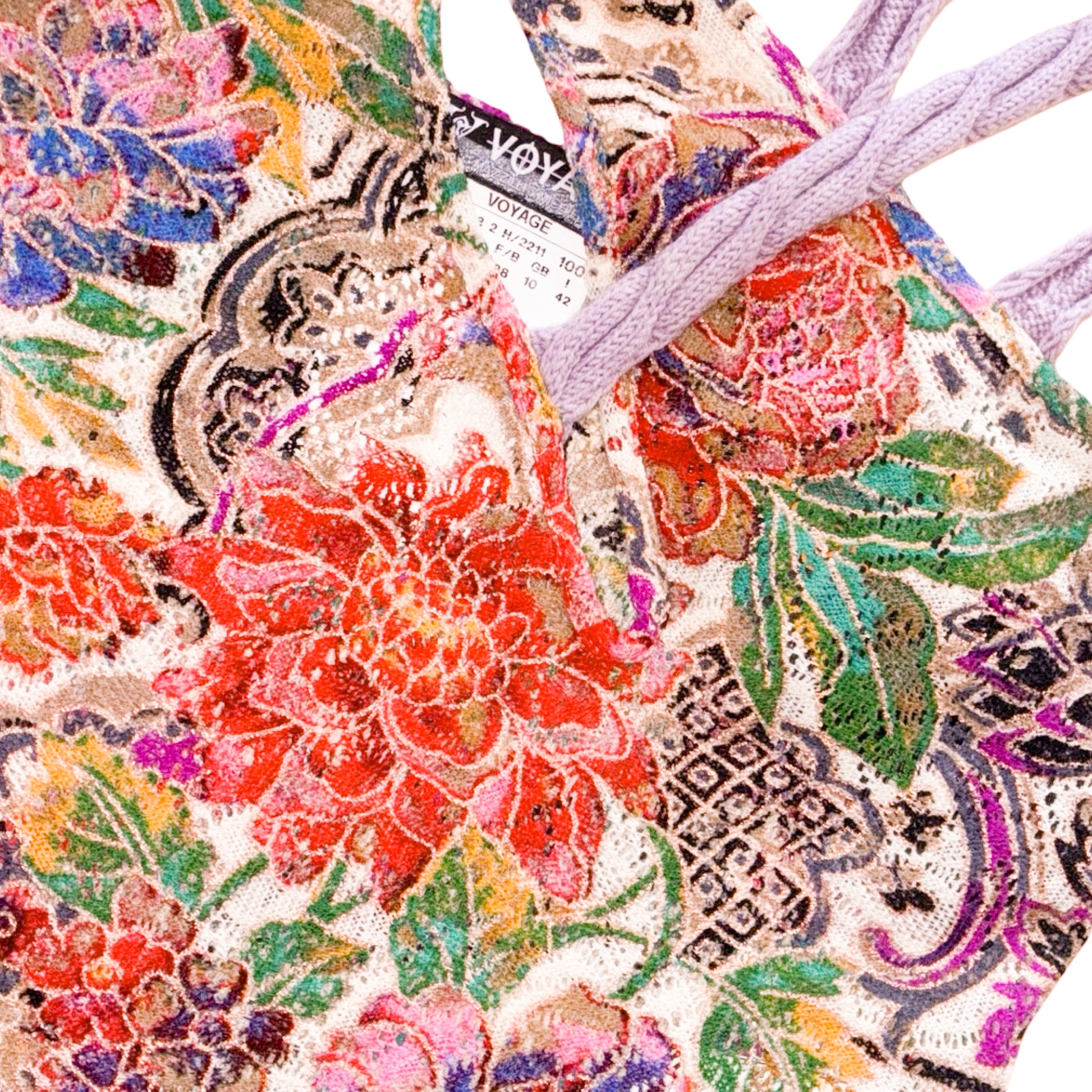 Extraordinary runway top from Voyage Fall 2003, crafted in soft wool with a highly complex knit technique forming intricate multicolor floral motifs. The design features lilac braided straps crossing at the chest, creating bold cut-outs and an asymmetrical neckline. A rare piece of exceptional craftsmanship and early 2000s avant-garde knitwear.