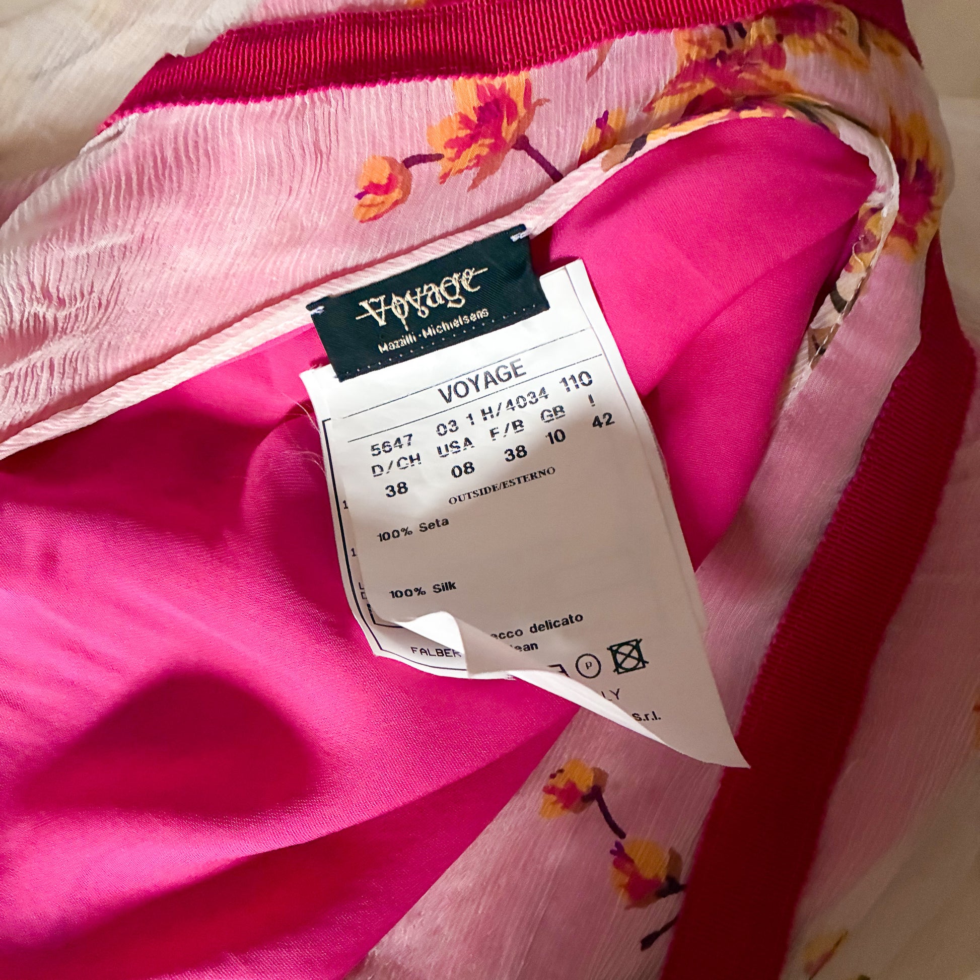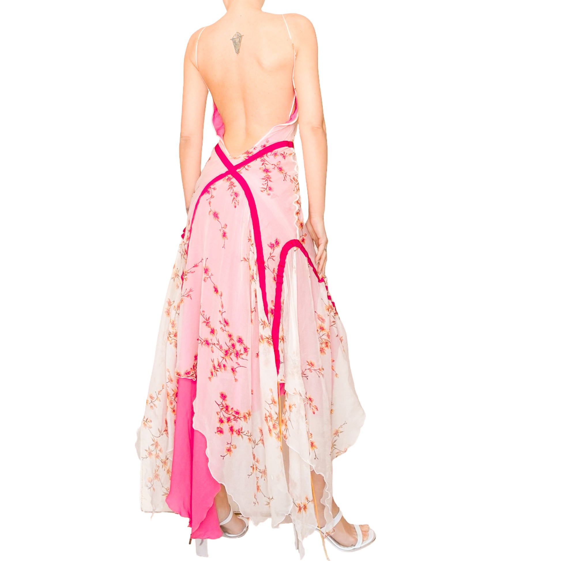 Crafted from 100% petal-pink silk chiffon featuring a delicate cherry blossom motif, this iconic Spring 2003 runway piece from Voyage by Tiziano Mazzilli and Louise Michielsens embodies the brand’s bohemian romanticism through its intricate fuchsia grosgrain ribbon latticework and hand-finished textures. The silhouette features delicate spaghetti straps and a deep low open back, cascading into an asymmetrical, multi-layered handkerchief hemline that reveals a vibrant magenta lining. Functional yellow drawstrings allow you to artfully adjust the drape and length, creating a personalized fit. Impossible to find, all Voyage Gems are extremely rare.